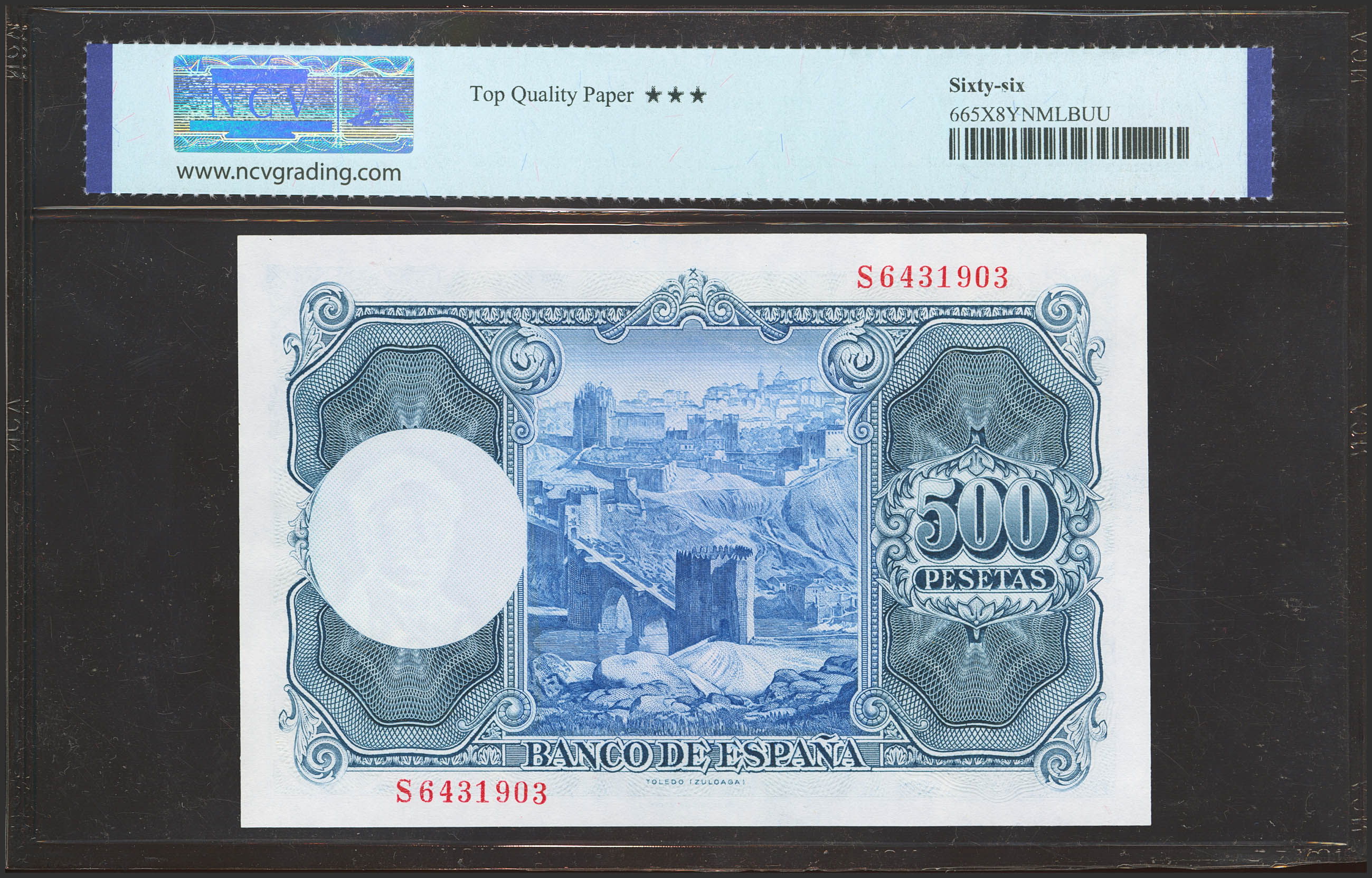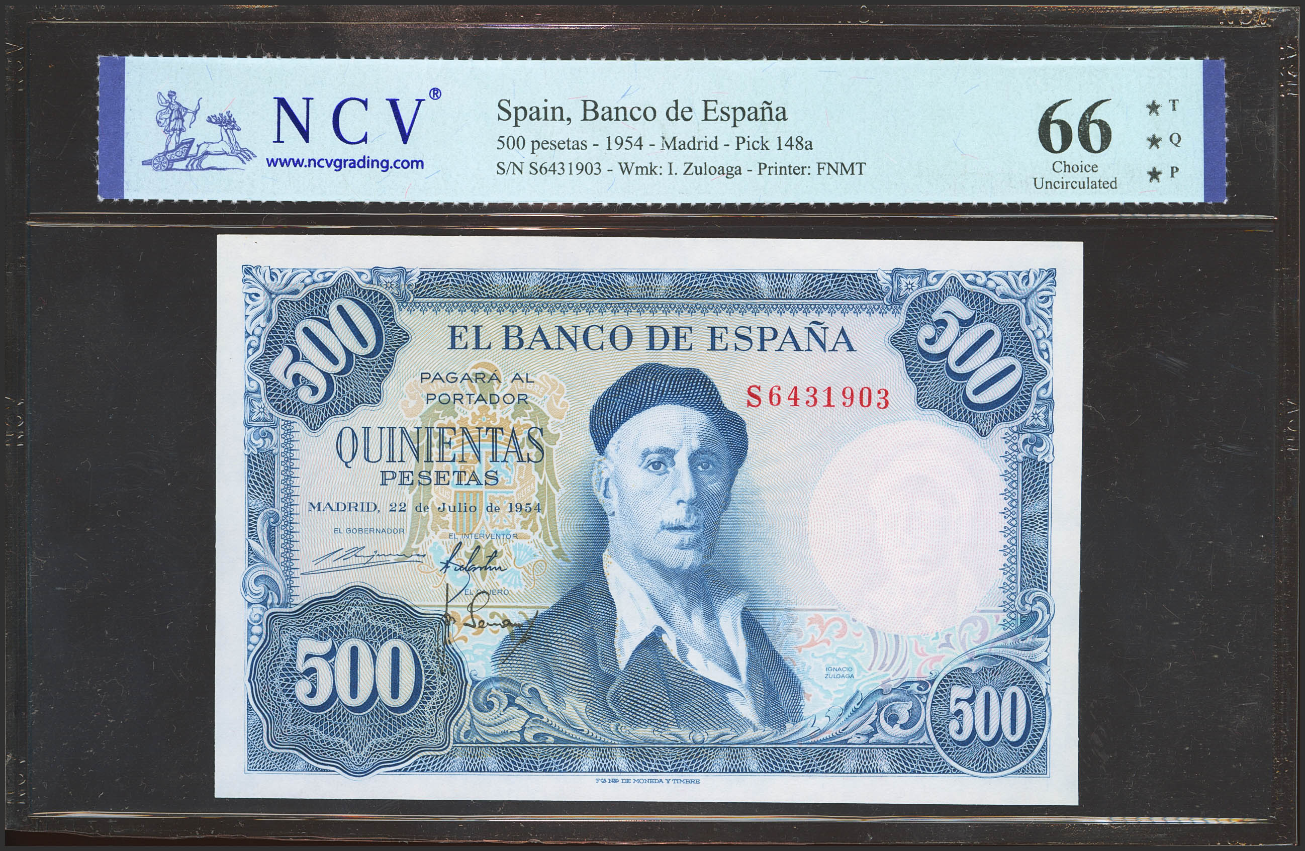 500 Pesetas. 22 de Julio de 1954. Serie S. (Edifil 2021: 468b, Pick: 148a). Raro en esta excepcional calidad, apresto original. SC. Encapsulado NCV66TQP.
