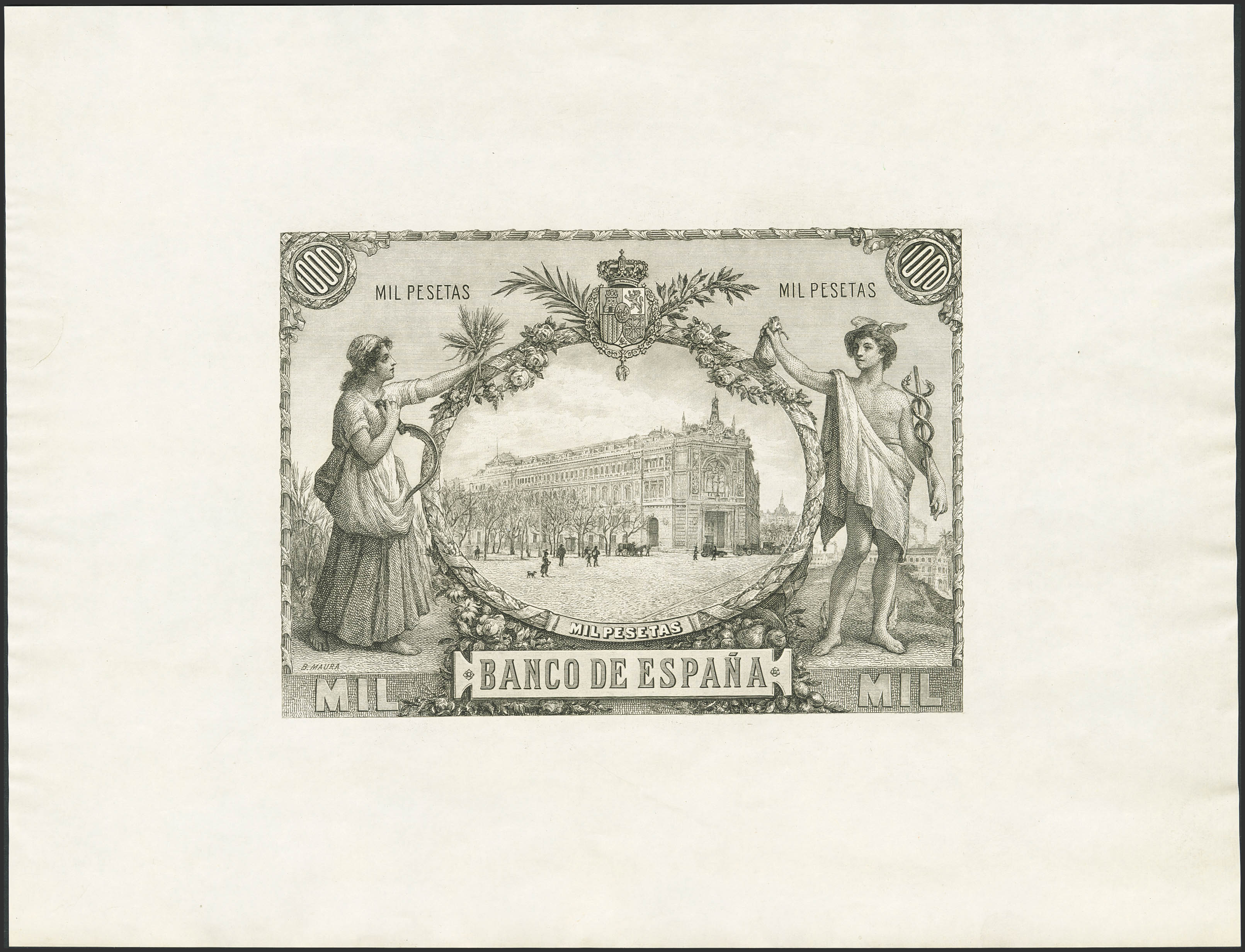 1000 Pesetas. 23 de Mayo de 1915. Prueba calcográfica de fondo de estado del reverso de un billete No Emitido. (Edifil 2023: NE17Pa). Extraoridnarimente rara. SC-.