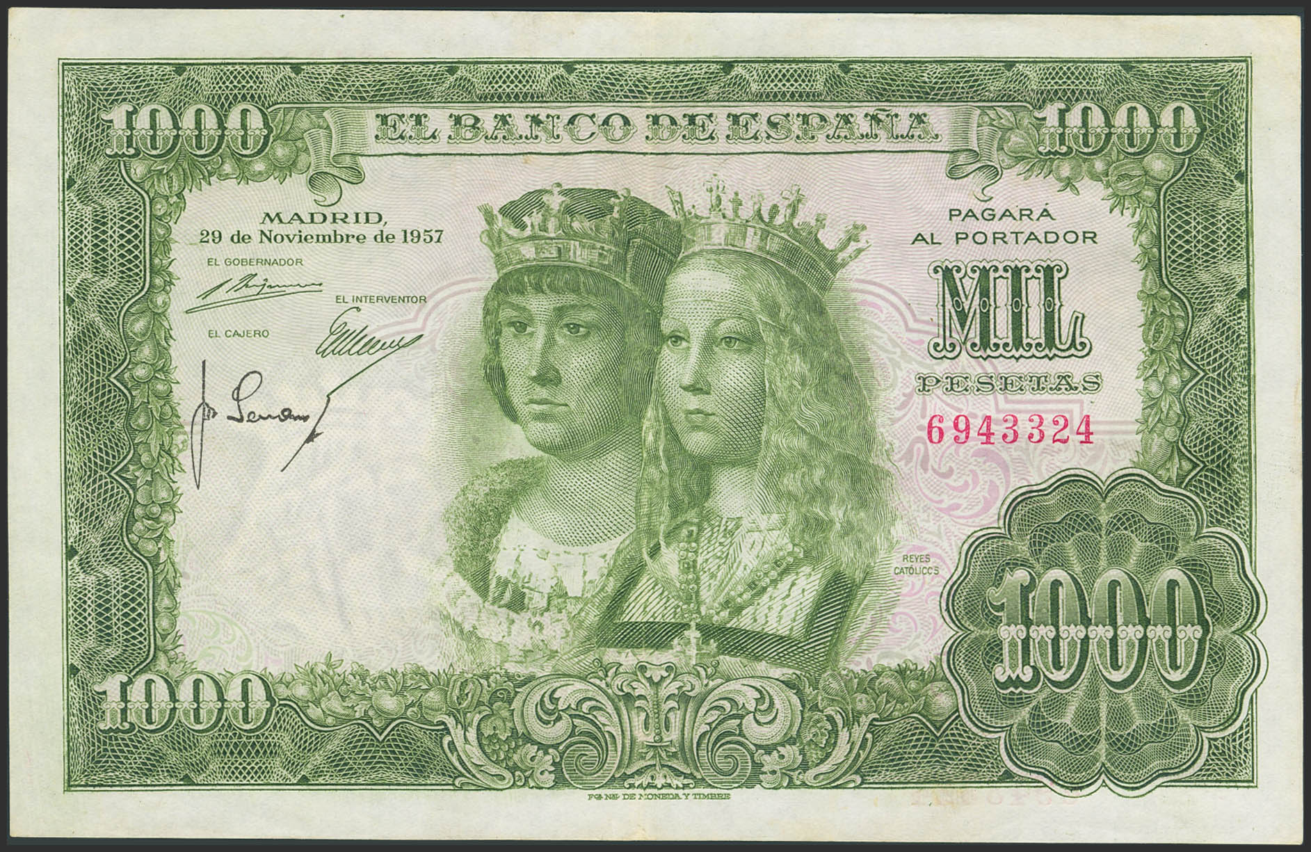 1000 Pesetas. 29 de Noviembre de 1957. Sin serie. (Edifil 2023: 469). Inusual, conserva parte de su apresto original. EBC-.