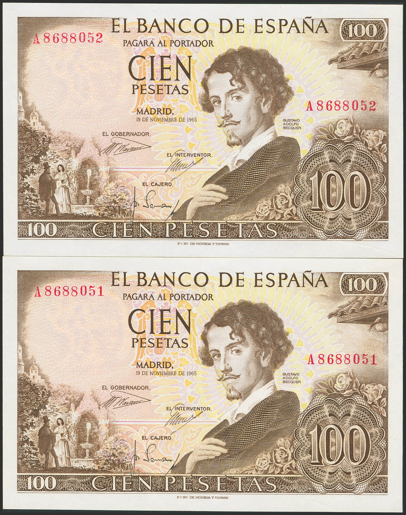 100 Pesetas. 19 de Noviembre de 1965. Pareja correlativa. Serie A. (Edifil 2021: 470a). Conserva todo su apresto original. SC.