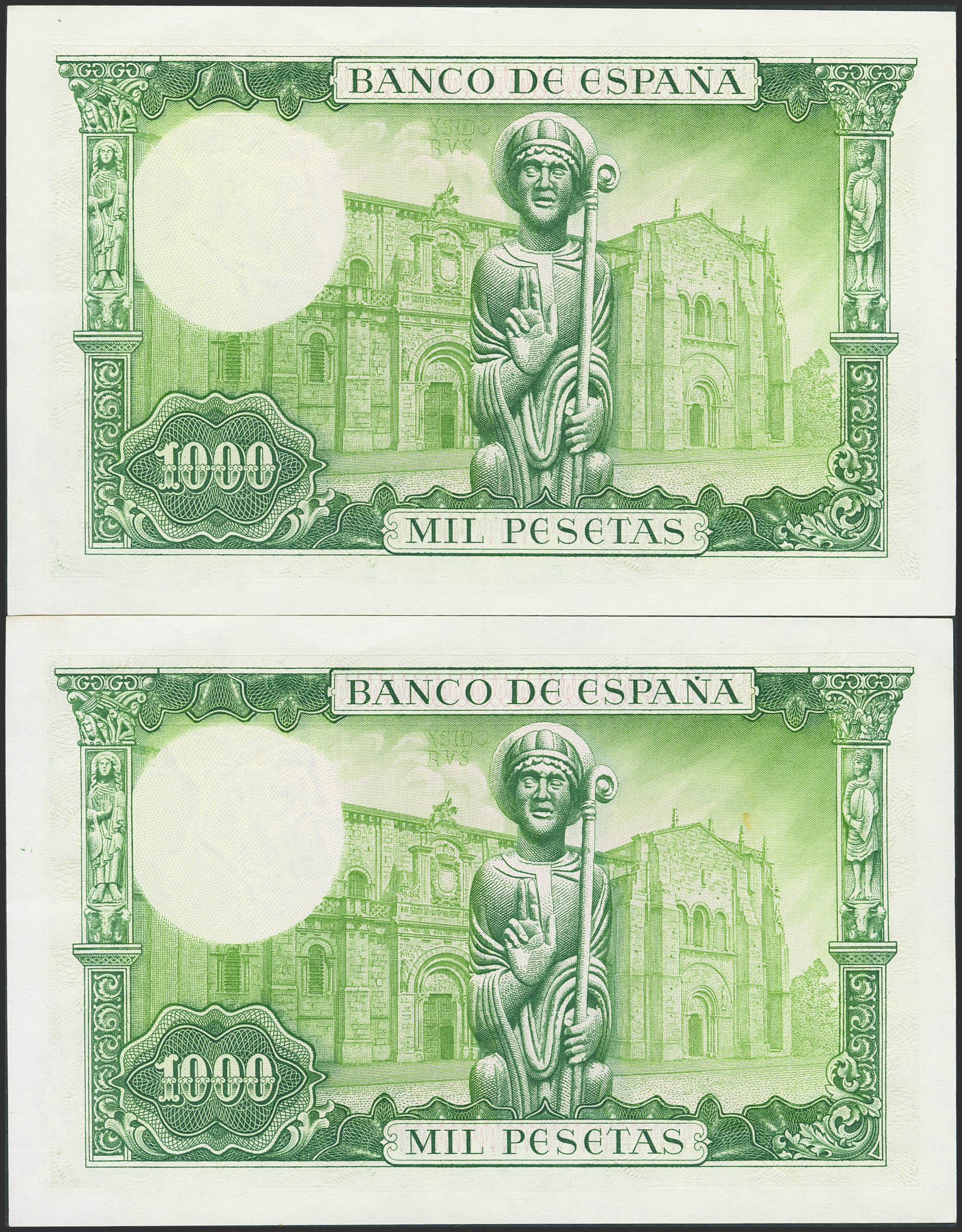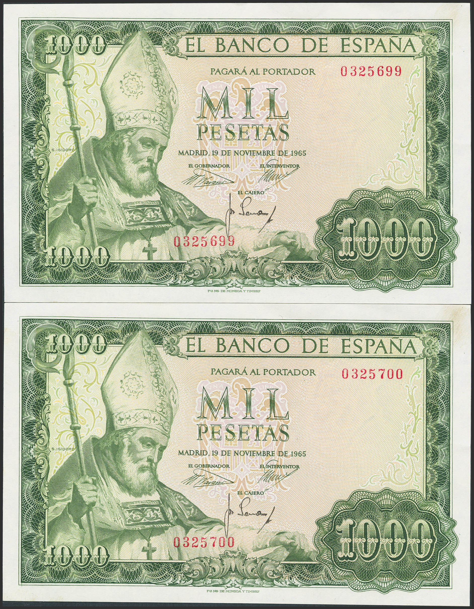 1000 Pesetas. 19 de Noviembre de 1965. Pareja correlativa. Sin serie. (Edifil 2023: 471, Pick: 151). Muy rara pareja, apresto original. SC-.