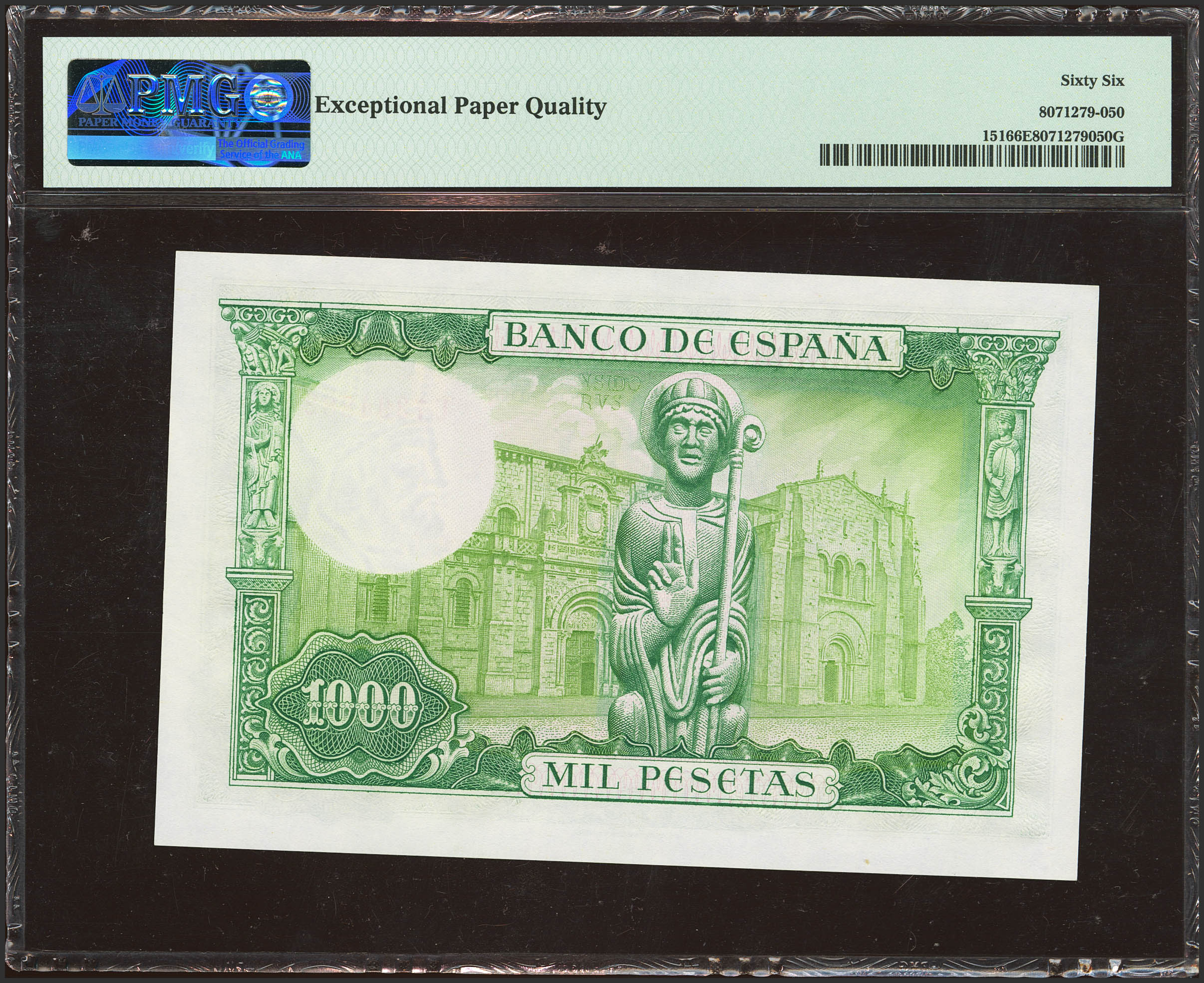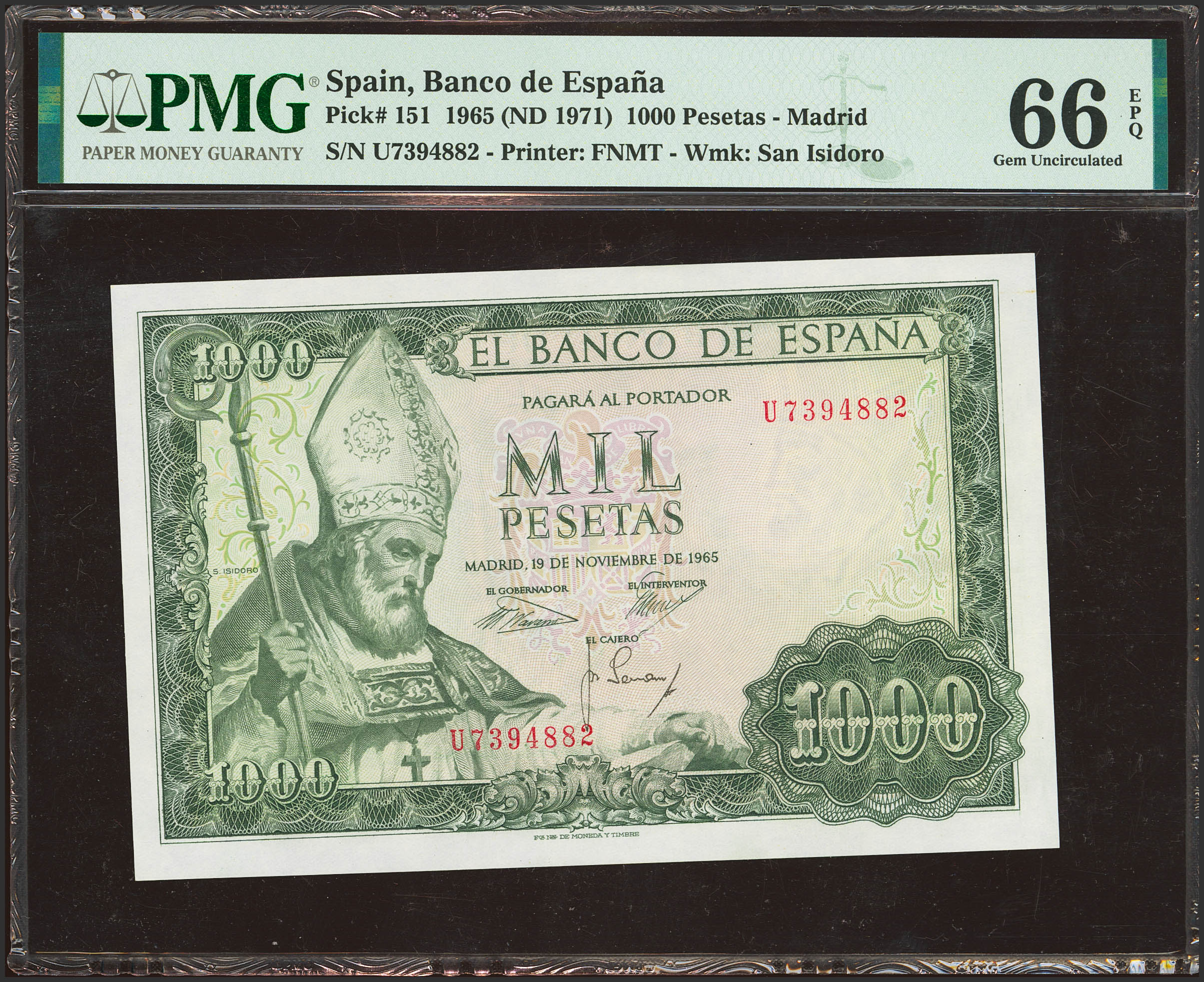 1000 Pesetas. 19 de Noviembre de 1965. Serie U. (Edifil 2023: 471b, Pick: 151). Raro en esta excepcional calidad, apresto original. SC. Encapsulado PMG66EPQ.
