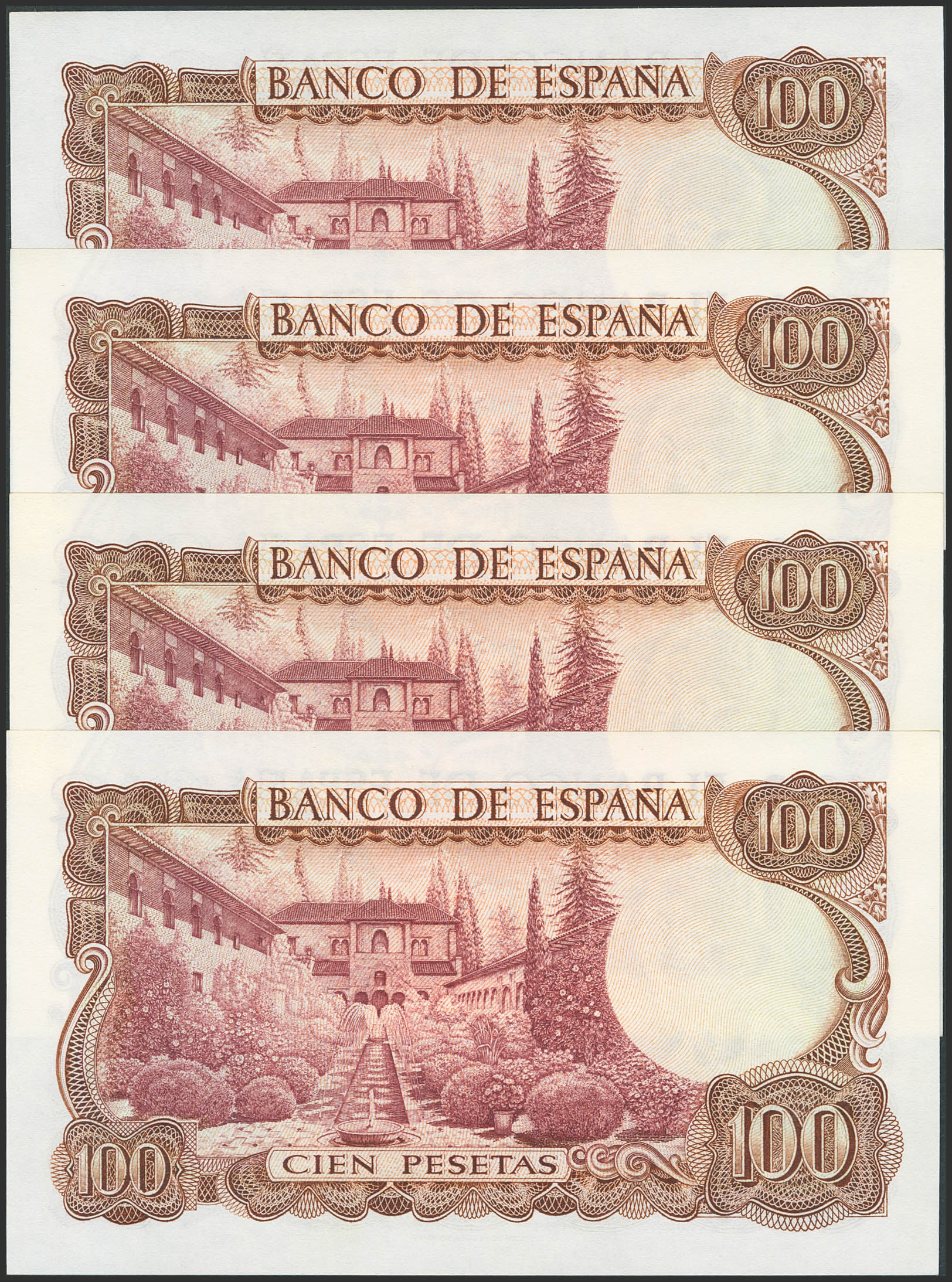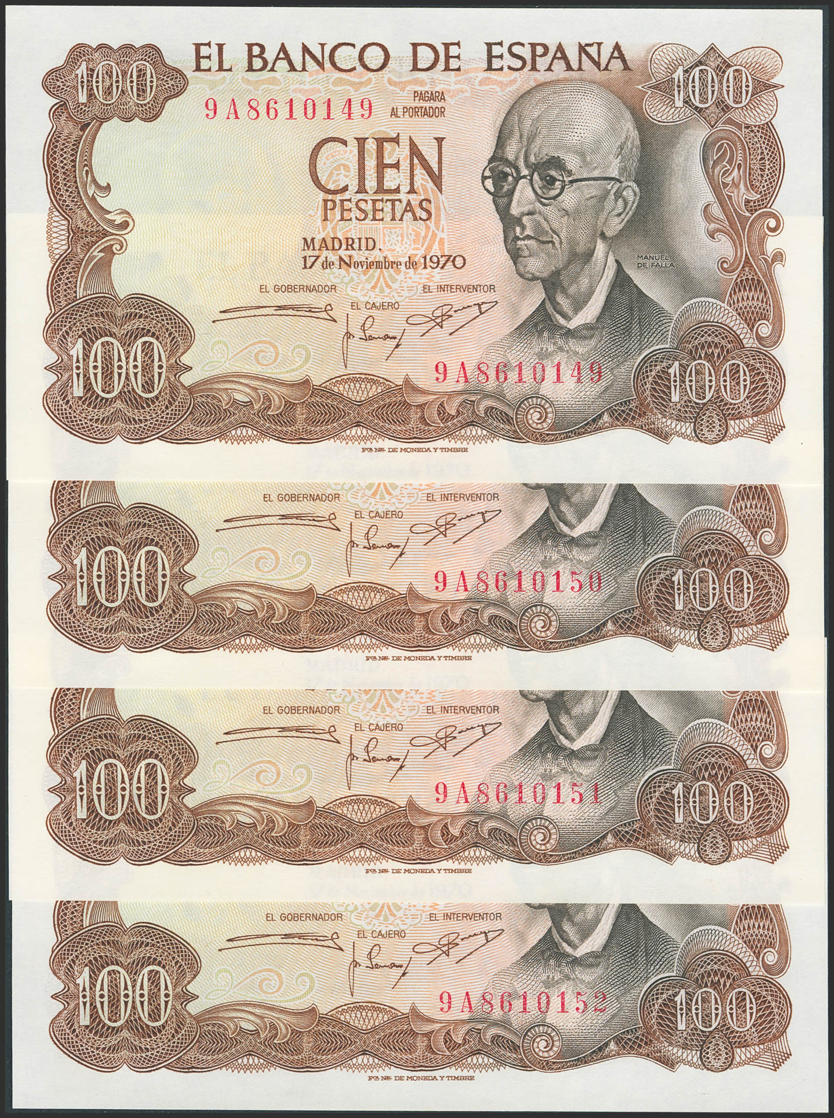 Conjunto de 4 billetes correlativos de 100 Pesetas emitidos el 17 de Noviembre de 1970 con la serie 9A, (Edifil 2023: 472d), conservando todo su apresto original. SC.