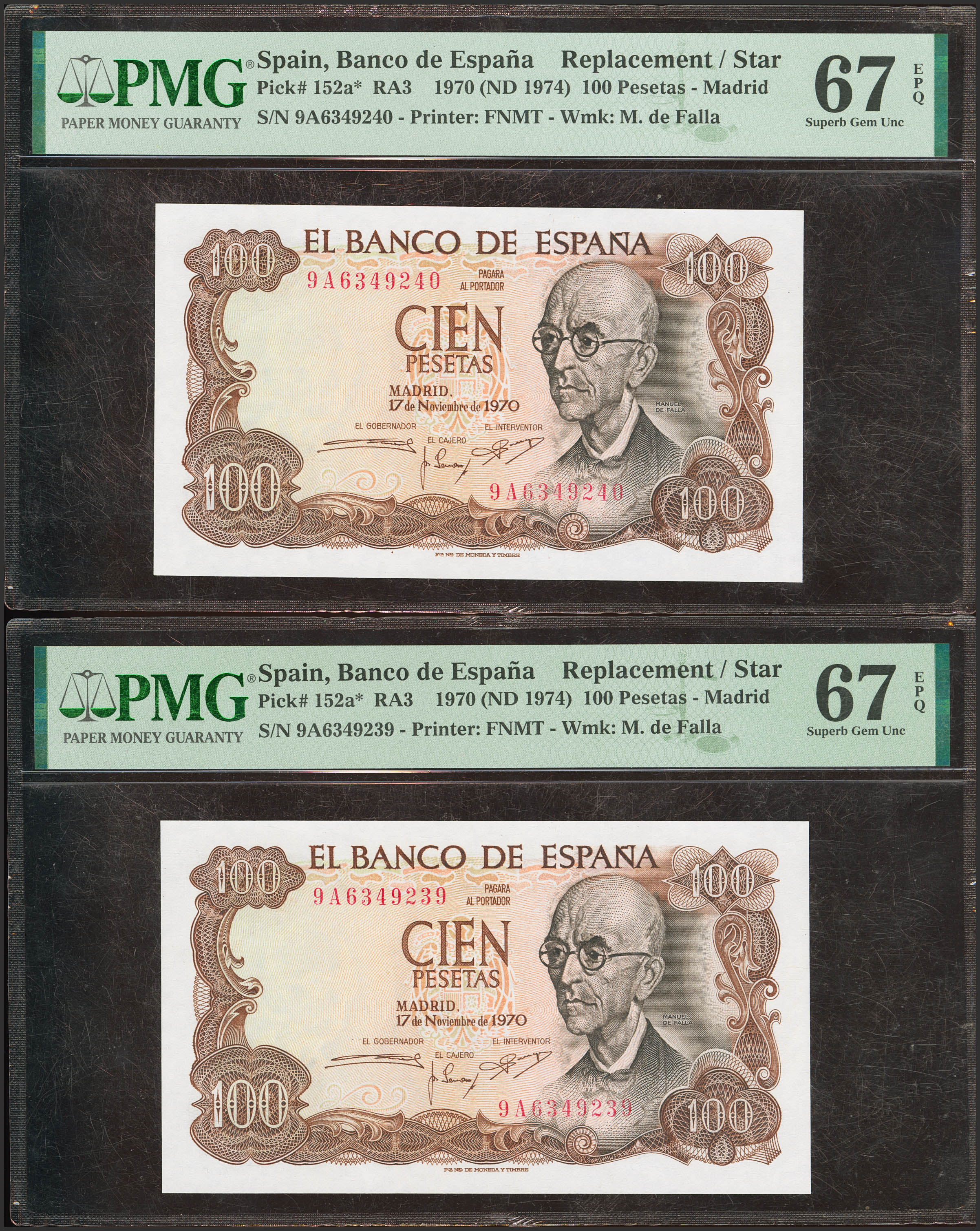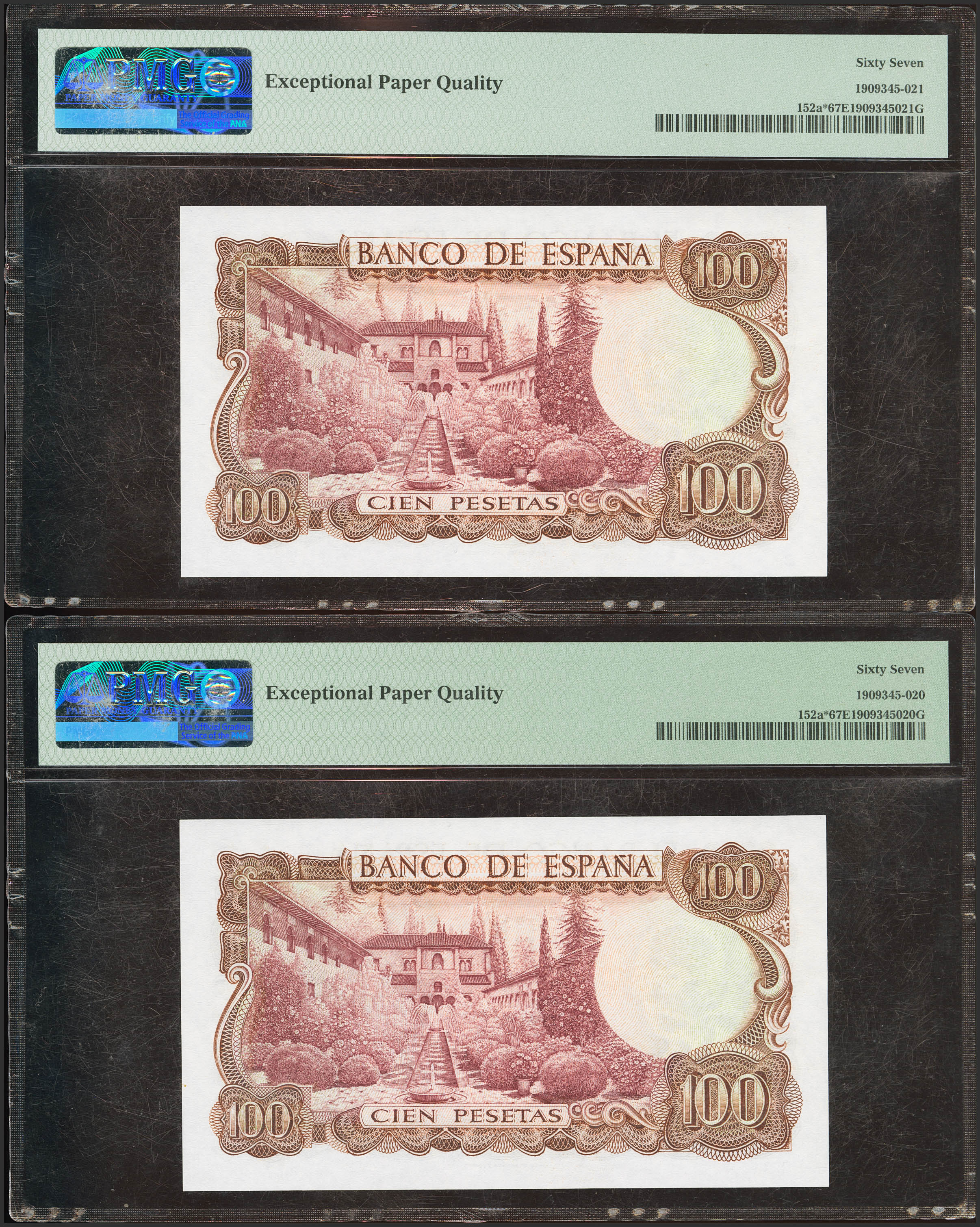 100 Pesetas. 17 de Noviembre de 1970. Pareja correlativa. Serie especial 9A. (Edifil 2023: 472d, Pick: 152a*). Apresto original. SC. Encapsulados PMG67EPQ.