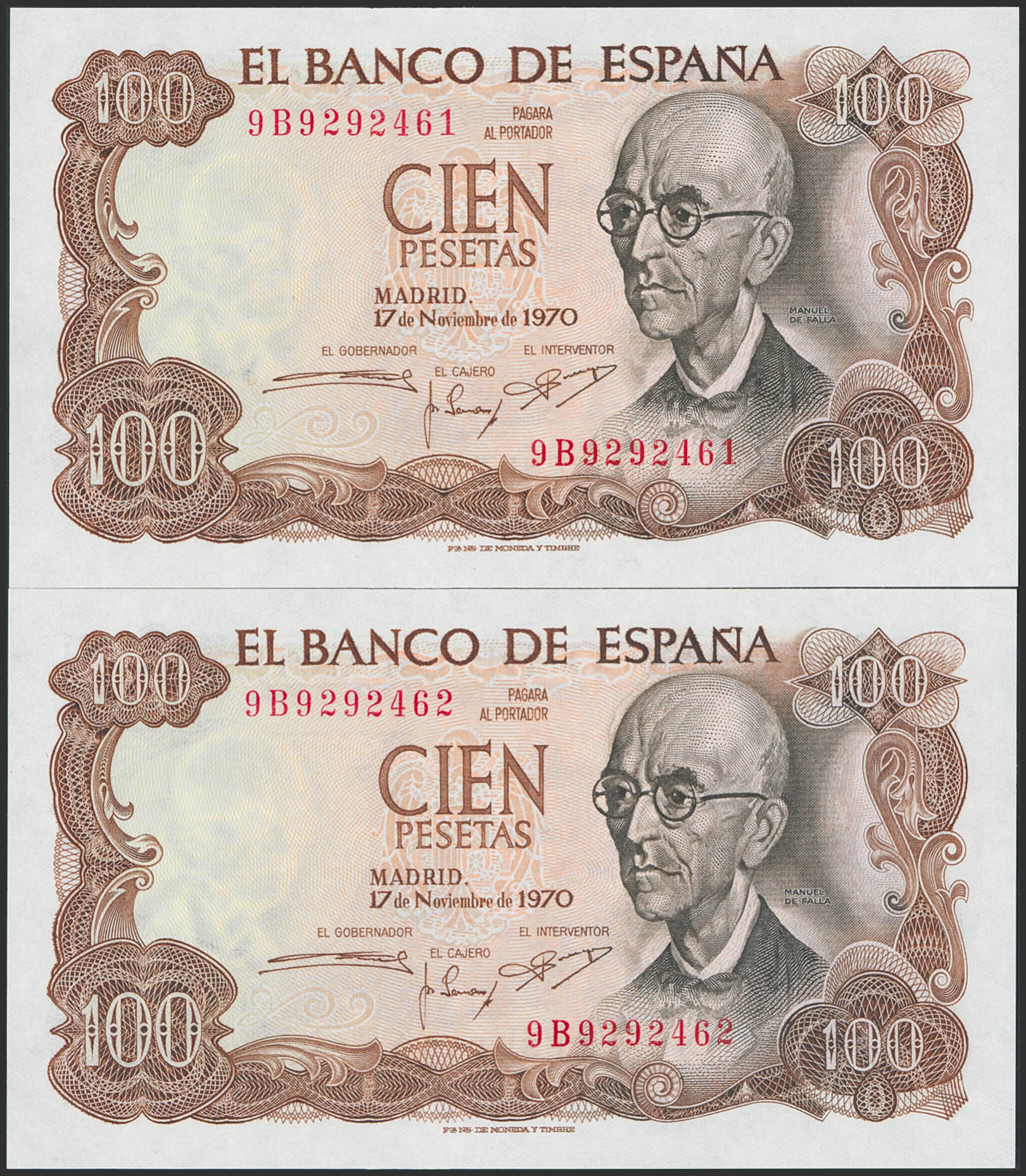 100 Pesetas. 17 de Noviembre de 1970. Pareja correlativa. Serie especial 9B. (Edifil 2023: 472d). Apresto original. SC.