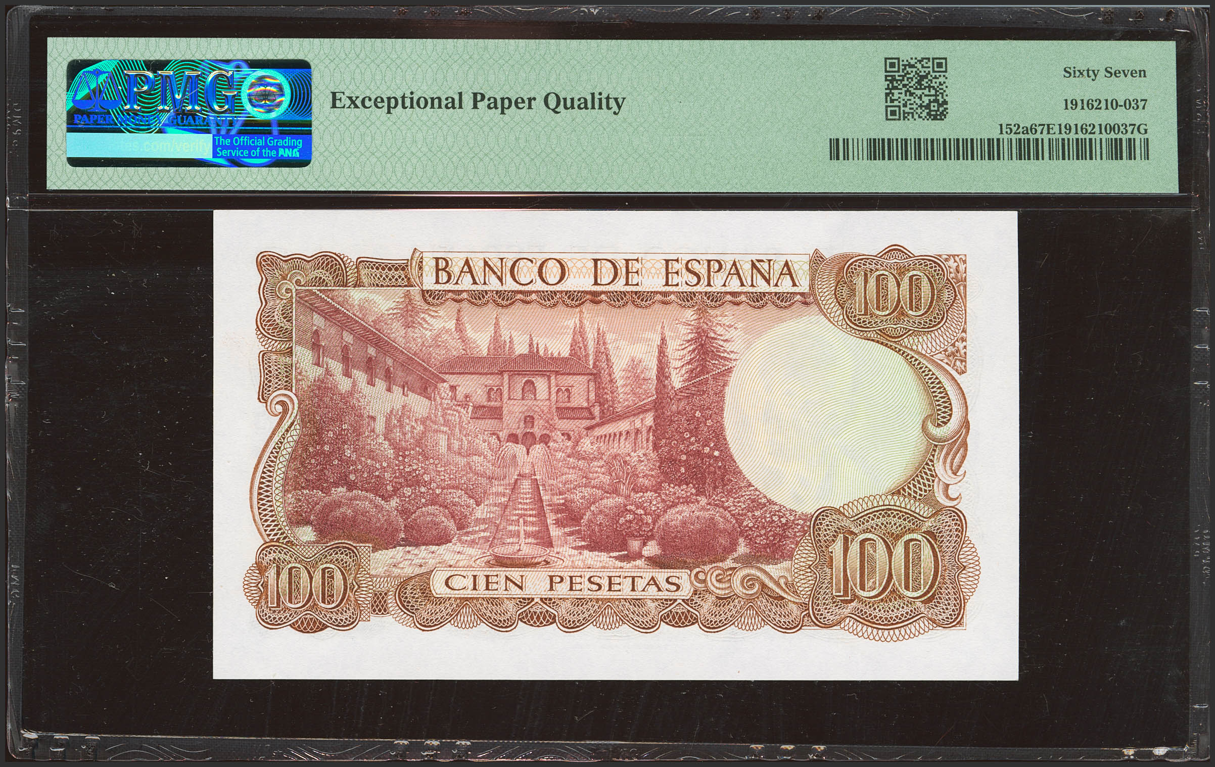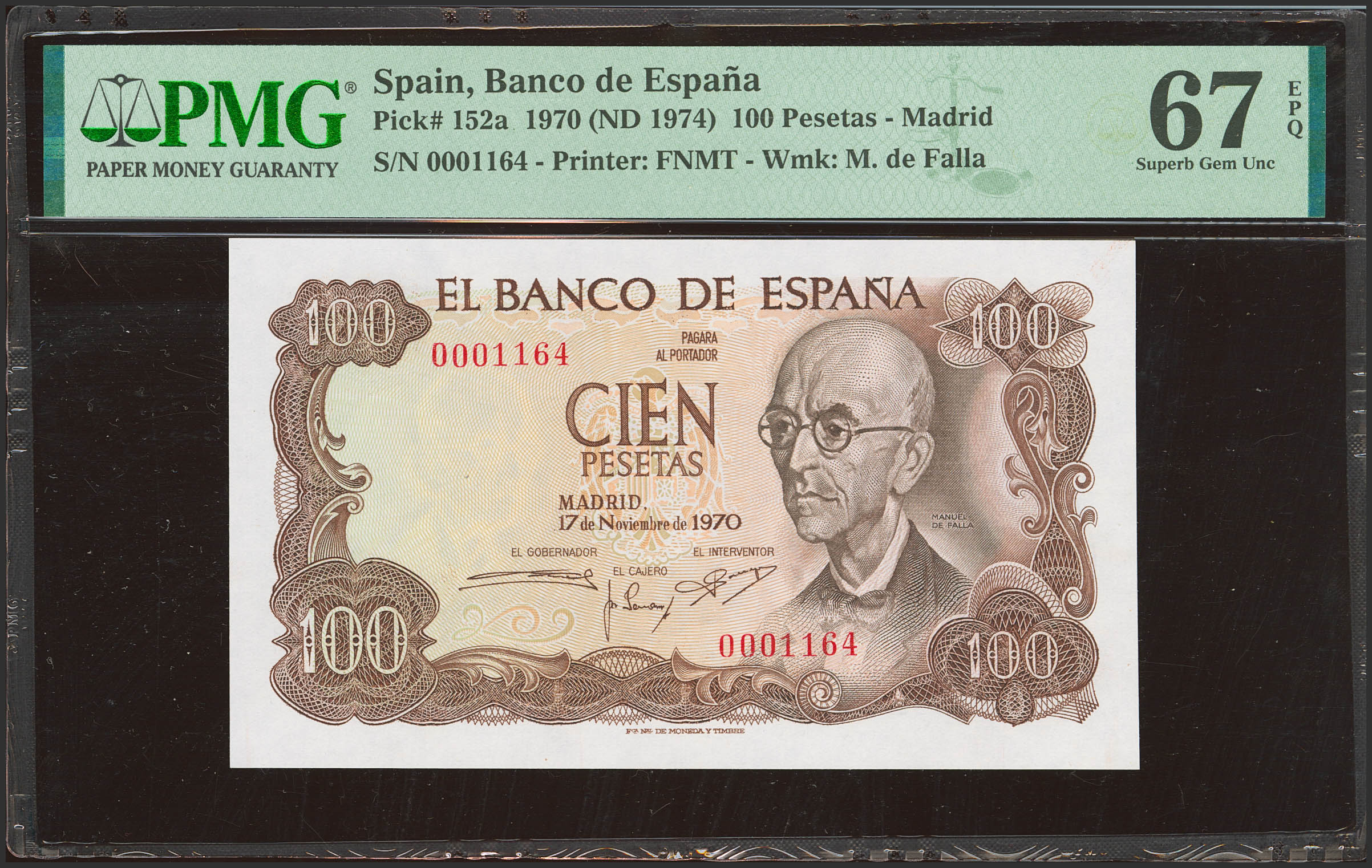 100 Pesetas. 17 de Noviembre de 1970. Sin serie y numeración bajísima. (Edifil 2023: 472, Pick: 152a). Raro en esta excepcional calidad, apresto original. SC. Encapsulado PMG67EPQ.