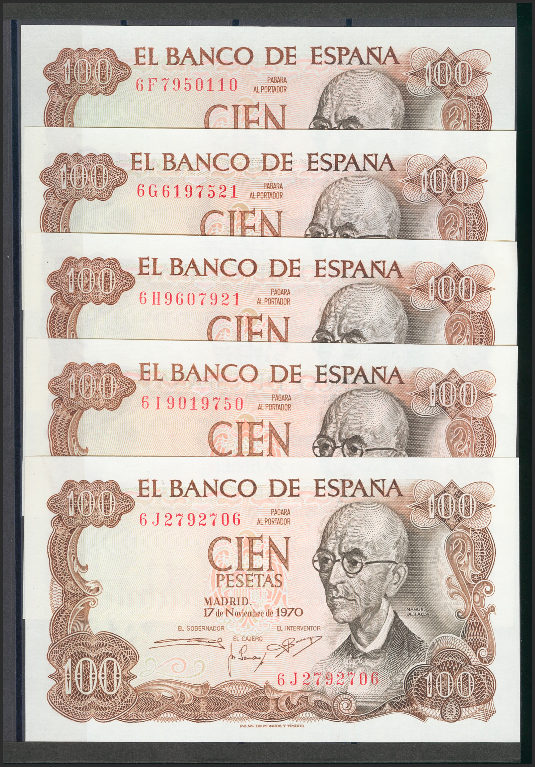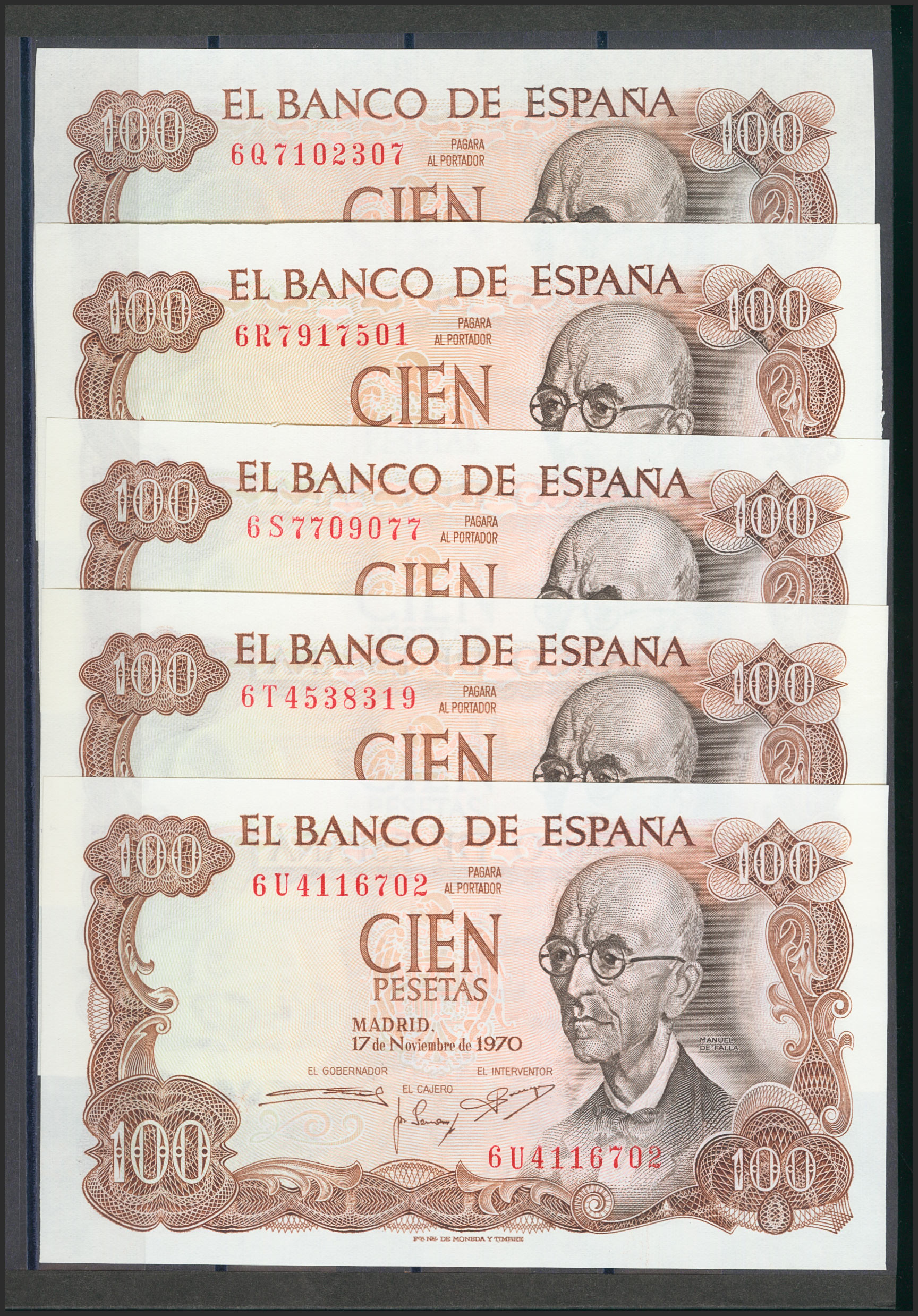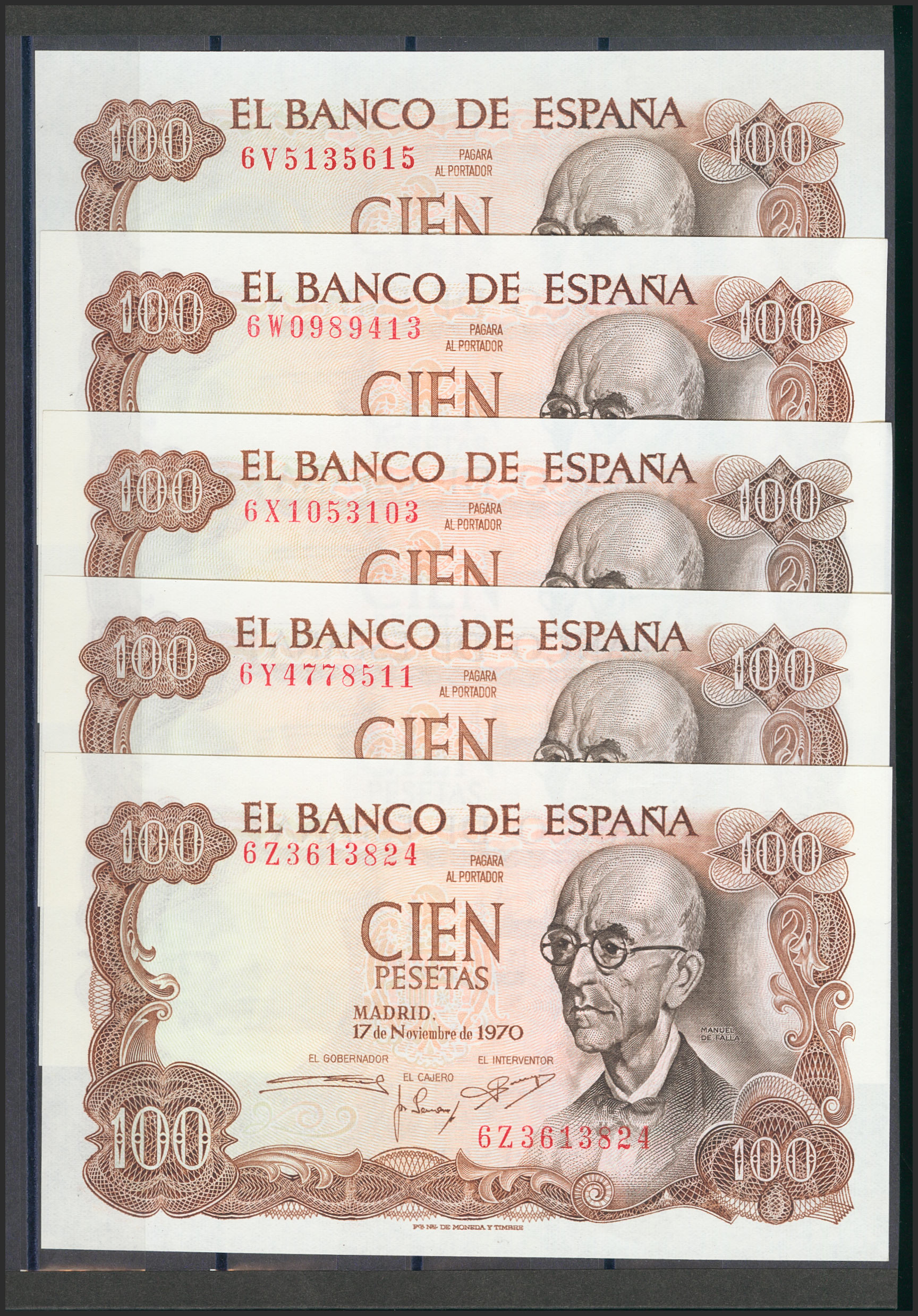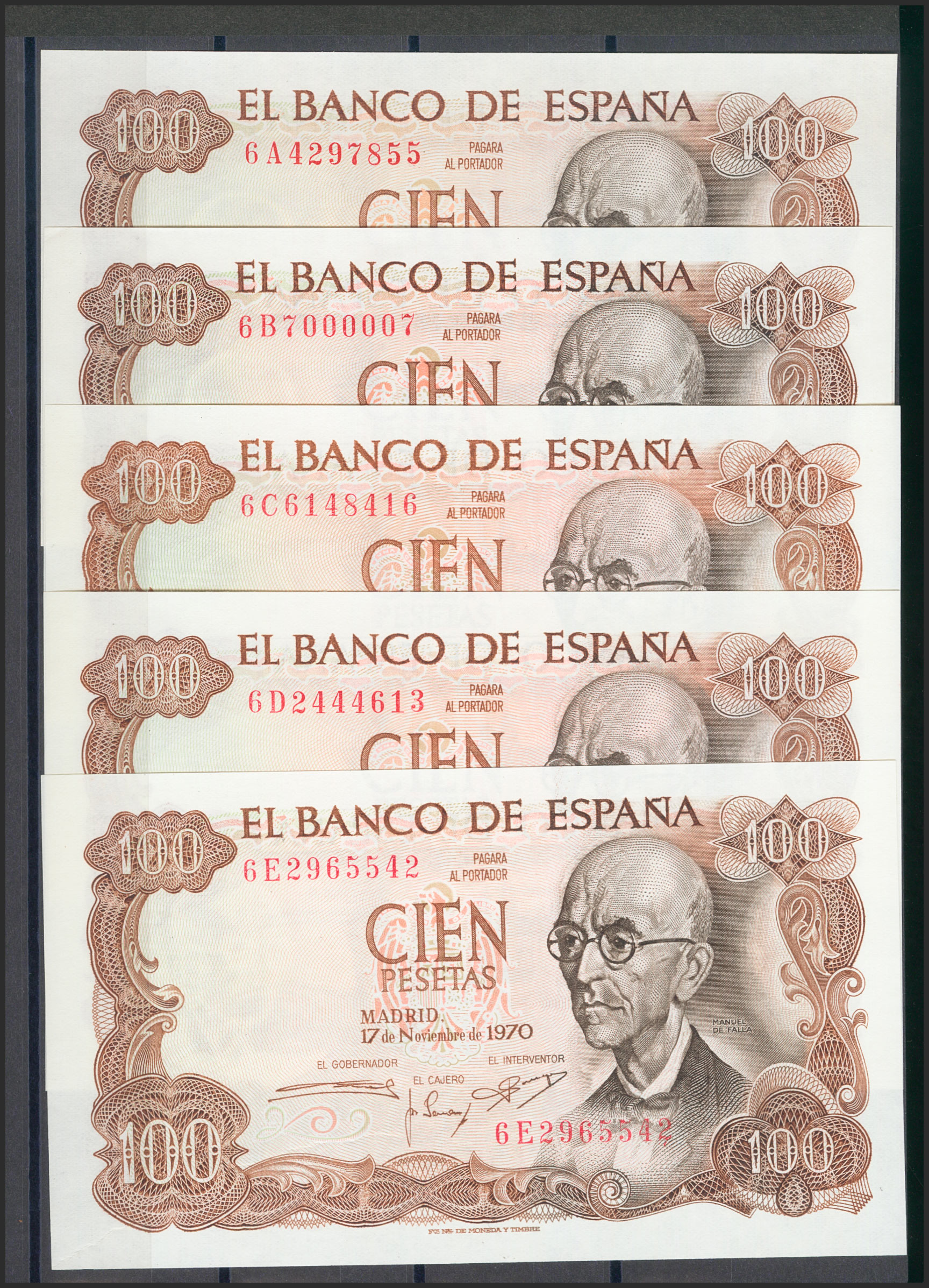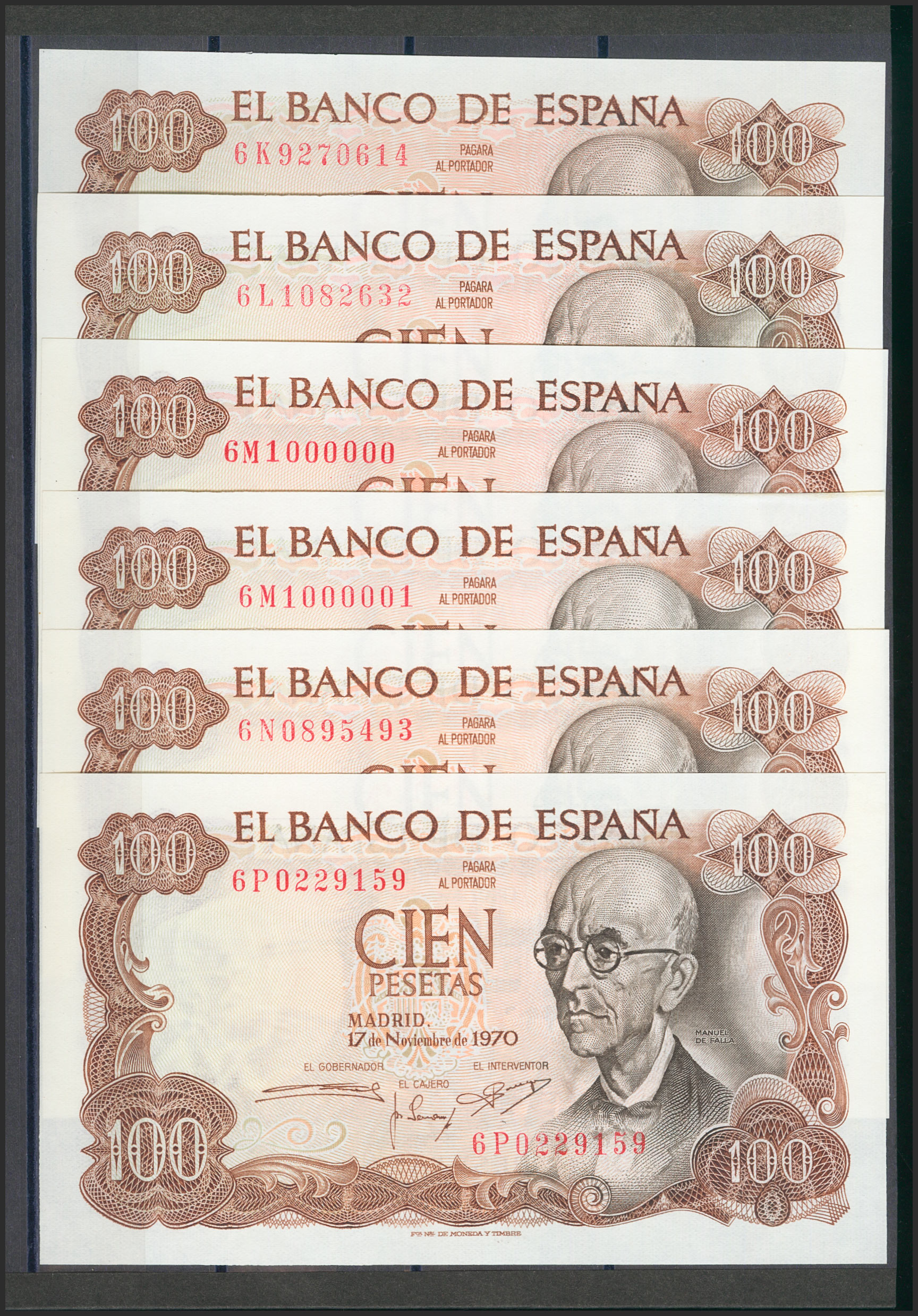 Precioso e interesante conjunto de 26 billetes de 100 Pesetas emitidos el 17 de Noviembre de 1970, incluyendo todas las letras de la séptima emisión (6A, 6B capicúa, 6C capicúa, 6D, 6E, 6F, 6G, 6H, 6I, 6J, 6K, 6L, 6M (hay dos de esta serie con las numeraciones 6M1000000 y 6M1000001, uno de ellos capicúa), 6N, 6P, 6Q, 6R, 6S capicúa, 6T, 6U, 6V, 6W, 6X, 6Y y 6Z). (Edifil 2017: 472c). Raro conjunto y de muy buena calidad, todos los billetes presentan apresto original (el conjunto debe ser considerado a todos los efectos de máxima calidad especialmente en un conjunto así, es posible que haya uno a lo sumo dos billetes en calidad SC- y ni tan siquiera eso pero preferimos optar por la prudencia, en nuestra opinión es algo absolutamente despreciable). SC/SC-.