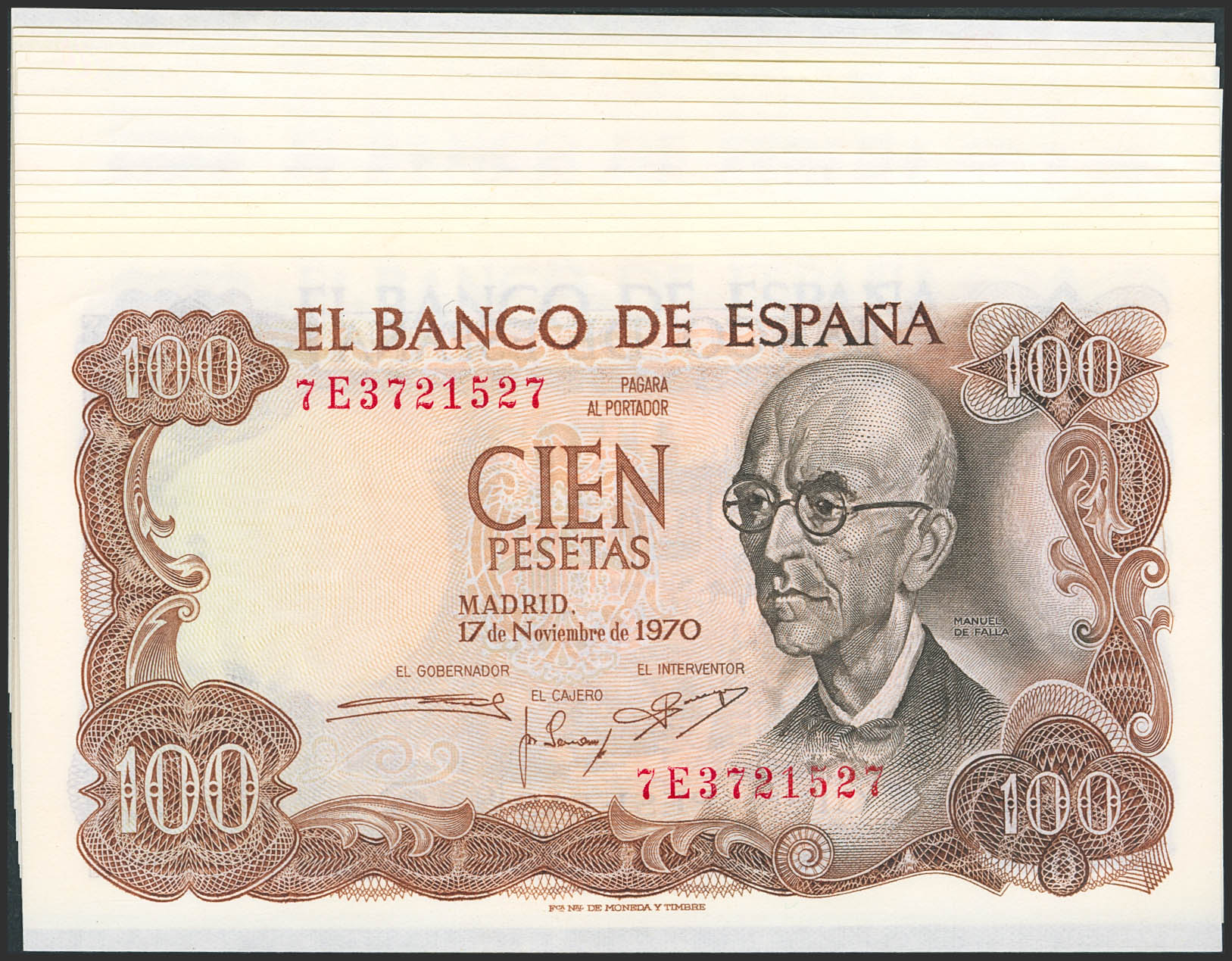 Conjunto de 13 billetes de 100 Pesetas emitidos el 17 de Noviembre de 1970, todos ellos con diferentes series (algunas correlativas entre sí), (Edifil 2023: 472b), conservando su apresto original. SC/SC-.