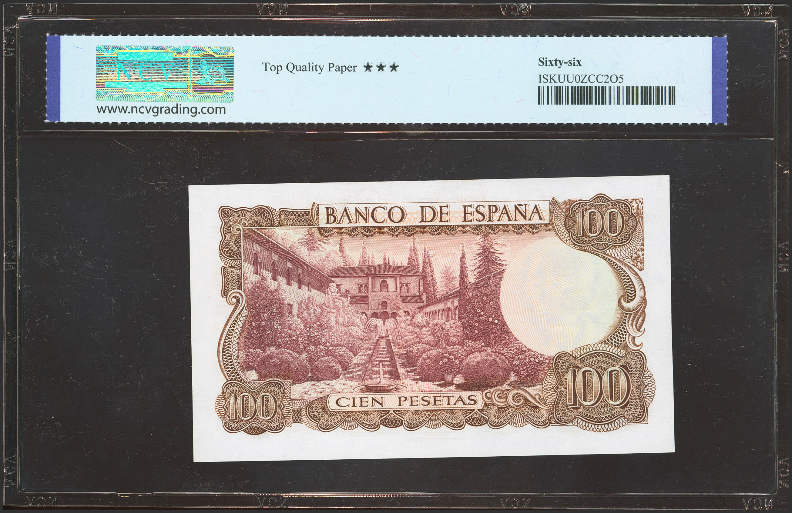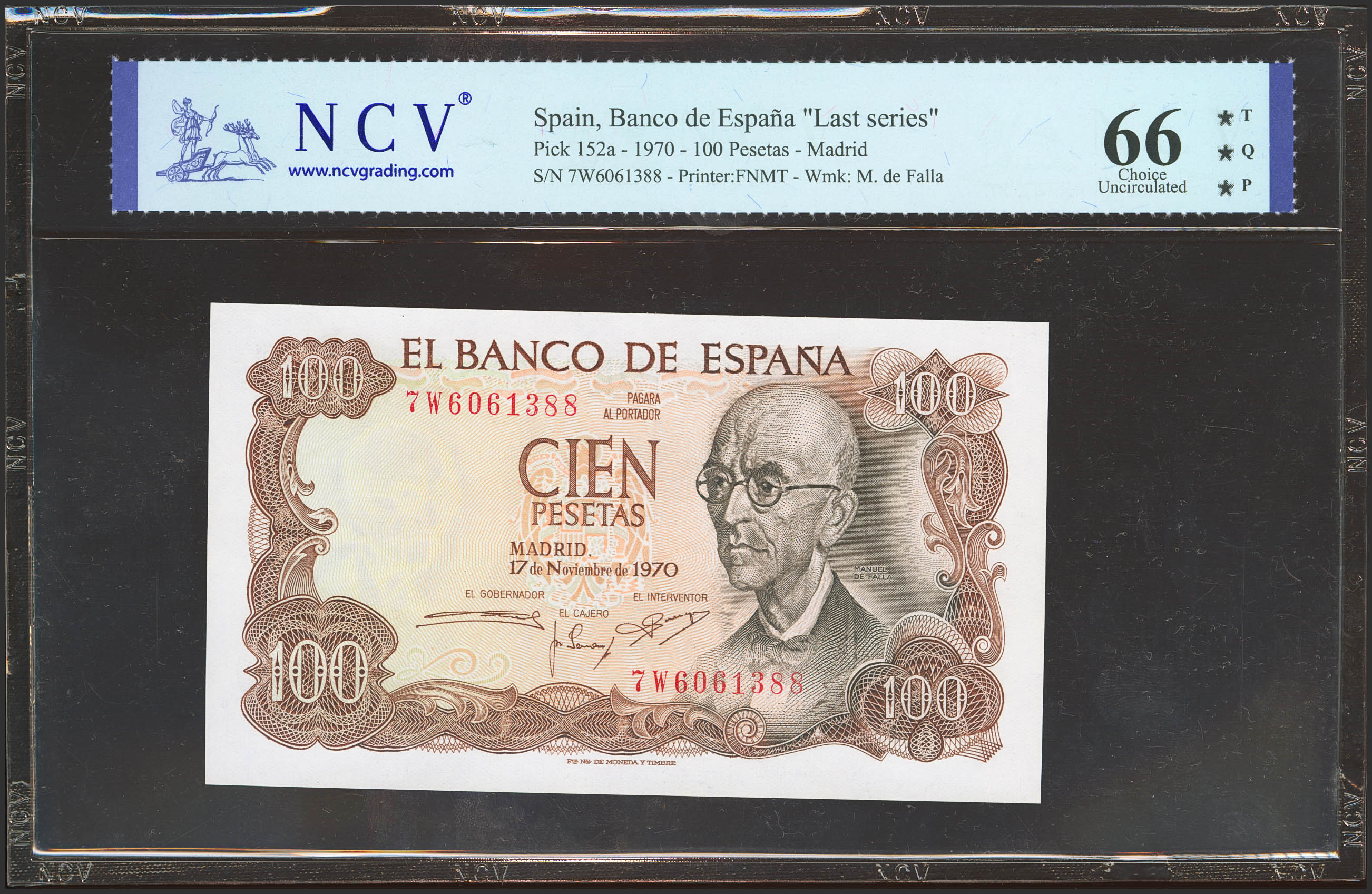 100 Pesetas. 17 de Noviembre de 1970. Serie 7W, última serie emitida. (Edifil 2023: 472c, Pick: 152a). Apresto original. SC. Encapsulado NCV66TQP.
