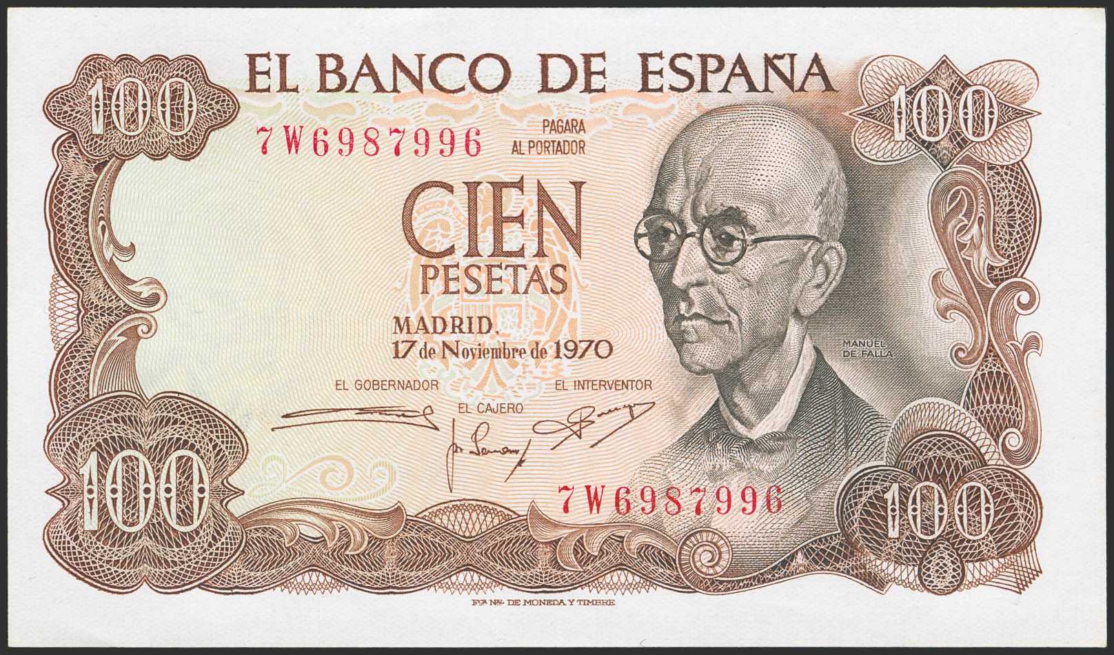 100 Pesetas. 17 de Noviembre de 1970. Serie 7W, última serie emitida. (Edifil 2023: 472c). SC.