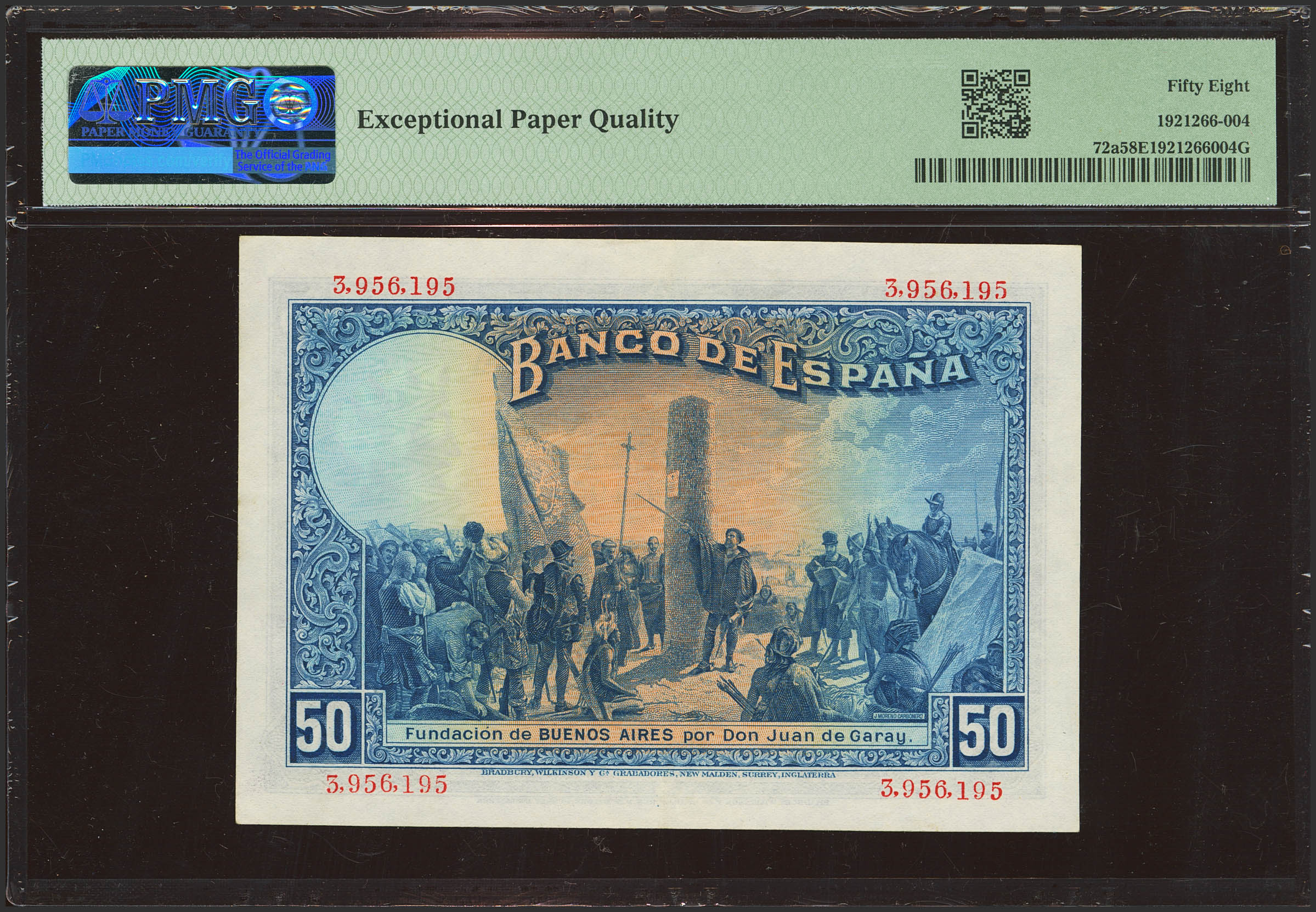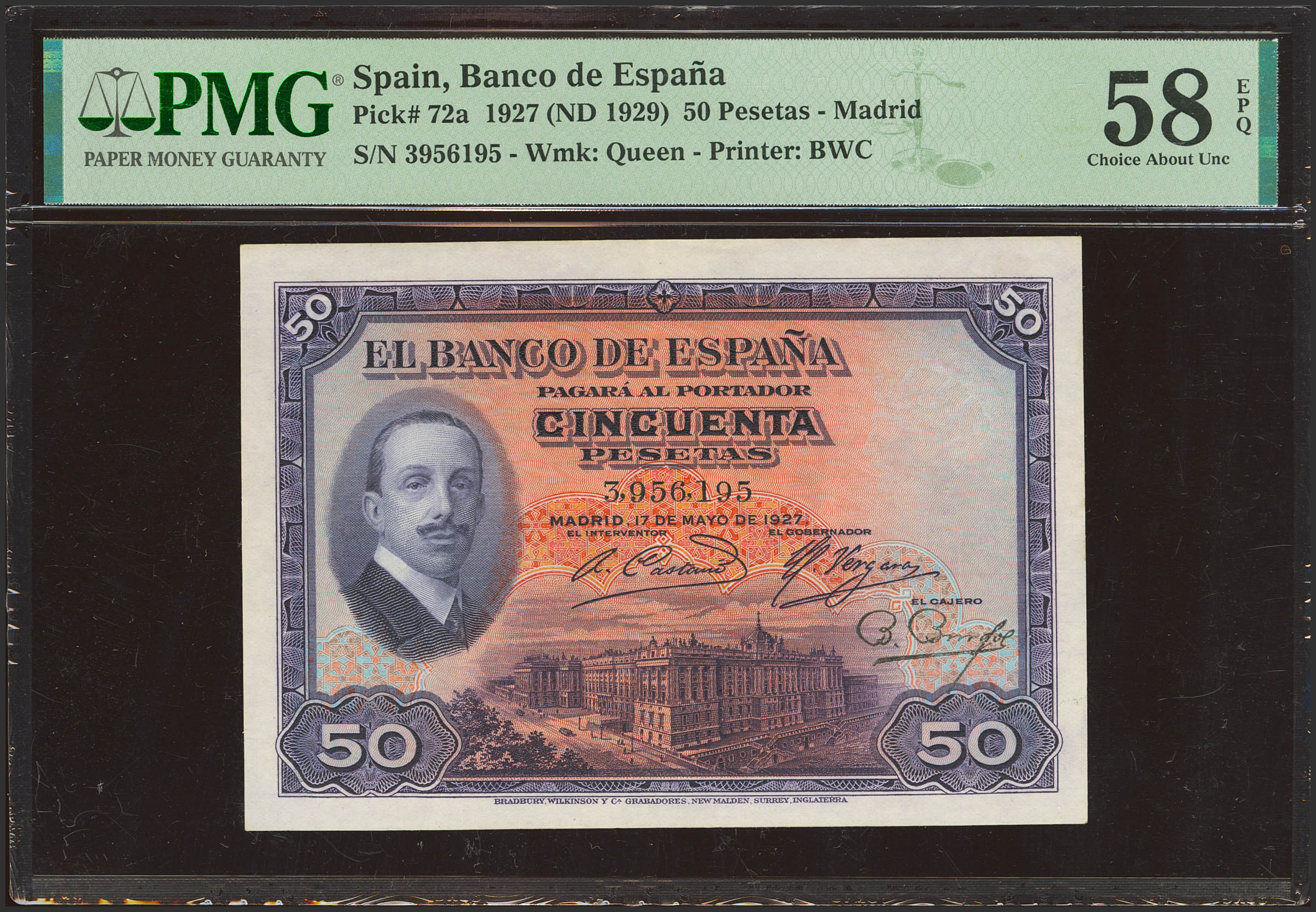 50 Pesetas. 17 de Mayo de 1927. Sin serie. (Edifil 2023: 326, Pick: 72a). Raro en esta excepcional calidad, apresto original. EBC+++. Encapsulado PMG58EPQ.
