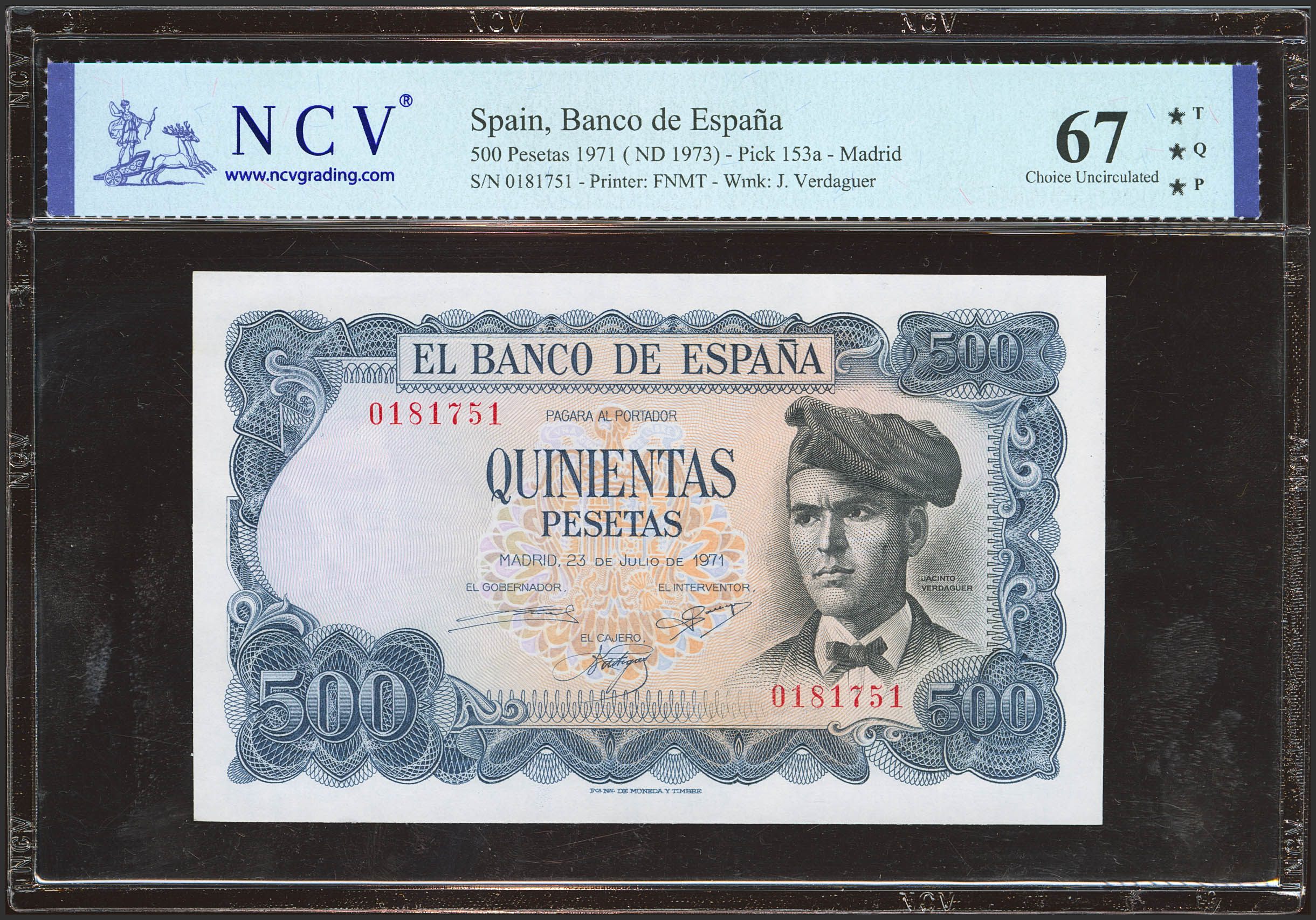 500 Pesetas. 23 de Julio de 1971. Sin serie. (Edifil 2023: 473, Pick: 153a). Raro en esta calidad, apresto original. Encapsulado NCV67TQP.