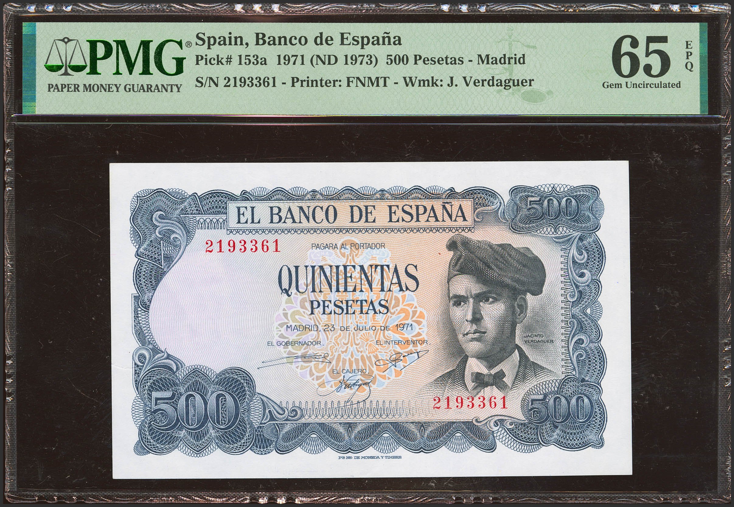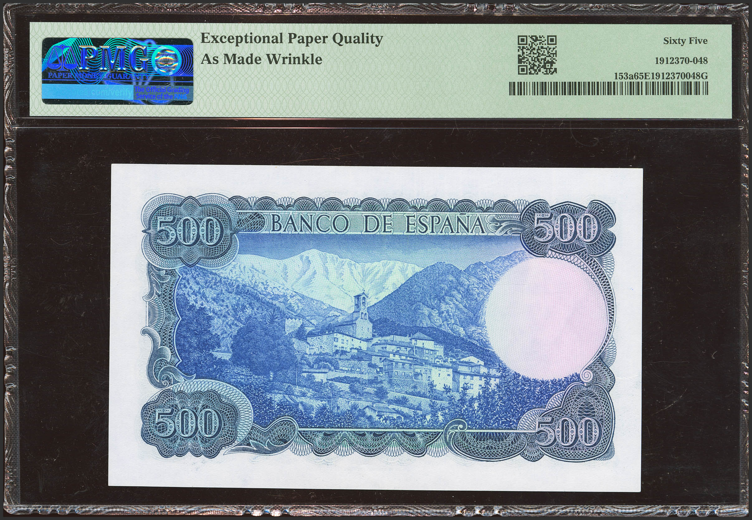500 Pesetas. 23 de Julio de 1971. Sin serie. (Edifil 2023: 473). Apresto original. SC. Encapsulado PMG65EPQ (as made wrinkle).