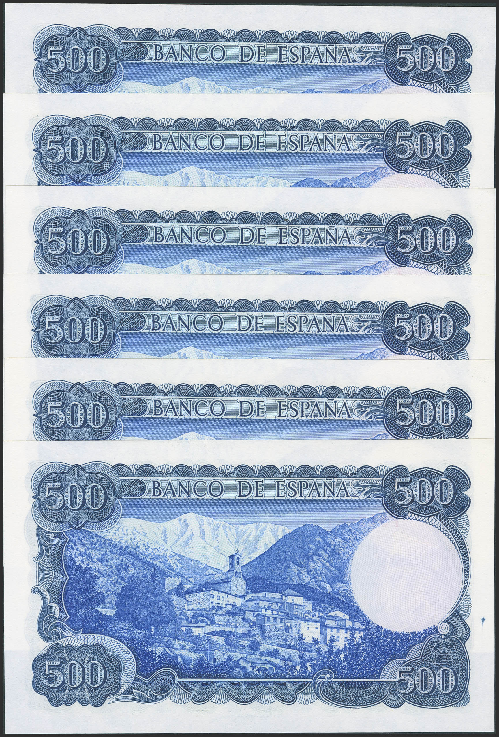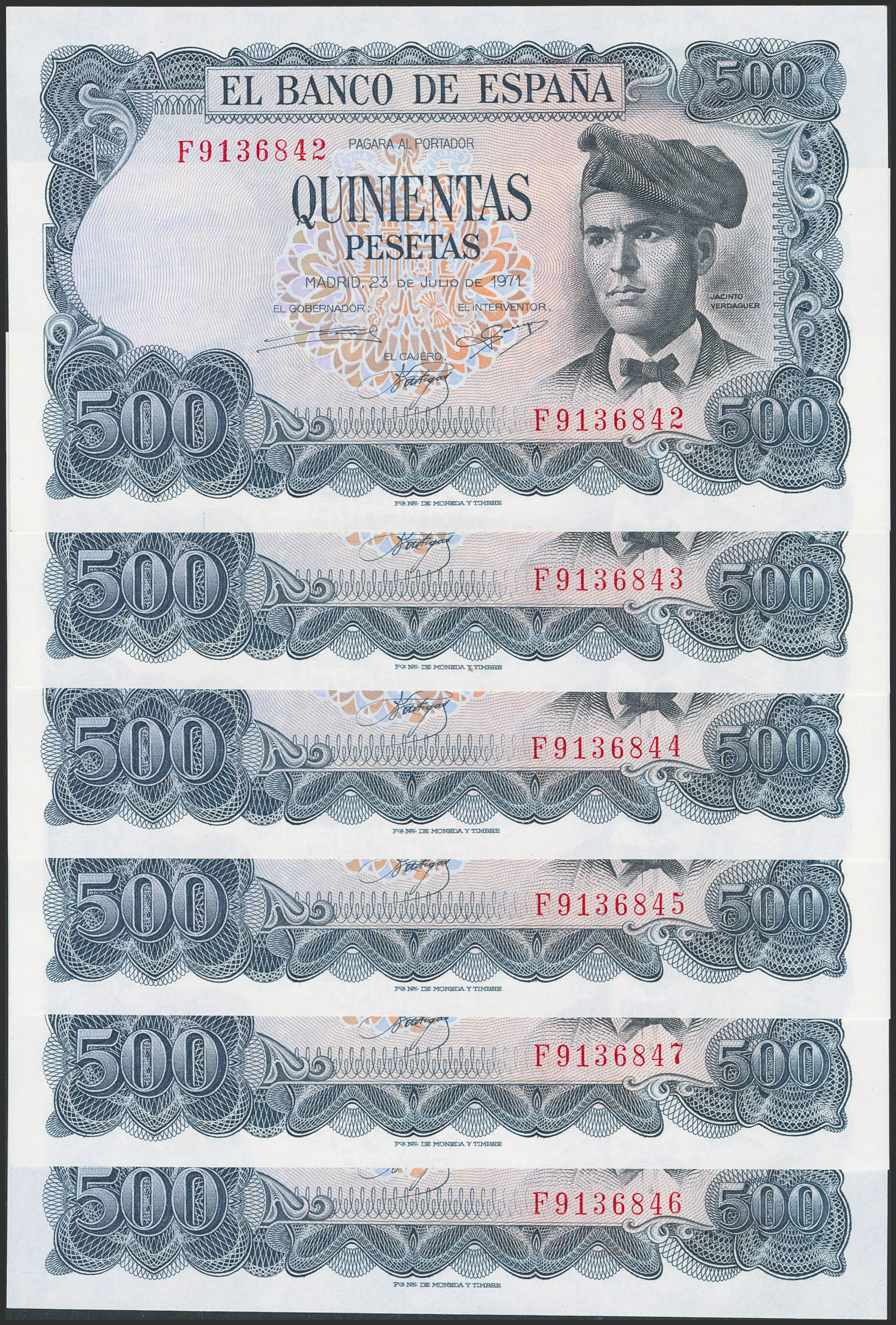 Conjunto de 6 billetes correlativos de 500 Pesetas emitidos el 23 de Julio de 1971 con la serie F. (Edifil 2023: 473a). SC.