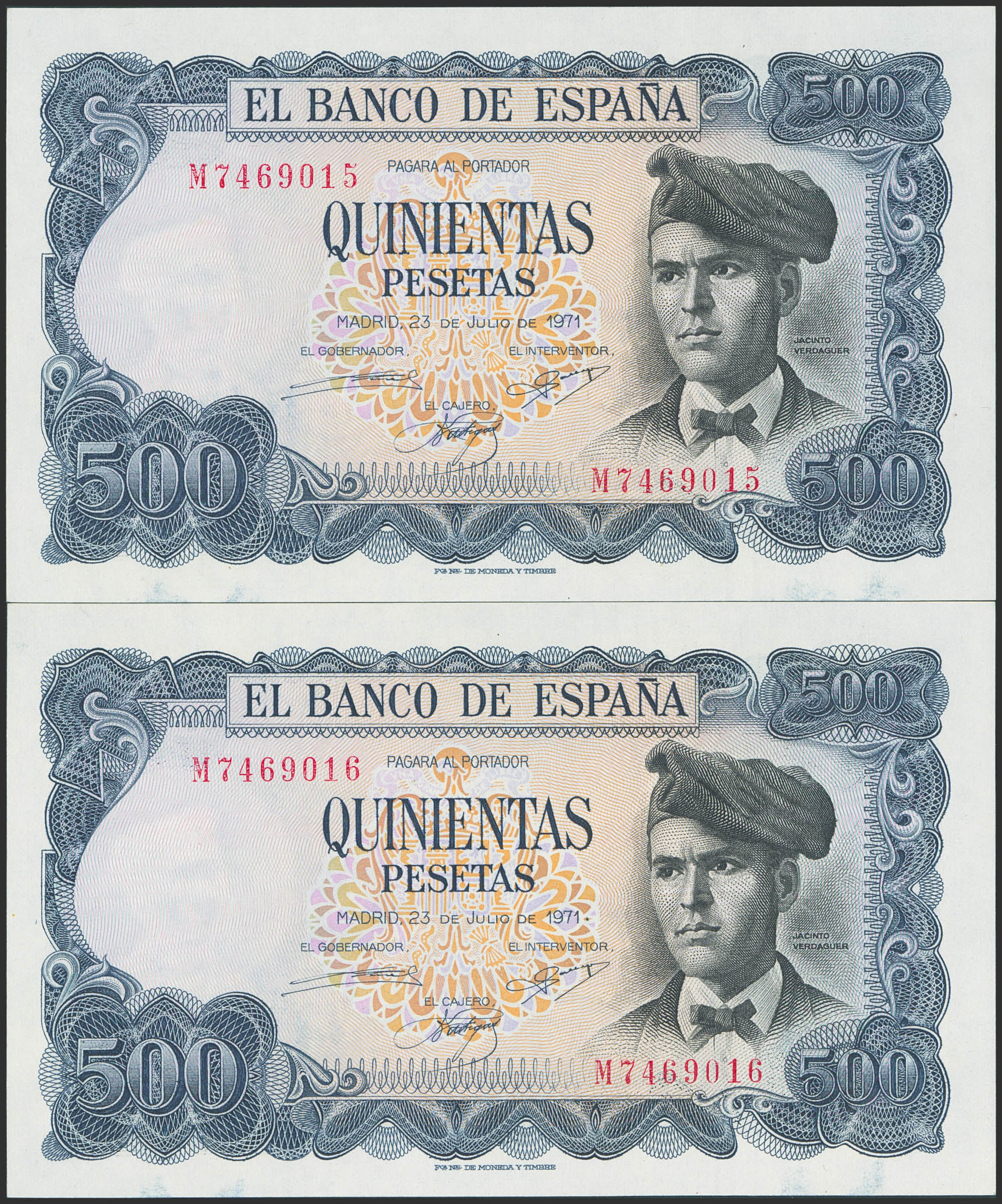 500 Pesetas. 23 de Julio de 1971. Pareja correlativa. Serie M. (Edifil 2023: 473a). SC.