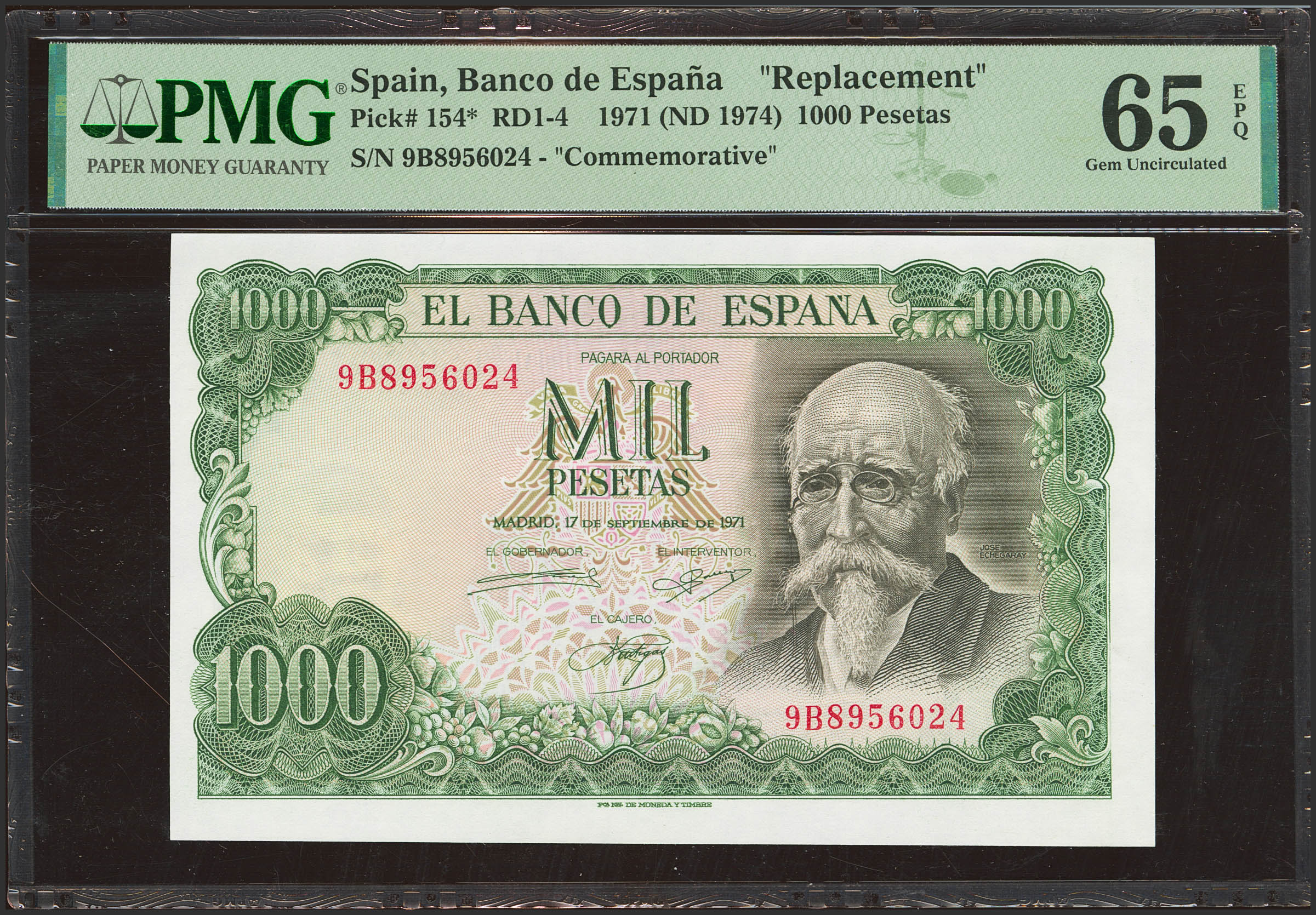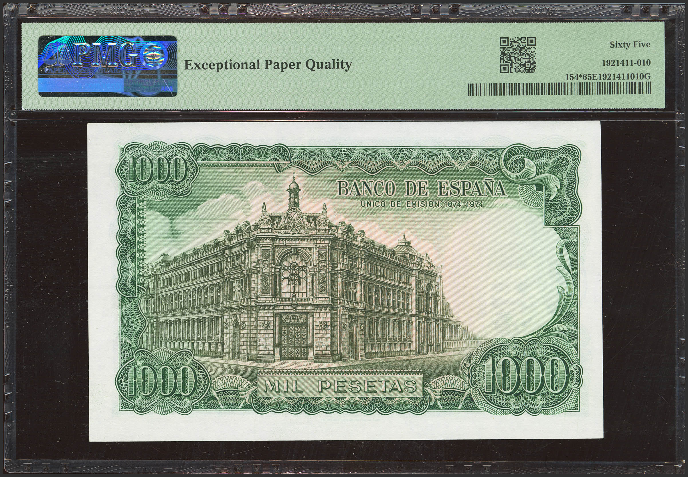 1000 Pesetas. 17 de Septiembre de 1971. Serie especial 9B. (Edifil 2023: 474d, Pick: 154*). Muy raro en esta excepcional calidad, apresto original. SC. Encapsulado PMG65EPQ.