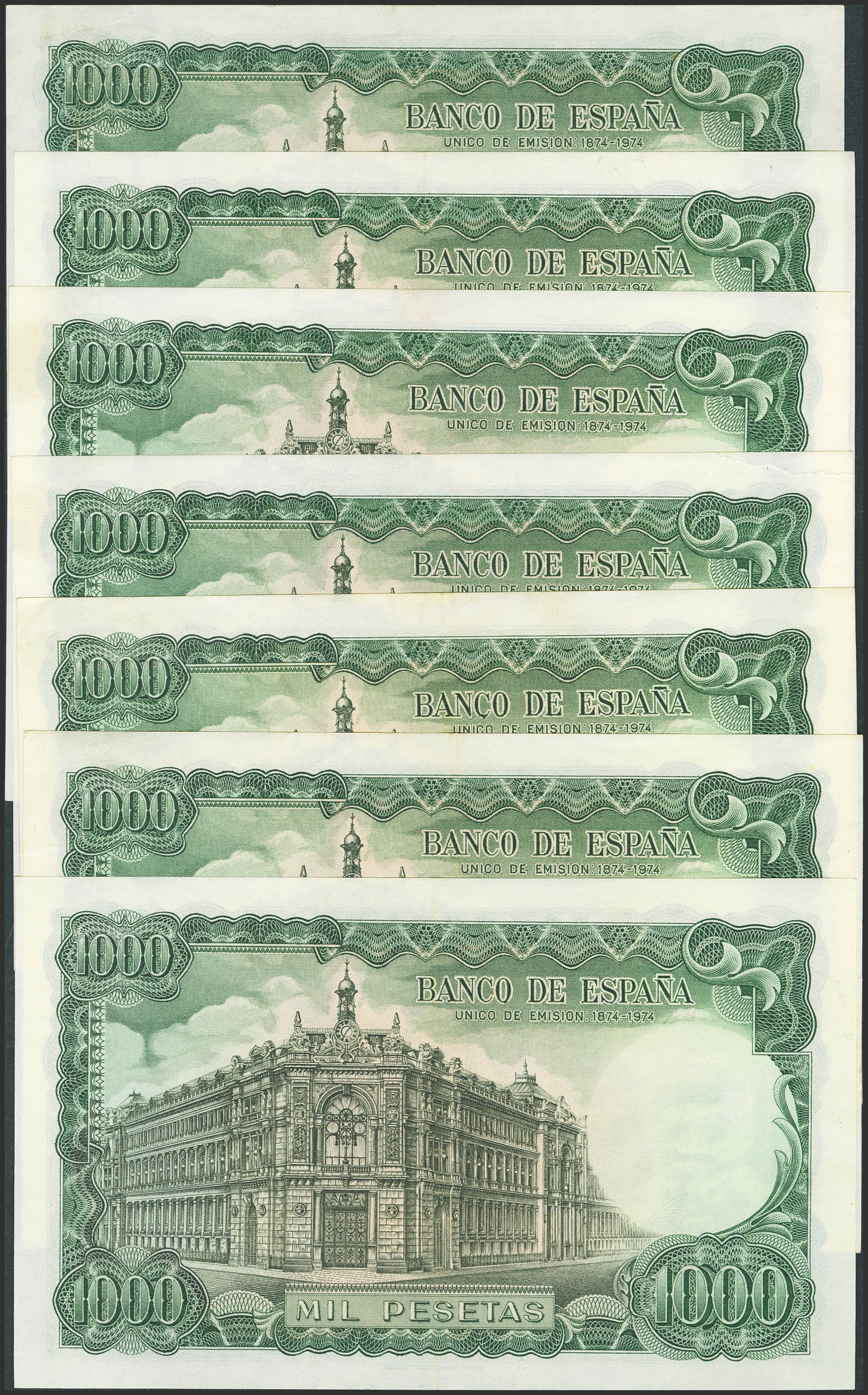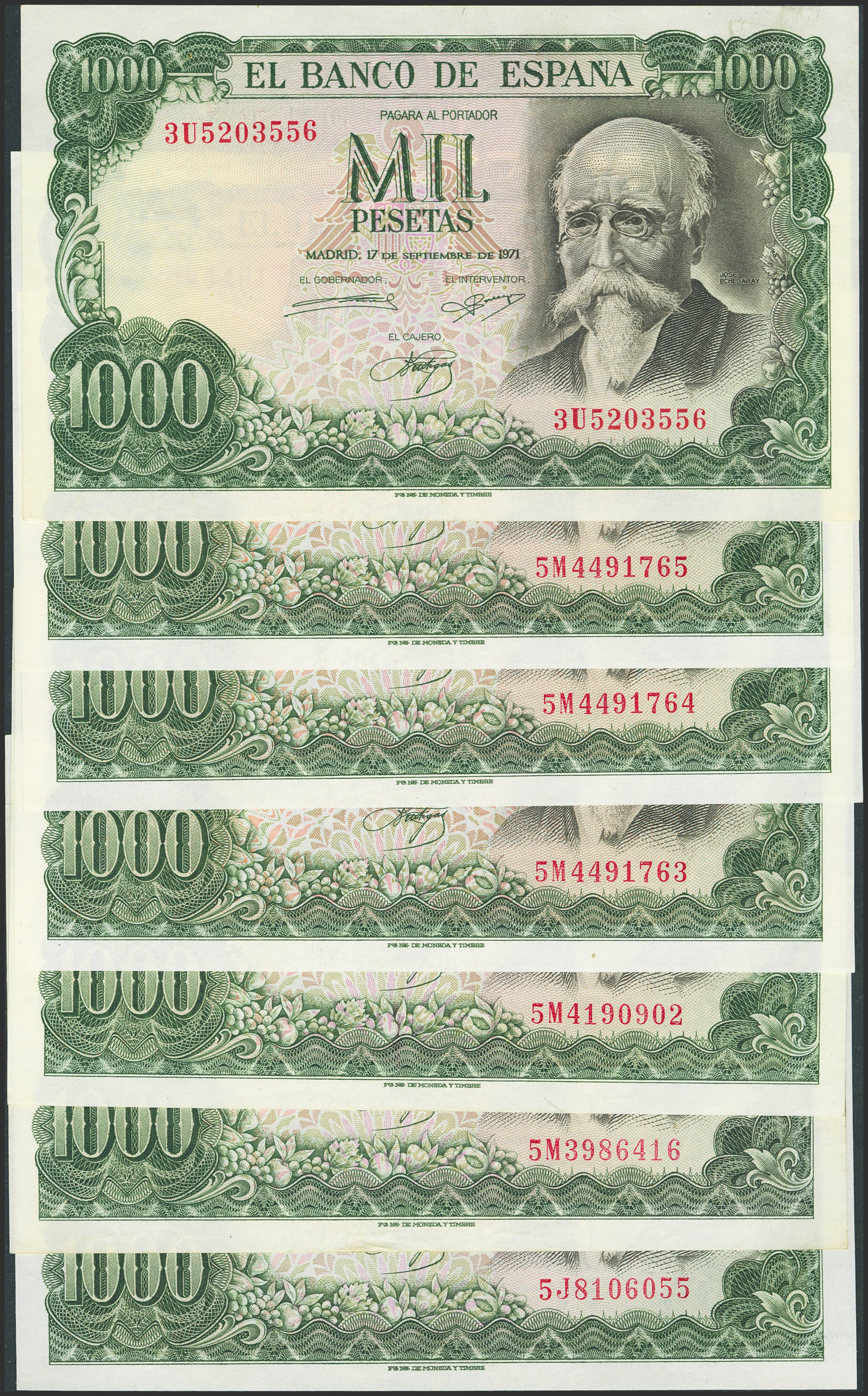 Conjunto de billetes, algunos correlativos, de 1000 Pesetas emitidos el 17 de Septiembre de 1971, con las series 3U, 5M y 5J, respectivamente (Edifil 2023: 474c), conservando el apresto original. SC--/MBC+.