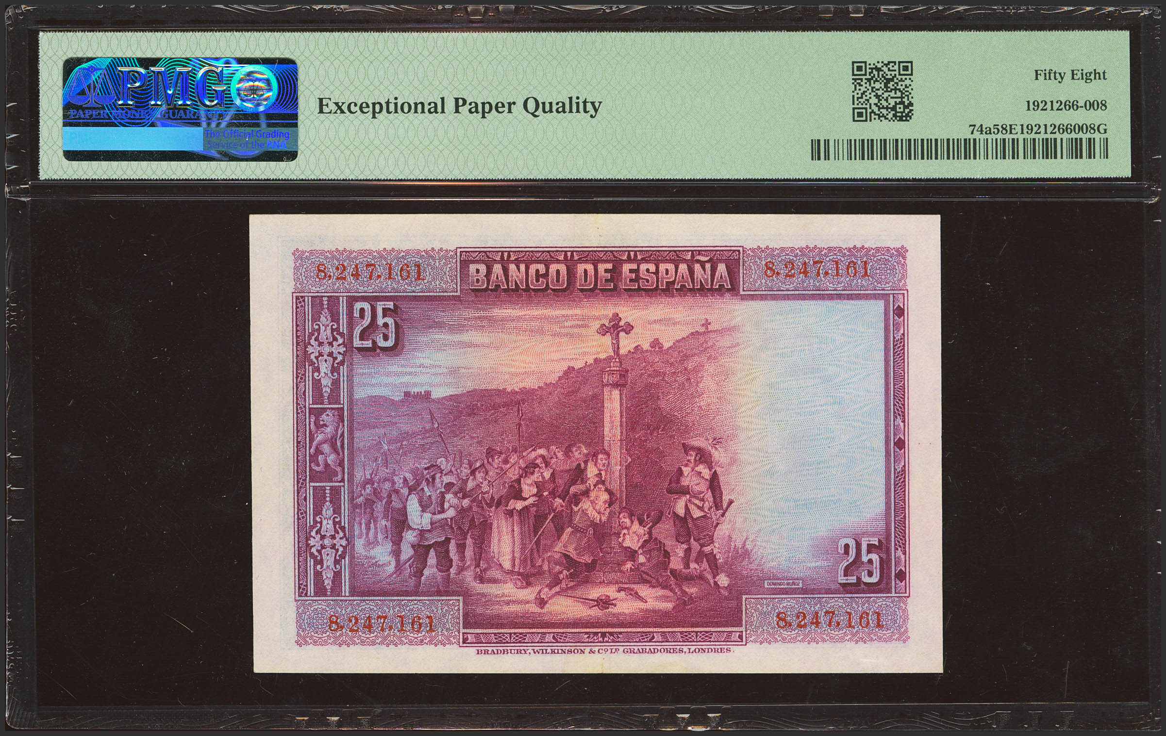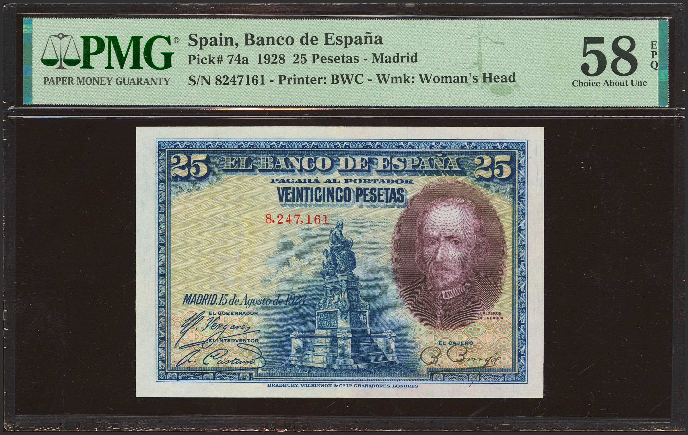 25 Pesetas. 15 de Agosto de 1928. Sin serie. (Edifil 2023: 328, Pick: 74a). Inusual, especialmente en esta calidad, apresto original. EBC+++. Encapsulado PMG58EPQ.