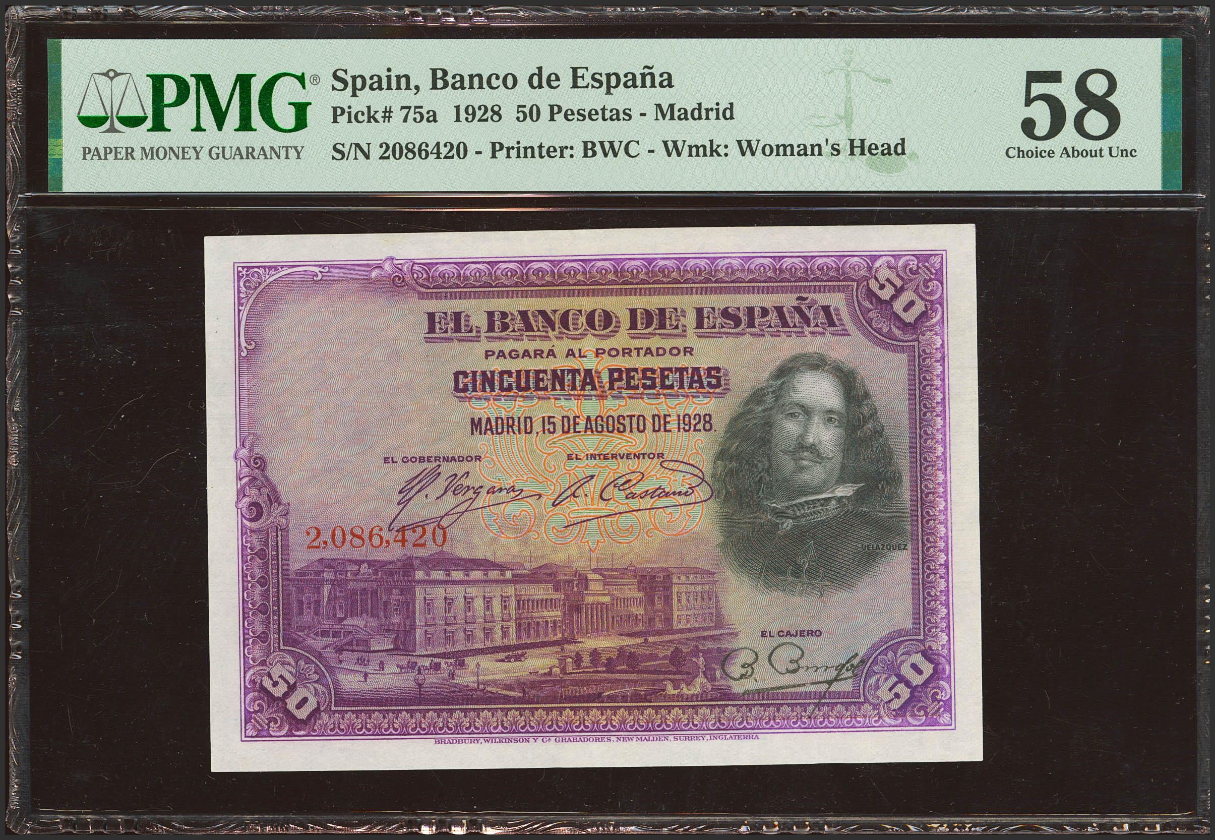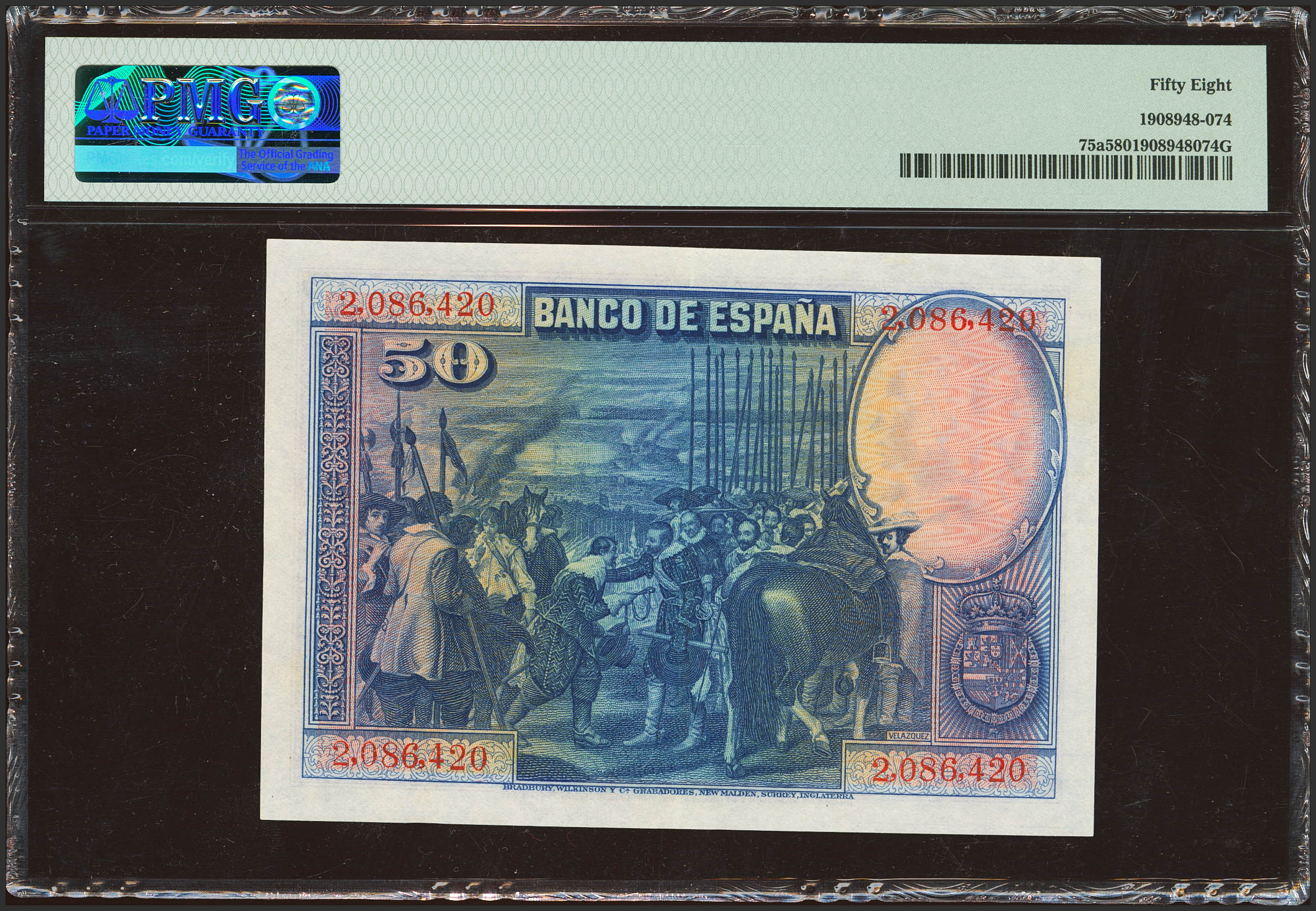 50 Pesetas. 15 de Agosto de 1928. Sin serie. (Edifil 2023: 329, Pick: 75a). Inusual, especialmente en esta calidad. EBC+++. Encapsulado PMG58.