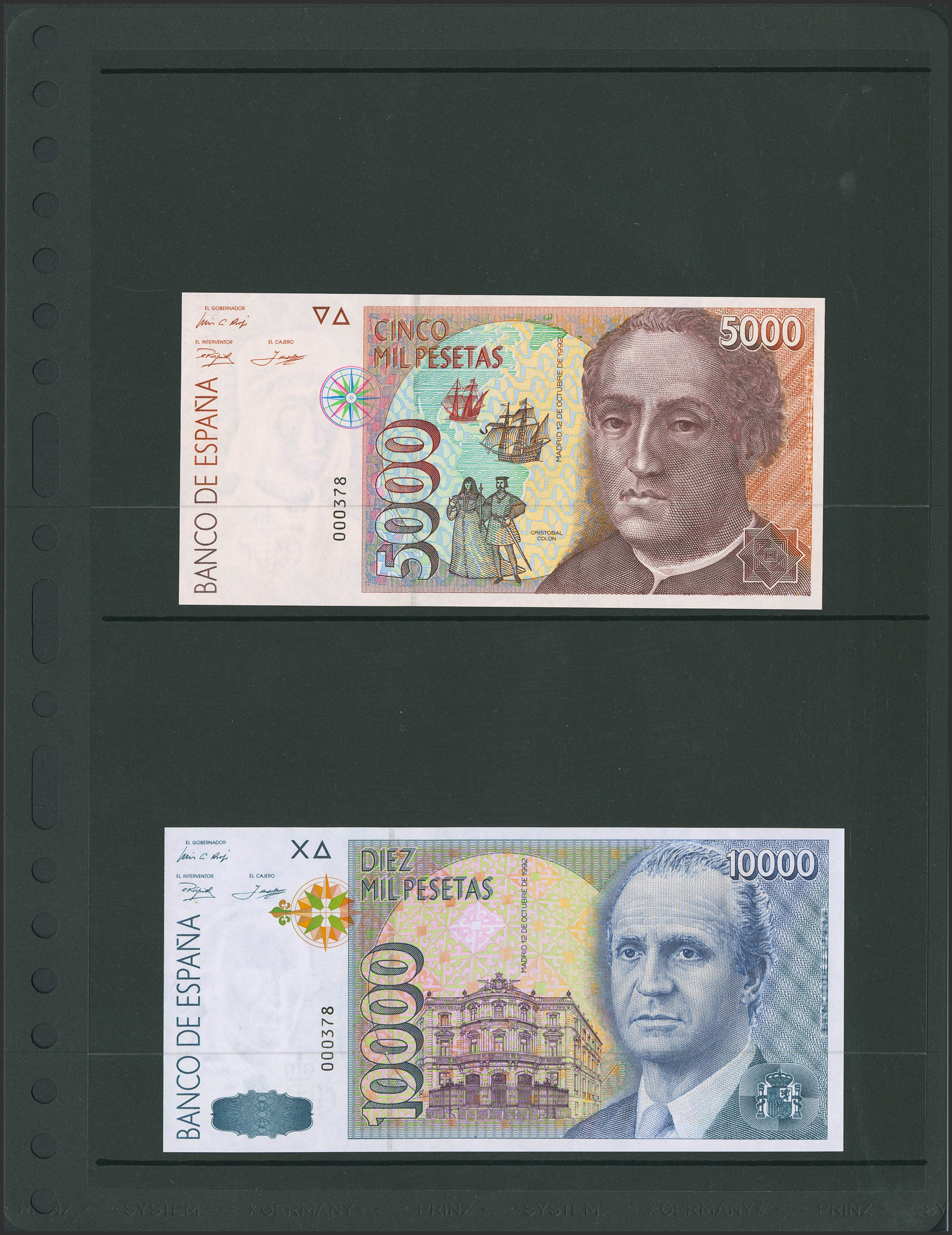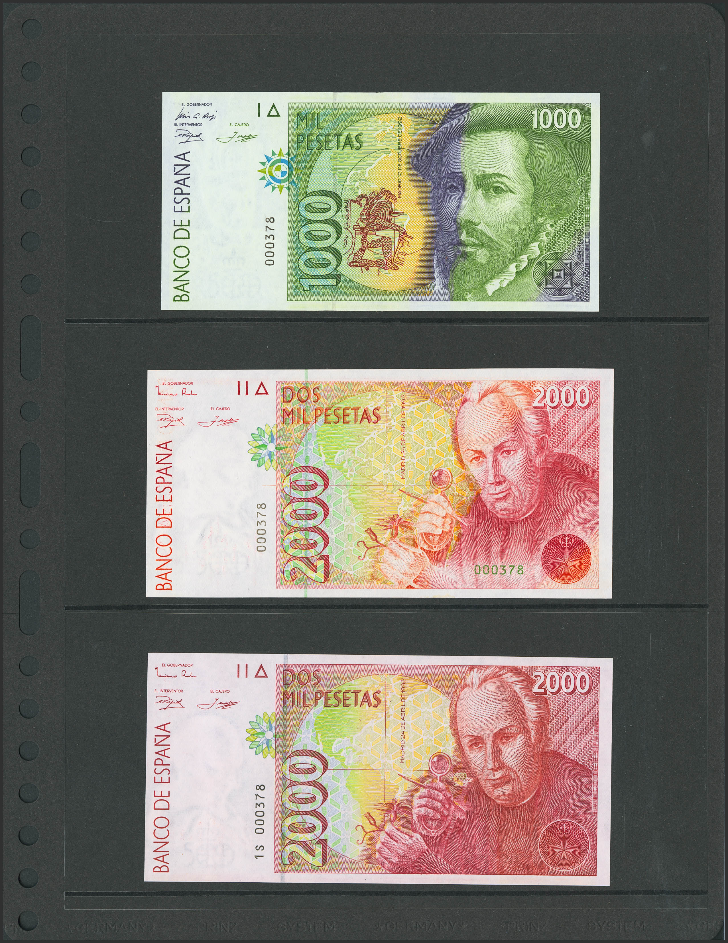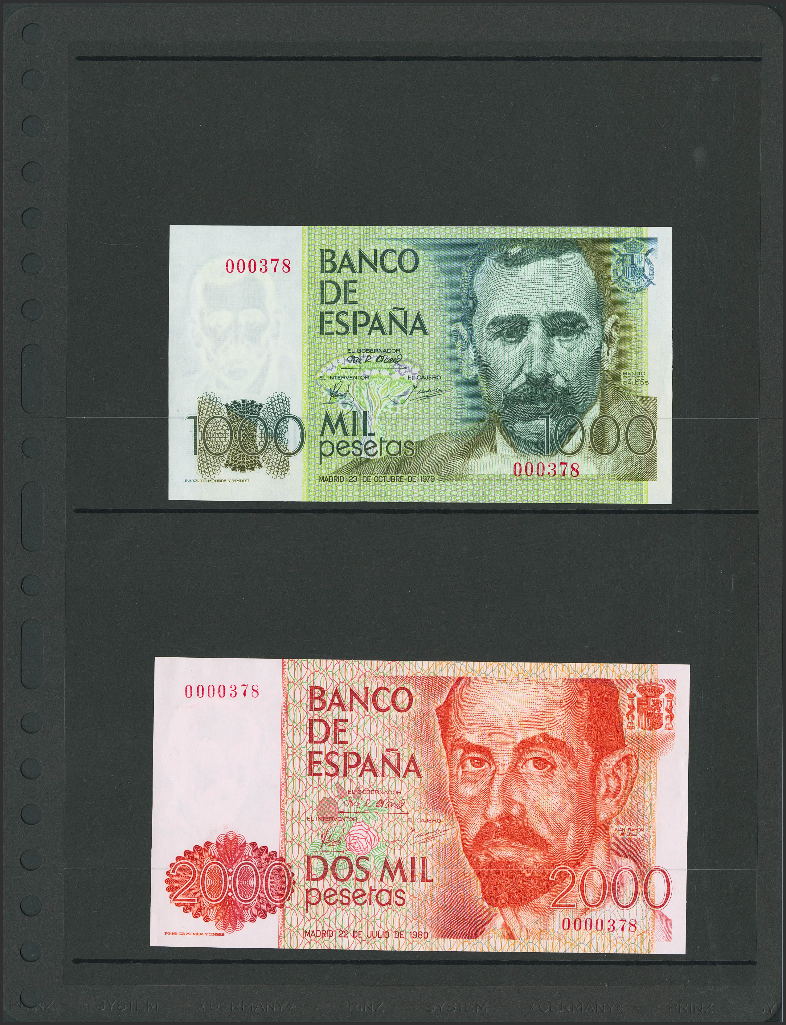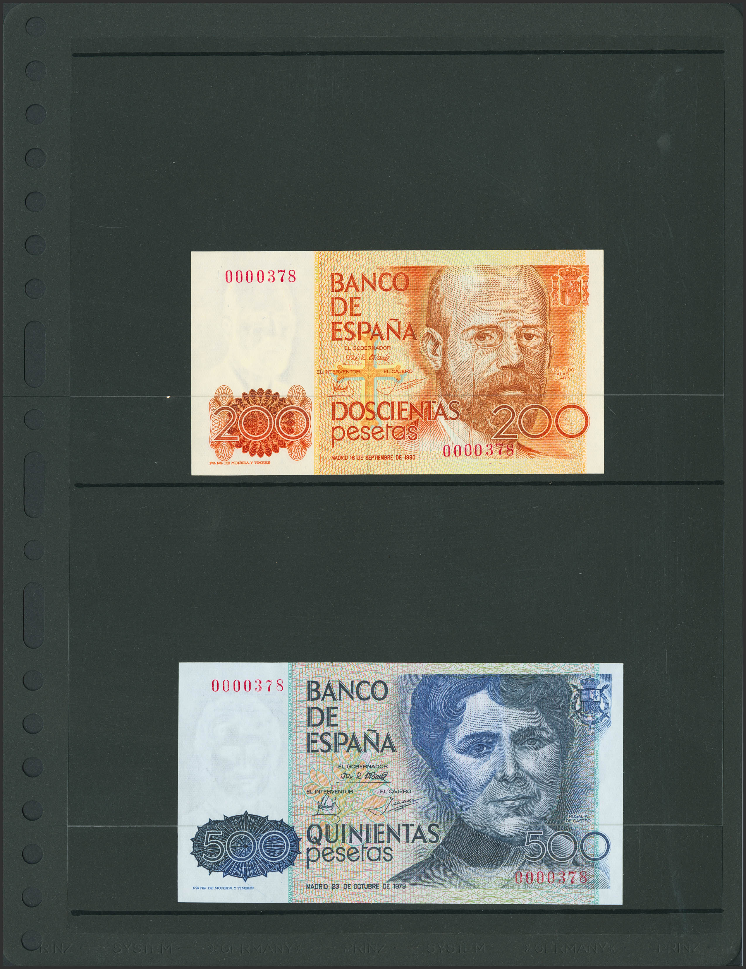Conjunto de 6 billetes de 200 Pesetas, 500 Pesetas, 1000 Pesetas, 2000 Pesetas, 5000 Pesetas y 10000 Pesetas, todos los billetes emitidos entre 1979 y 1985, todos sin serie y con la misma baja numeración 0000378, además la serie completa de 5 billetes de la emisión de 1992 (incluyendo el de 2000 Pesetas de 1995 con la serie 1S), todos sin serie y con la misma numeración baja que el grupo anterior 0000378. (Edifil 2023: 476/81, 482/85, 482A). Extremadamente raro conjunto, muy pocos conjuntos conocidos así de completos. SC/SC-.