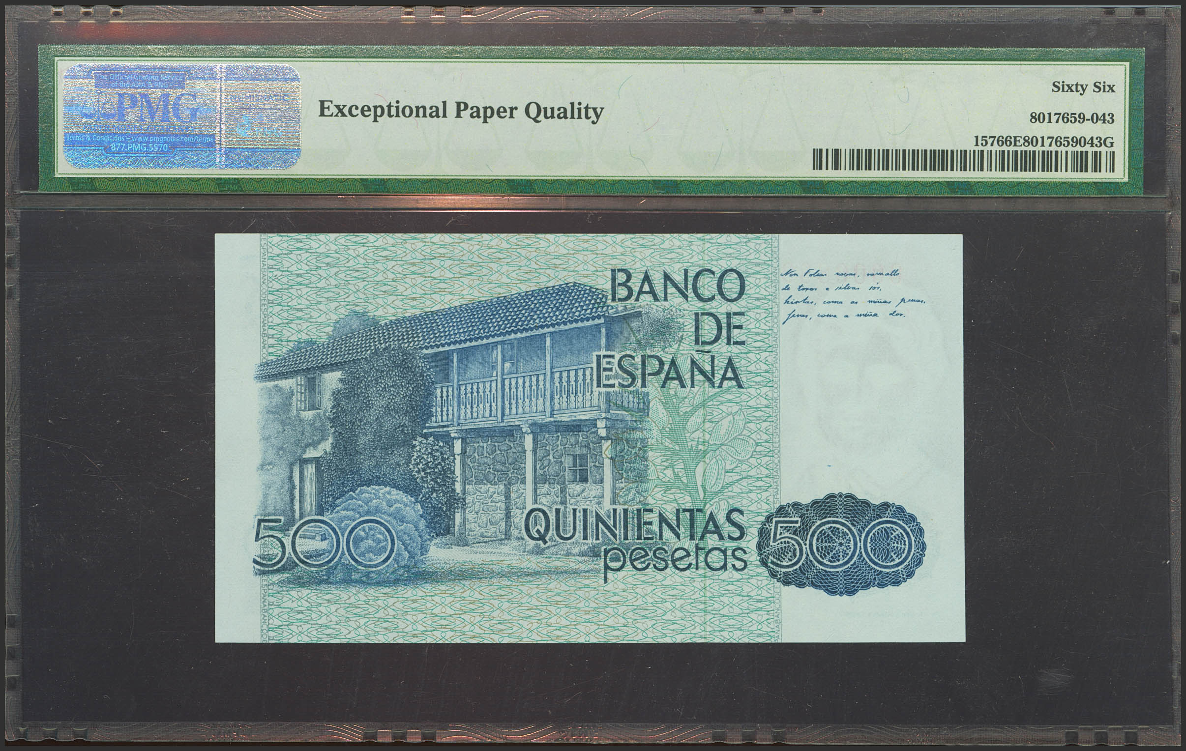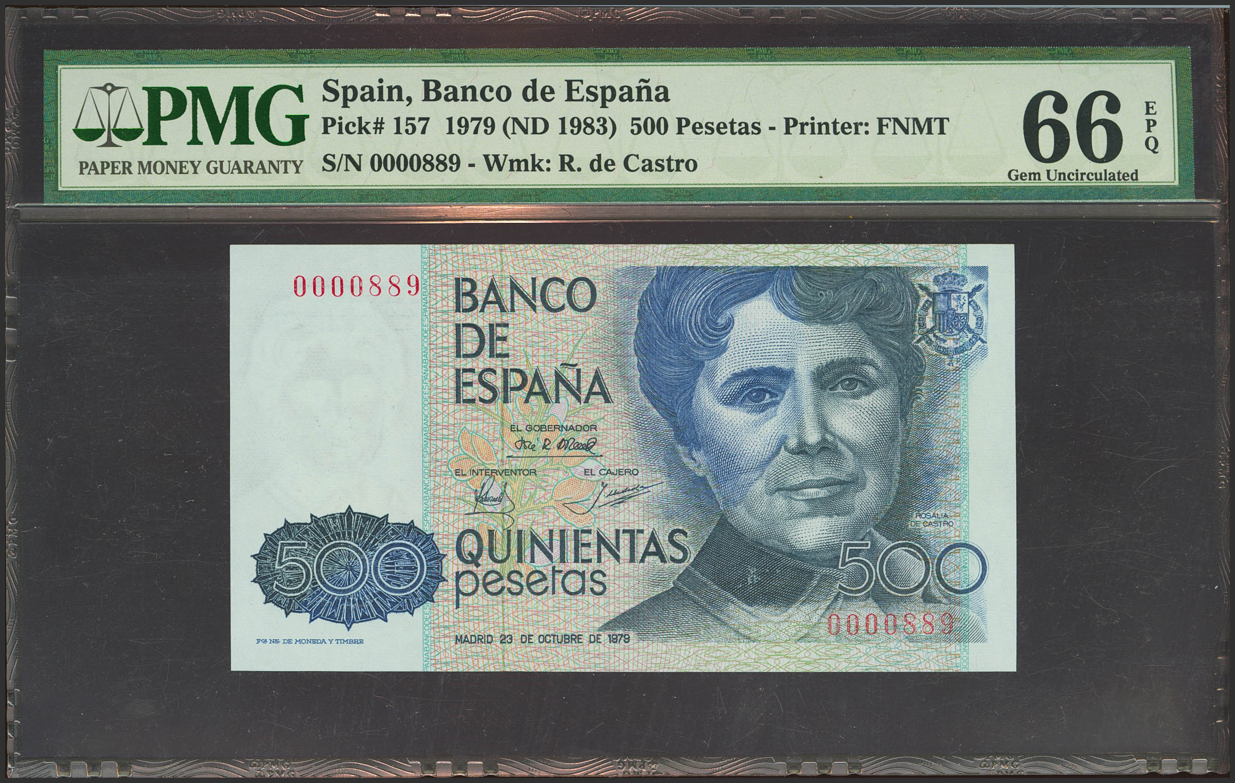 500 Pesetas. 23 de Octubre de 1979. Sin serie y numeración bajísima (Nº0000889). (Edifil 2023: 476, Pick: 157). Inusual en esta calidad. SC. Encapsulado PMG66EPQ.