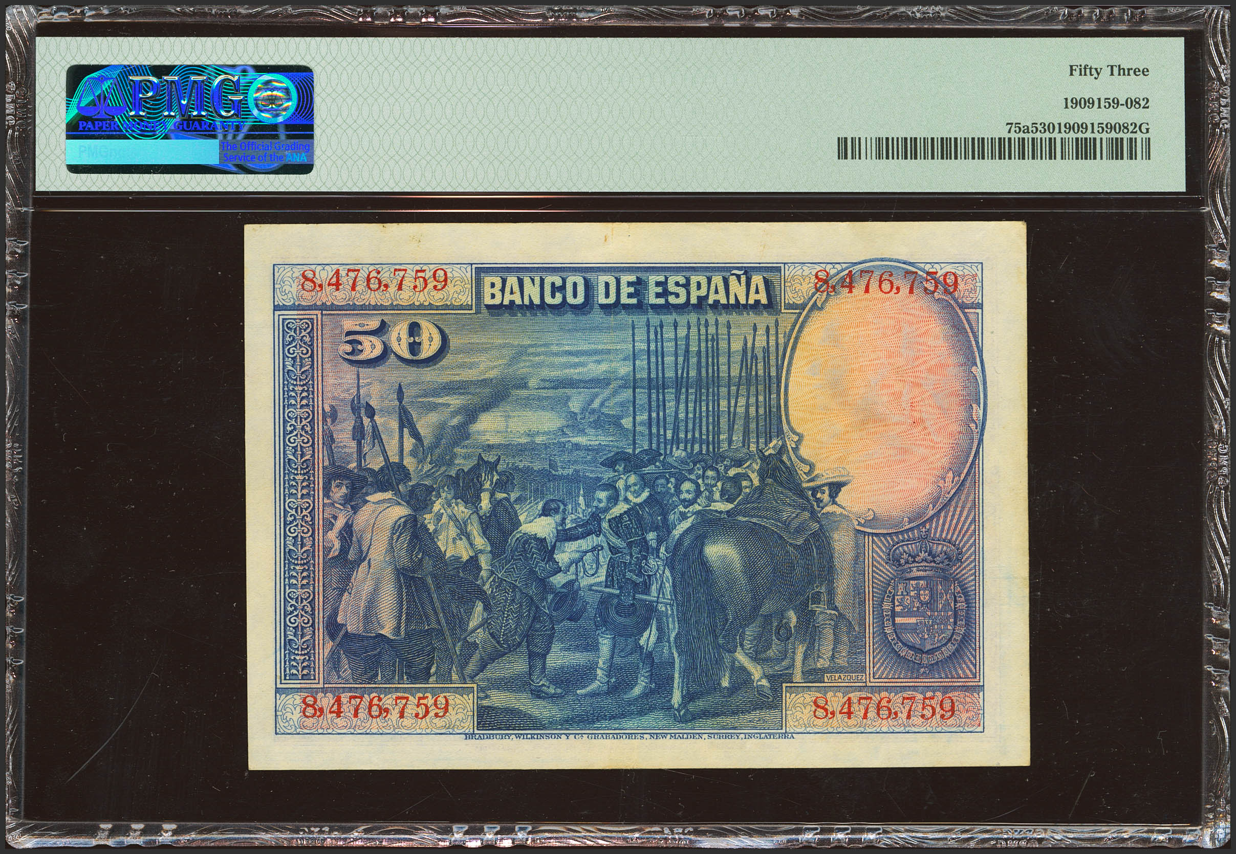 50 Pesetas. 15 de Agosto de 1928. Sin serie. (Edifil 2023: 329, Pick: 75a). Inusual, apresto original. EBC. Encapsulado PMG53.