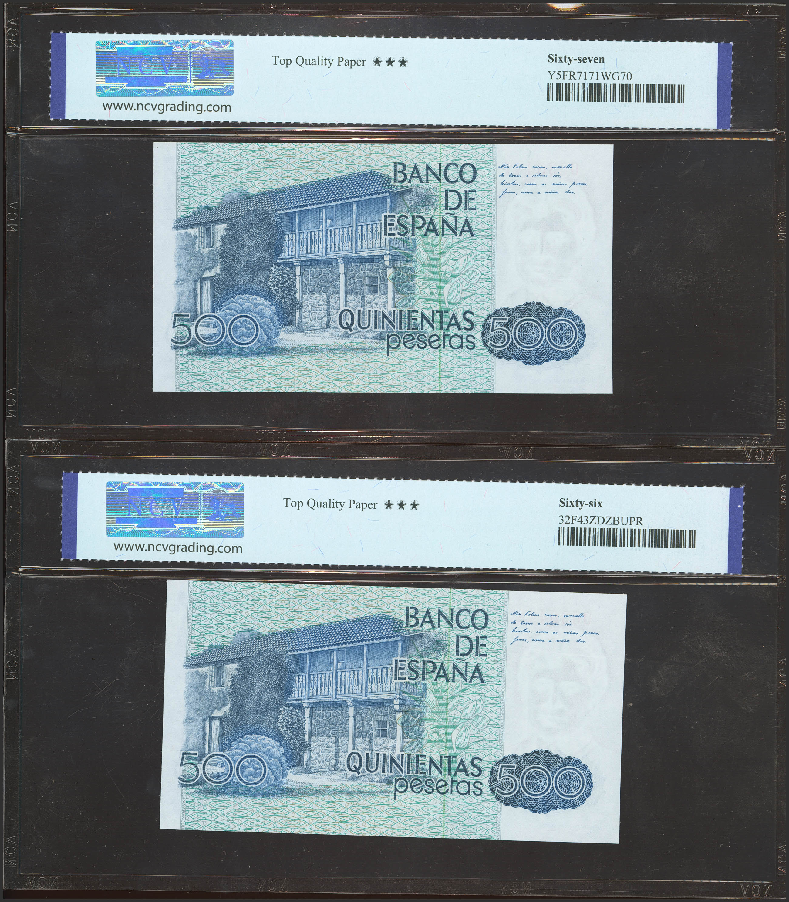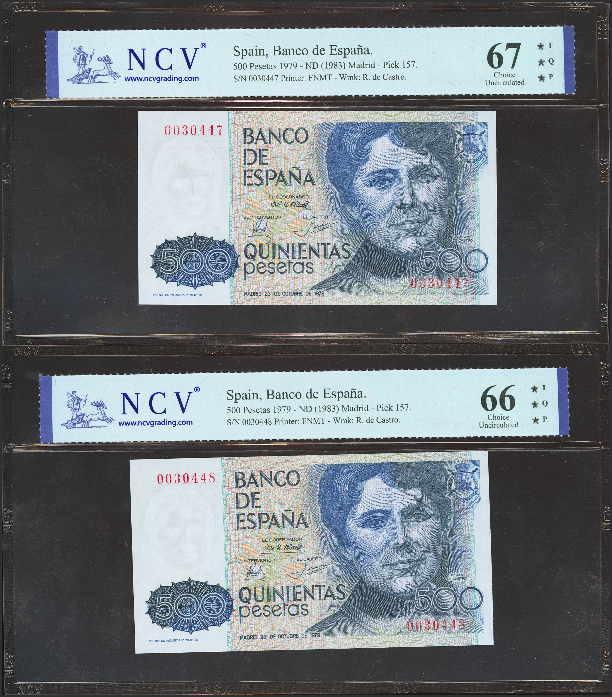 500 Pesetas. 23 de Octubre de 1979. Pareja correlativa. Sin serie y numeración bajísima. (Edifil 2023: 476, Pick: 157). Inusual en esta calidad. SC. Encapsulados NCV66TQP/67TQP.