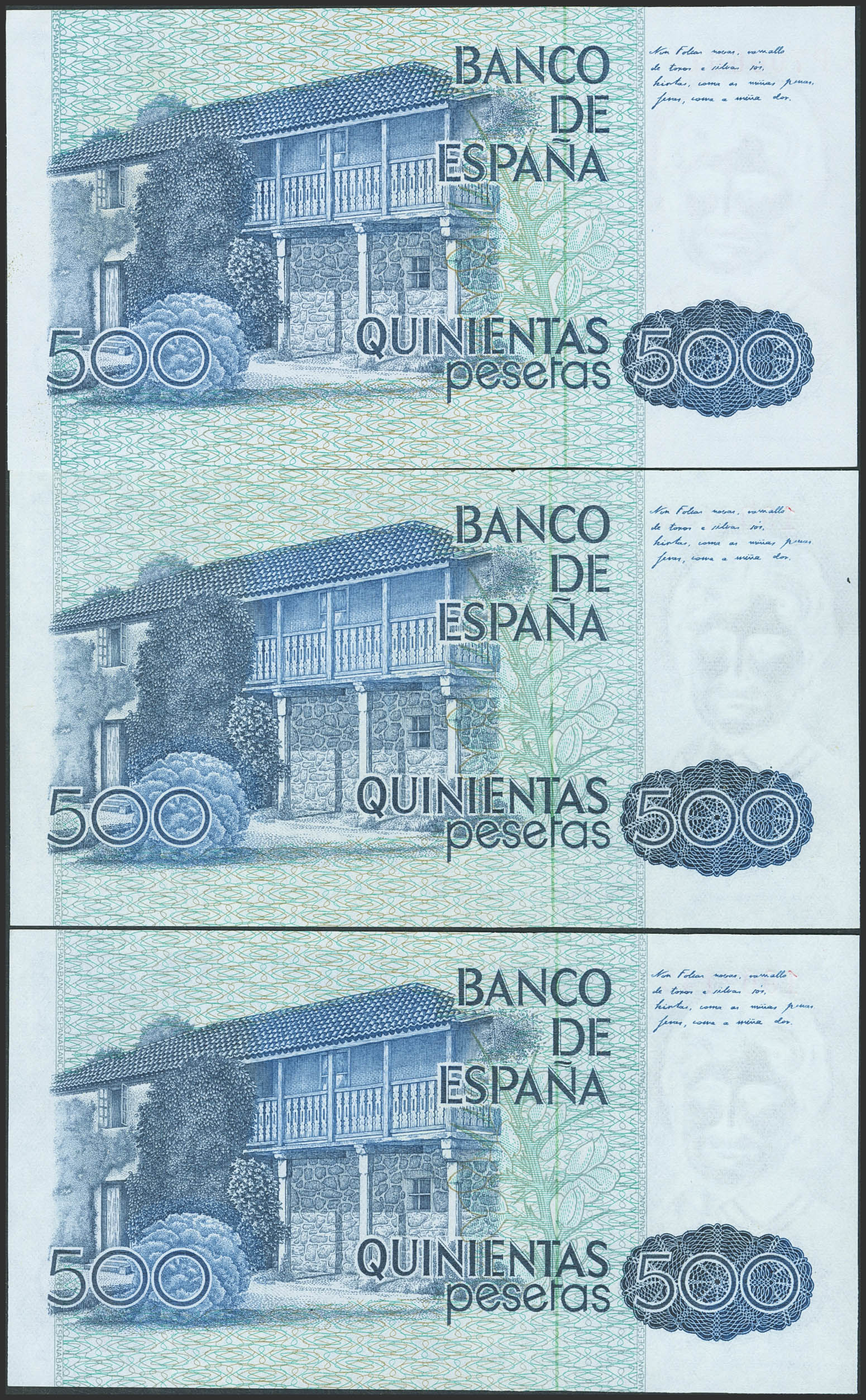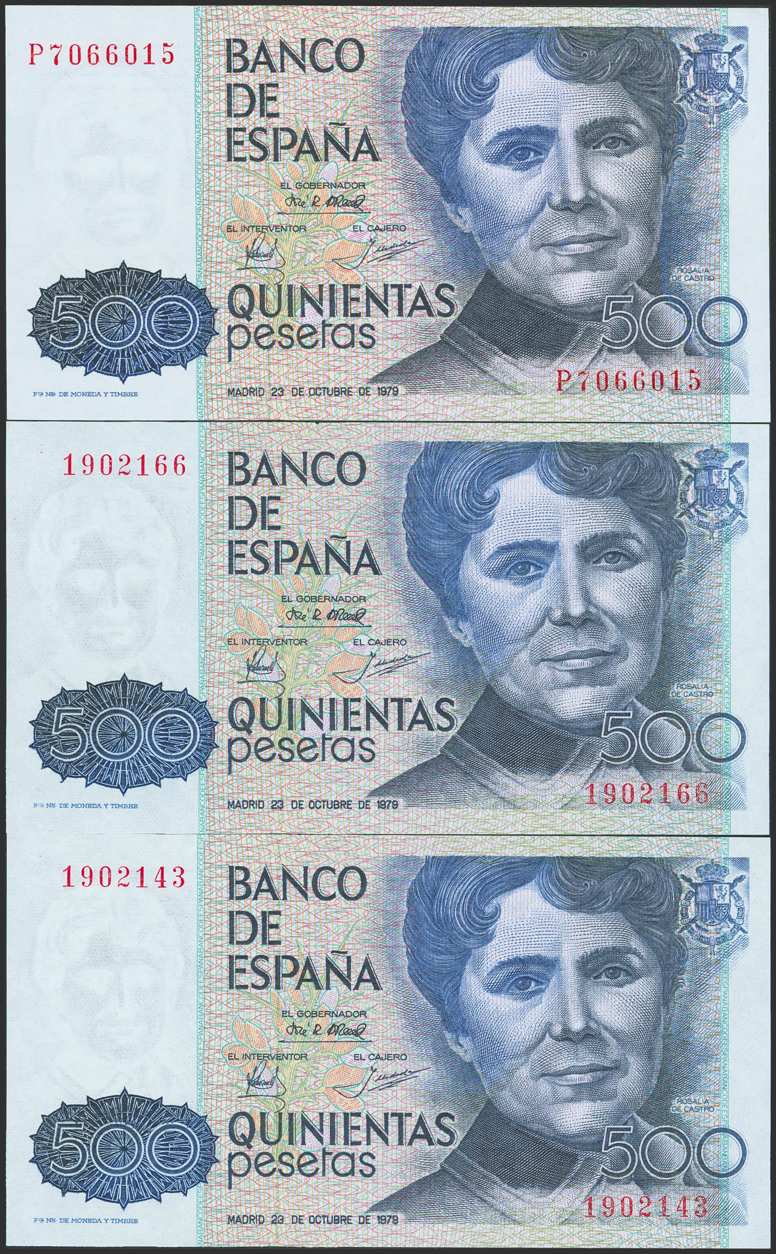 Conjunto de 3 billetes de 500 Pesetas emitidos el 23 de Octubre de 1979, sin serie (2) y serie P. (Edifil 2023: 476). SC.