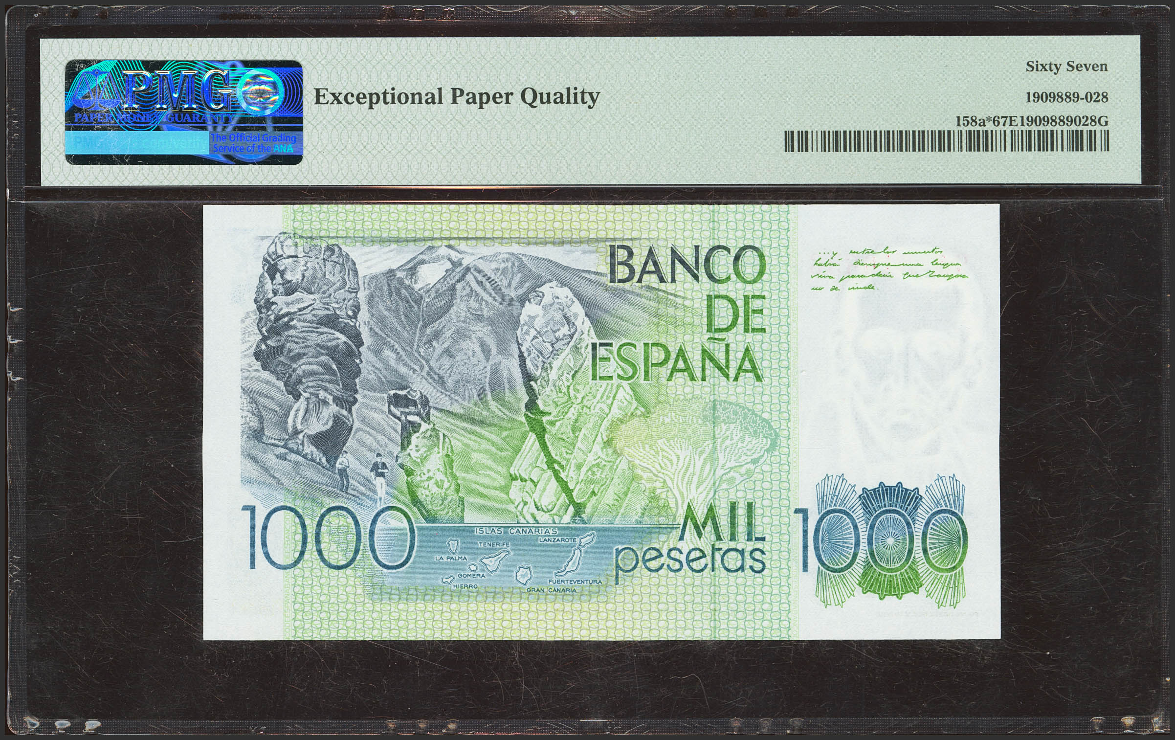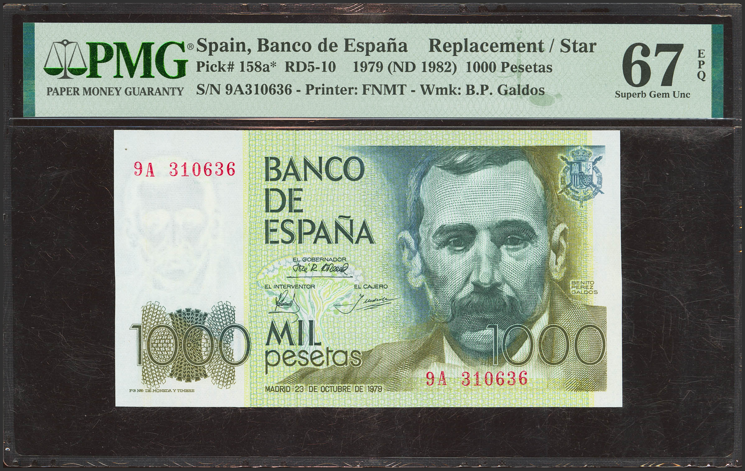 1000 Pesetas. 23 de Octubre de 1979. Serie especial 9A. (Edifil 2021: 477b, Pick: 158a*). Rarísimo en esta excepcional calidad, apresto original. SC. Encapsulado PMG67EPQ.