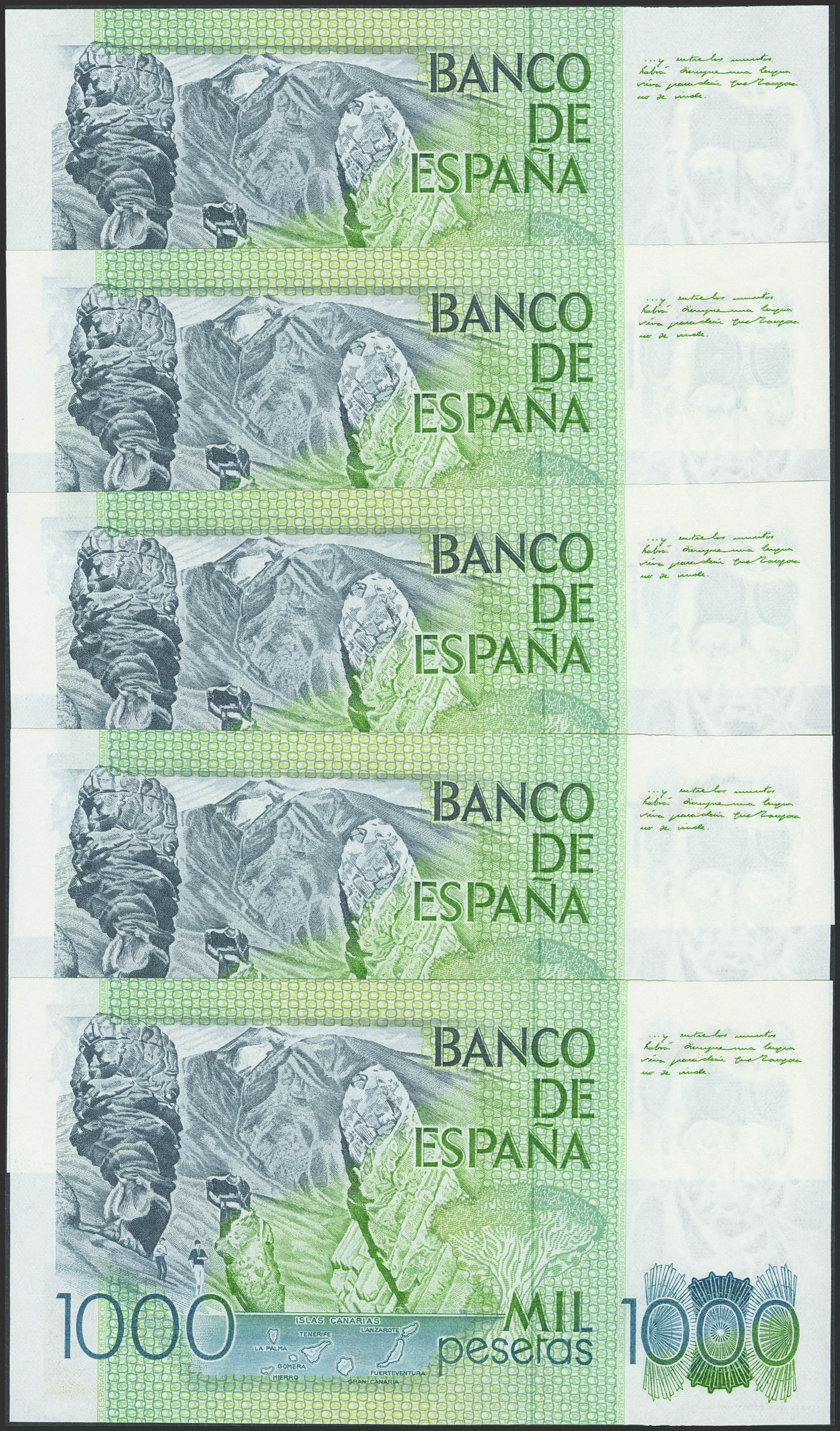 Conjunto de 5 billetes correlativos de 1000 Pesetas emitidos el 23 de Octubre de 1979 y sin serie. (Edifil 2023: 477). SC.