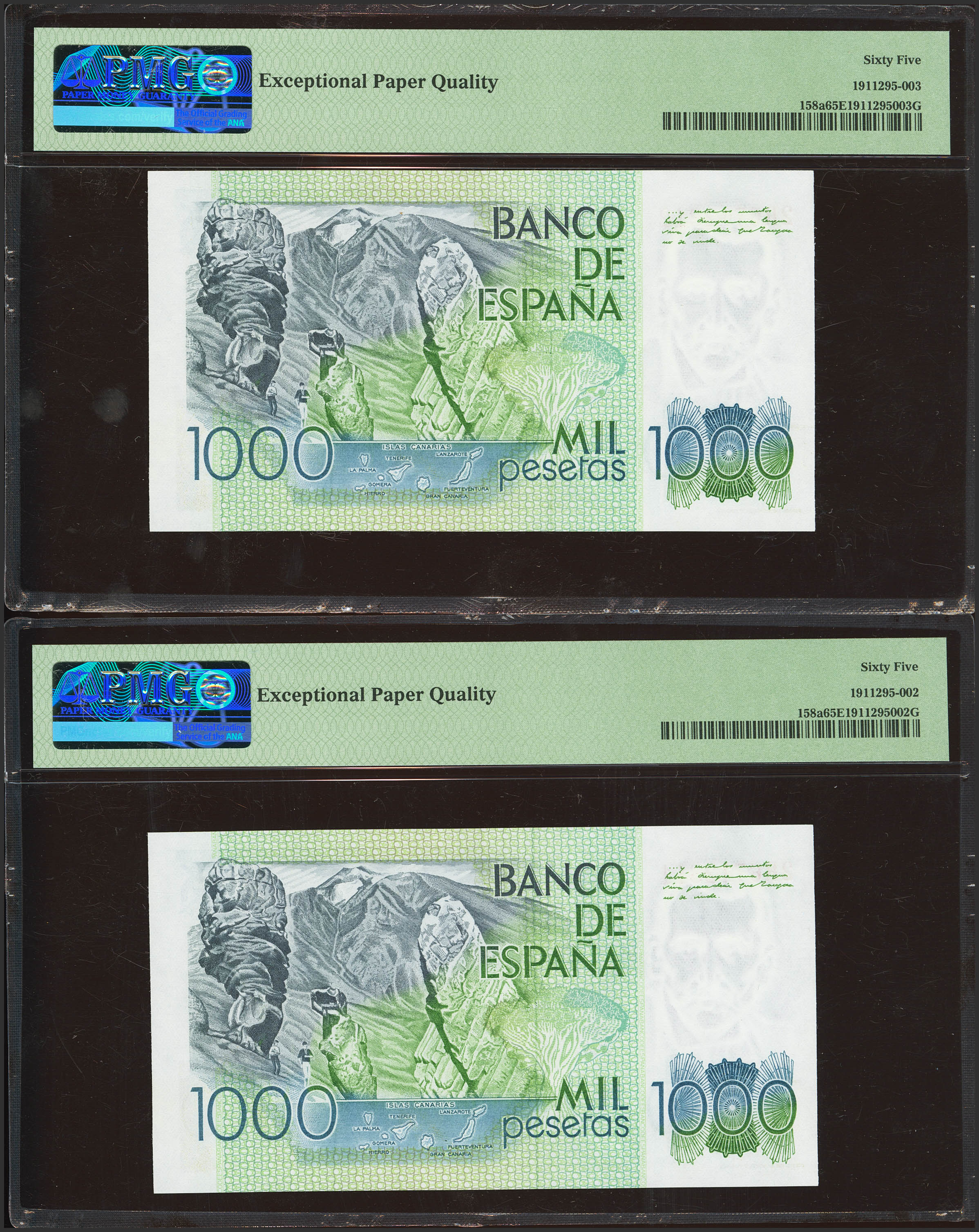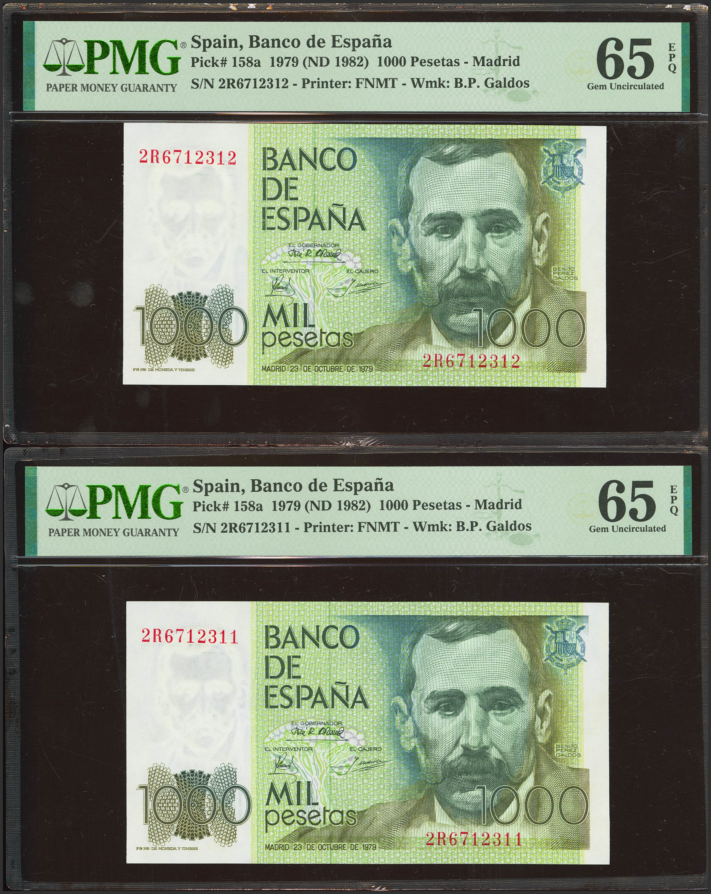 1000 Pesetas. 23 de Octubre de 1979. Pareja correlativa. Serie 2R. (Edifil 2023: 477a, Pick: 158). SC. Encapsulados PMG65EPQ, ambos.