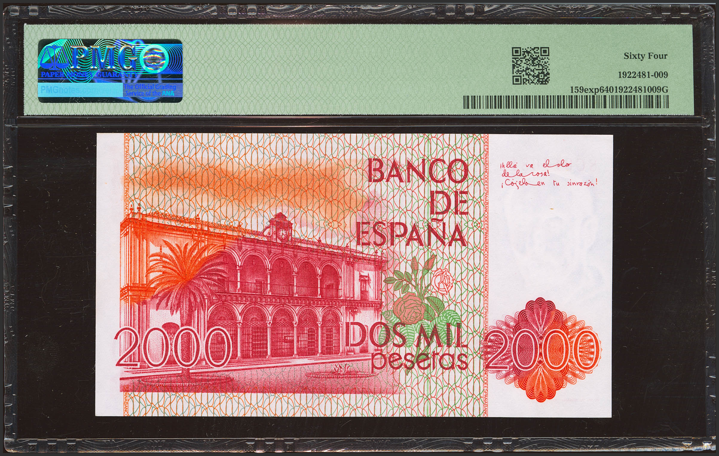 2000 Pesetas. 22 de Julio de 1980. Serie especial 8C. (Edifil 2023: 479c, Pick: 159exp). Extraordinariamente rara serie, para hacernos una idea de su rareza con la información estadística que disponemos nos atrevemos a afirmar que se trata, al menos, de una rareza tan importante como la serie 9B de Rosalía de Castro, apresto original. SC. Encapsulado PMG64.
