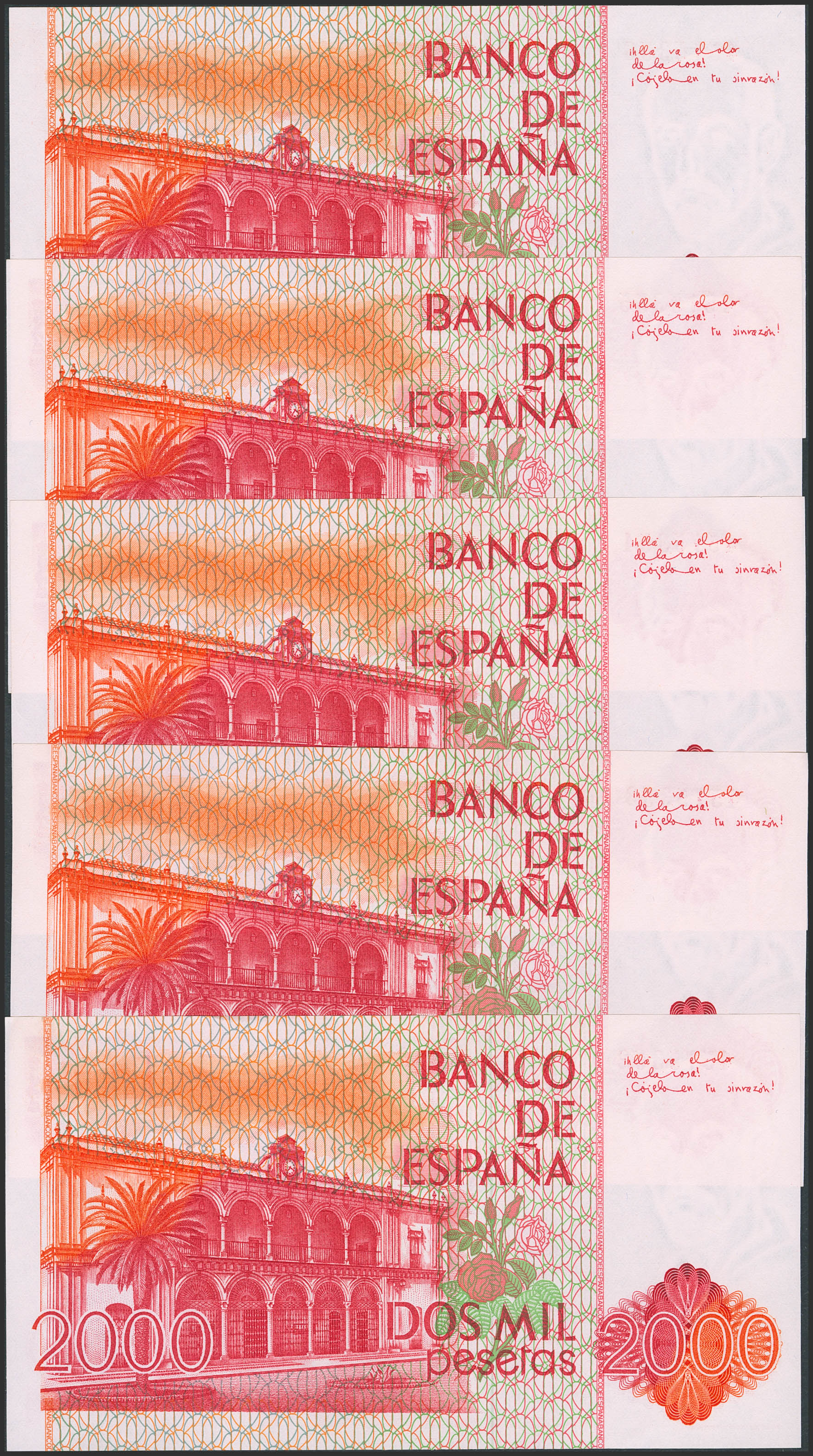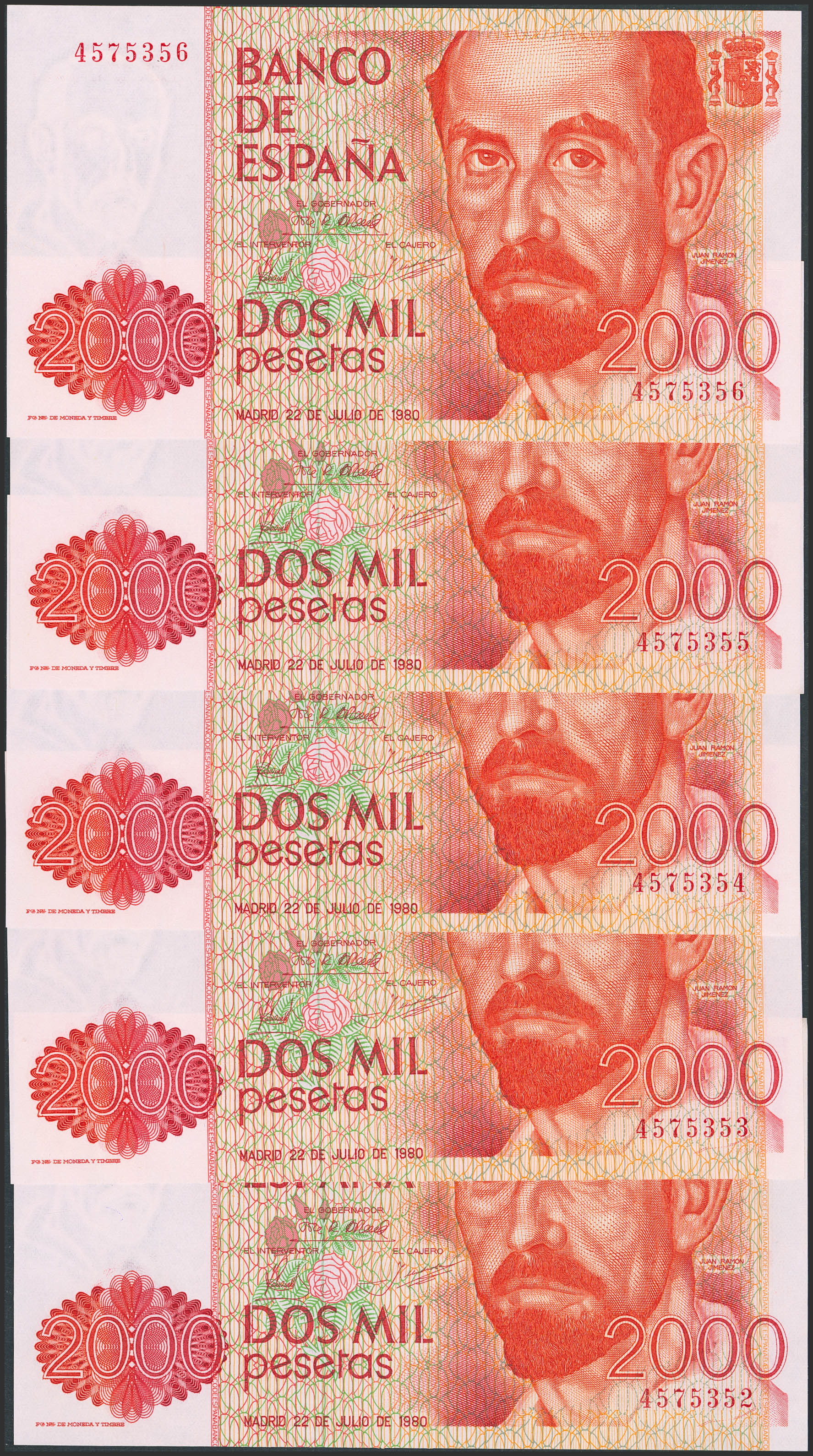 Conjunto de 5 de billetes correlativos de 2000 Pesetas emitidos el 22 de Julio de 1980 y sin serie. (Edifil 2023: 479). SC-/SC.