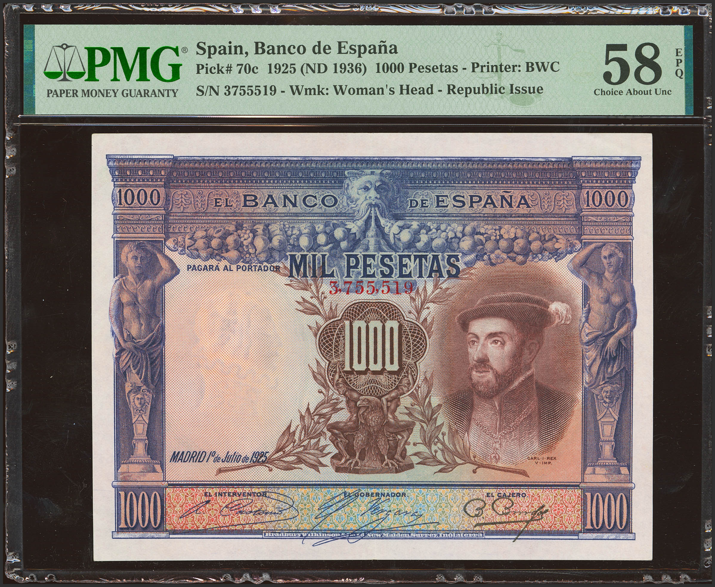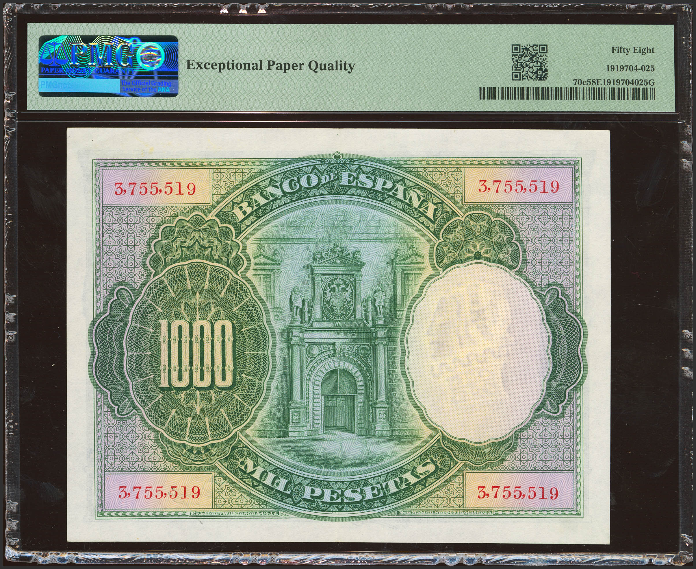 1000 Pesetas. 1 de Julio de 1925. Sin serie y numeración superior al 3646000. (Edifil 2023: 351, Pick: 70c). Inusual en esta calidad, apresto original. EBC+++. Encapsulado PMG58EPQ.