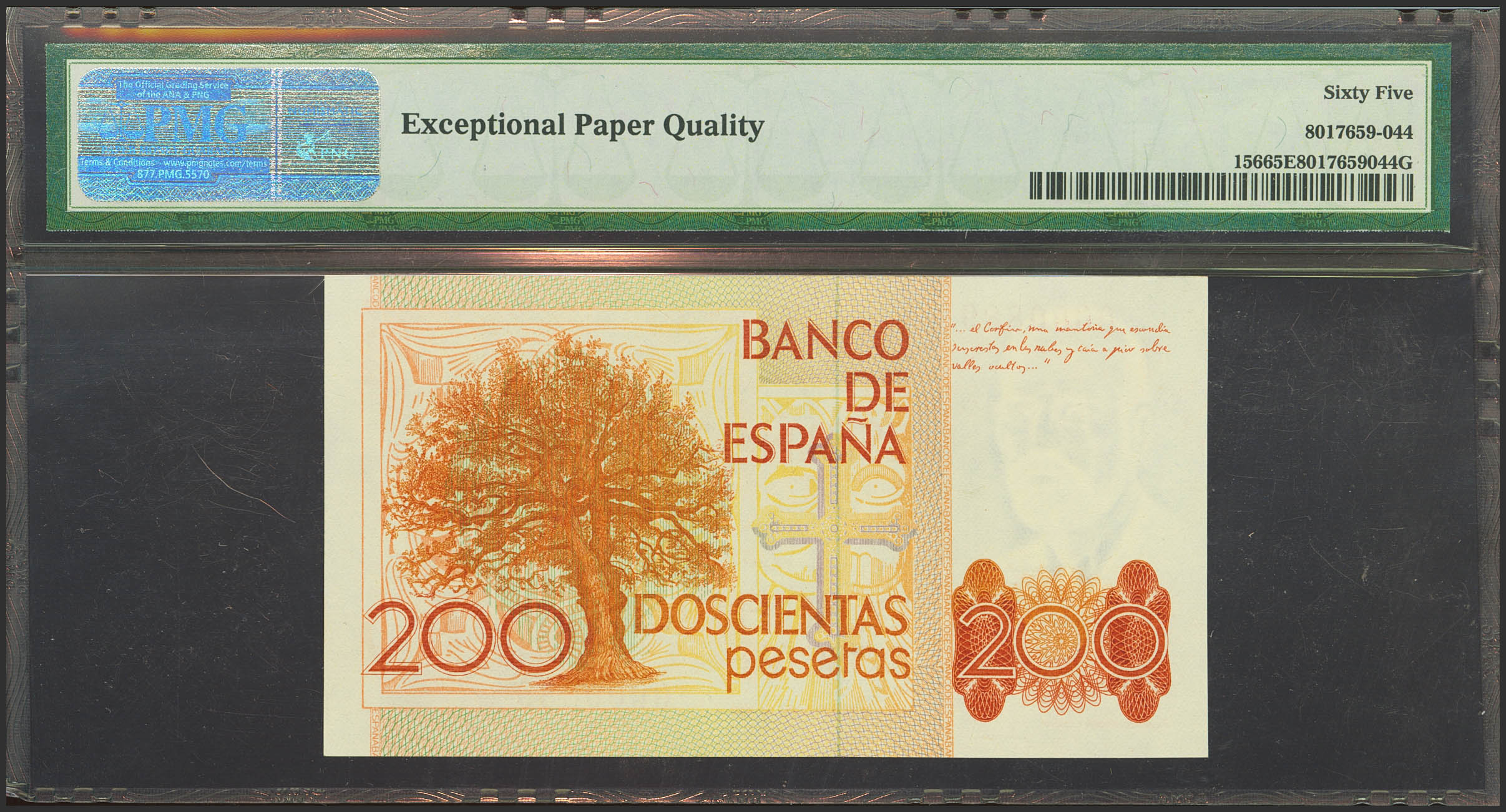 200 Pesetas. 16 de Septiembre de 1980. Sin serie y numeración bajísima (Nº0000889). (Edifil 2023: 480, Pick: 156). SC. Encapsulado PMG65EPQ.
