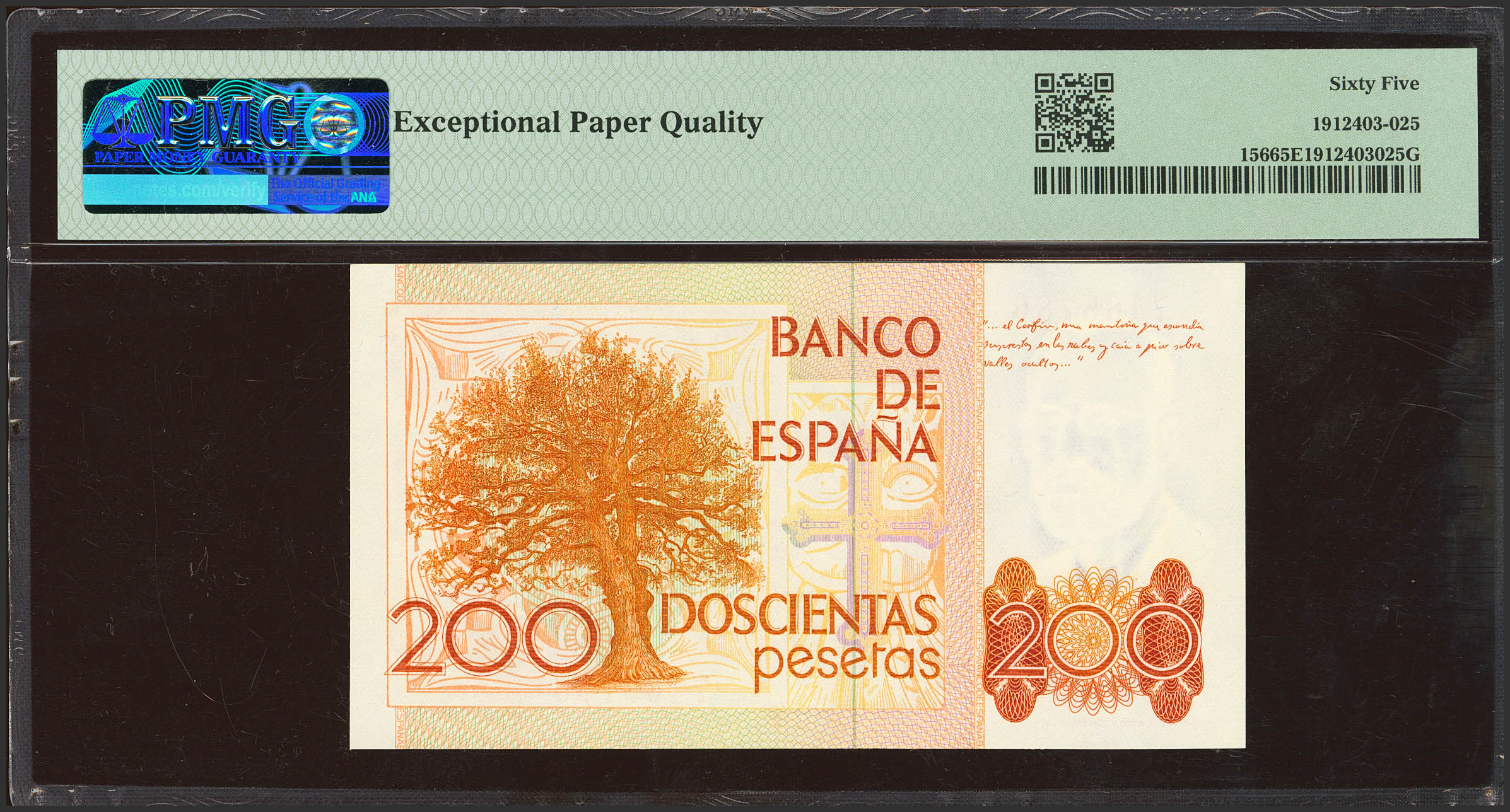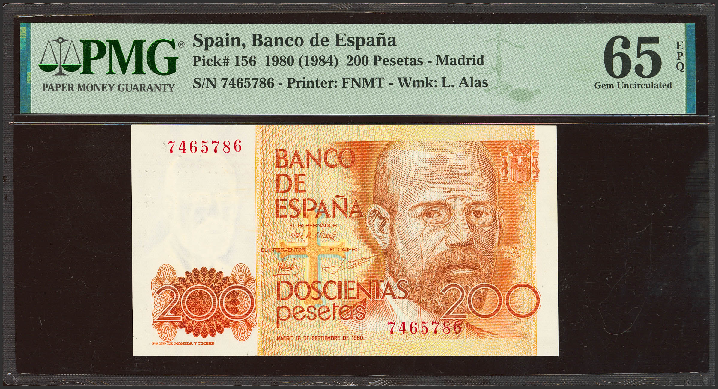 200 Pesetas. 16 de Septiembre de 1980. Sin serie. (Edifil 2023: 480, Pick: 156). SC. Encapsulado PMG65EPQ.