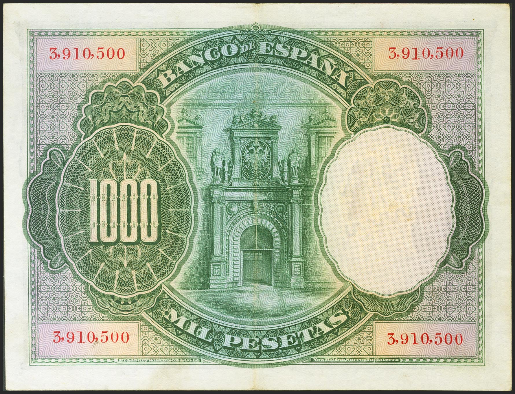 1000 Pesetas. 1 de Julio de 1925. Sin serie y numeración posterior al 3646000. (Edifil 2021: 351). Conserva gran parte del apresto original. EBC.