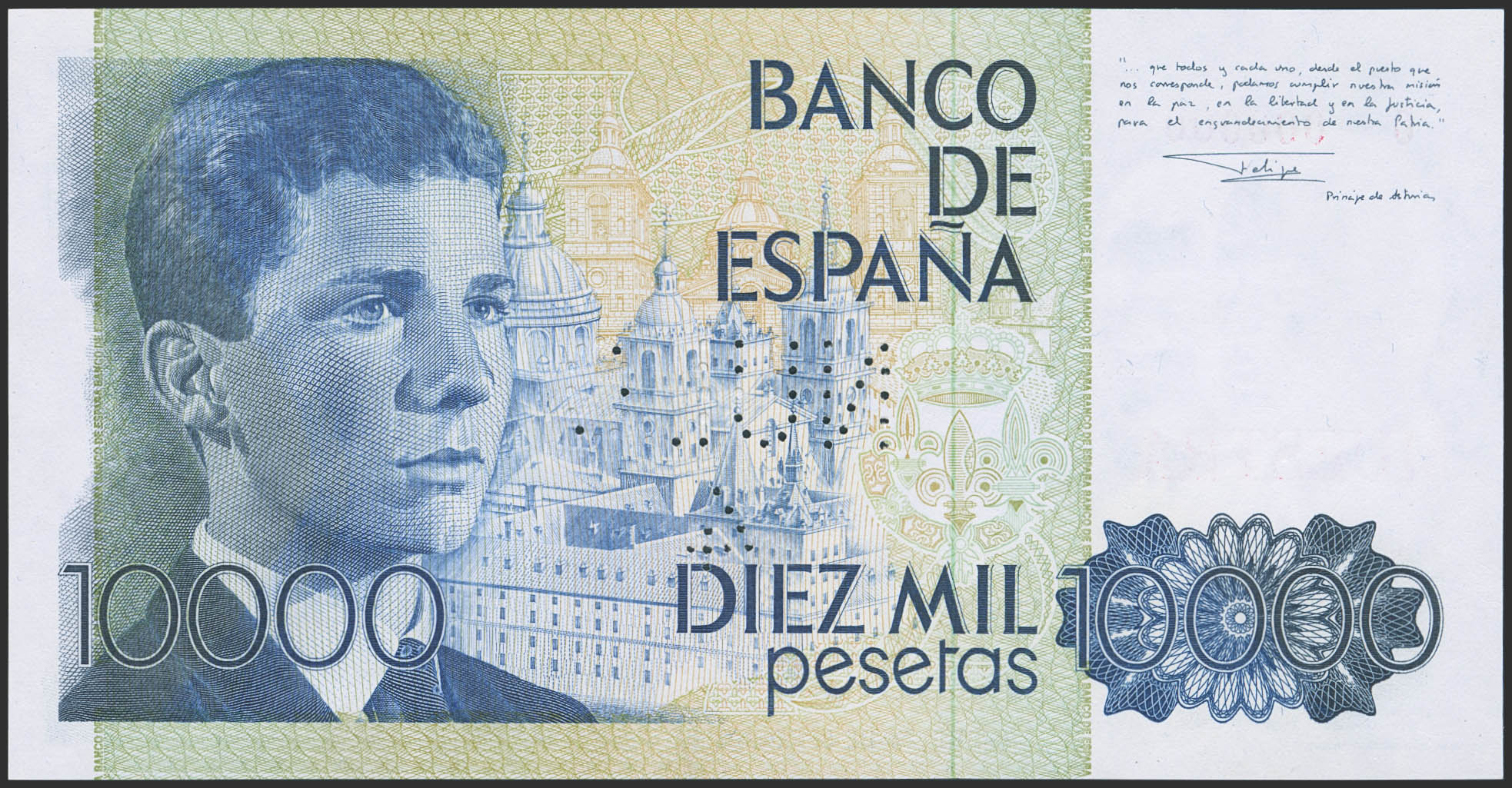 10000 Pesetas. 24 de Septiembre de 1985. Serie 0 y numeración 000000 con perforación "NULO 4 ". (Edifil 2021: 481M). Apresto original, rarísimo con esta configuración del numerador. SC.
