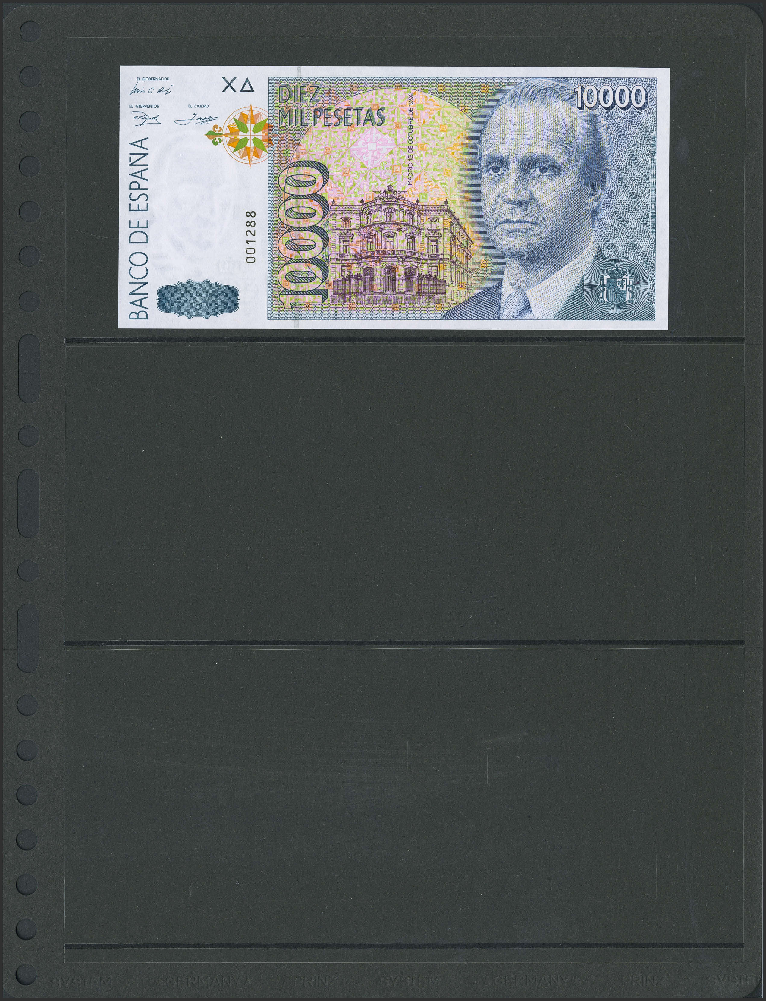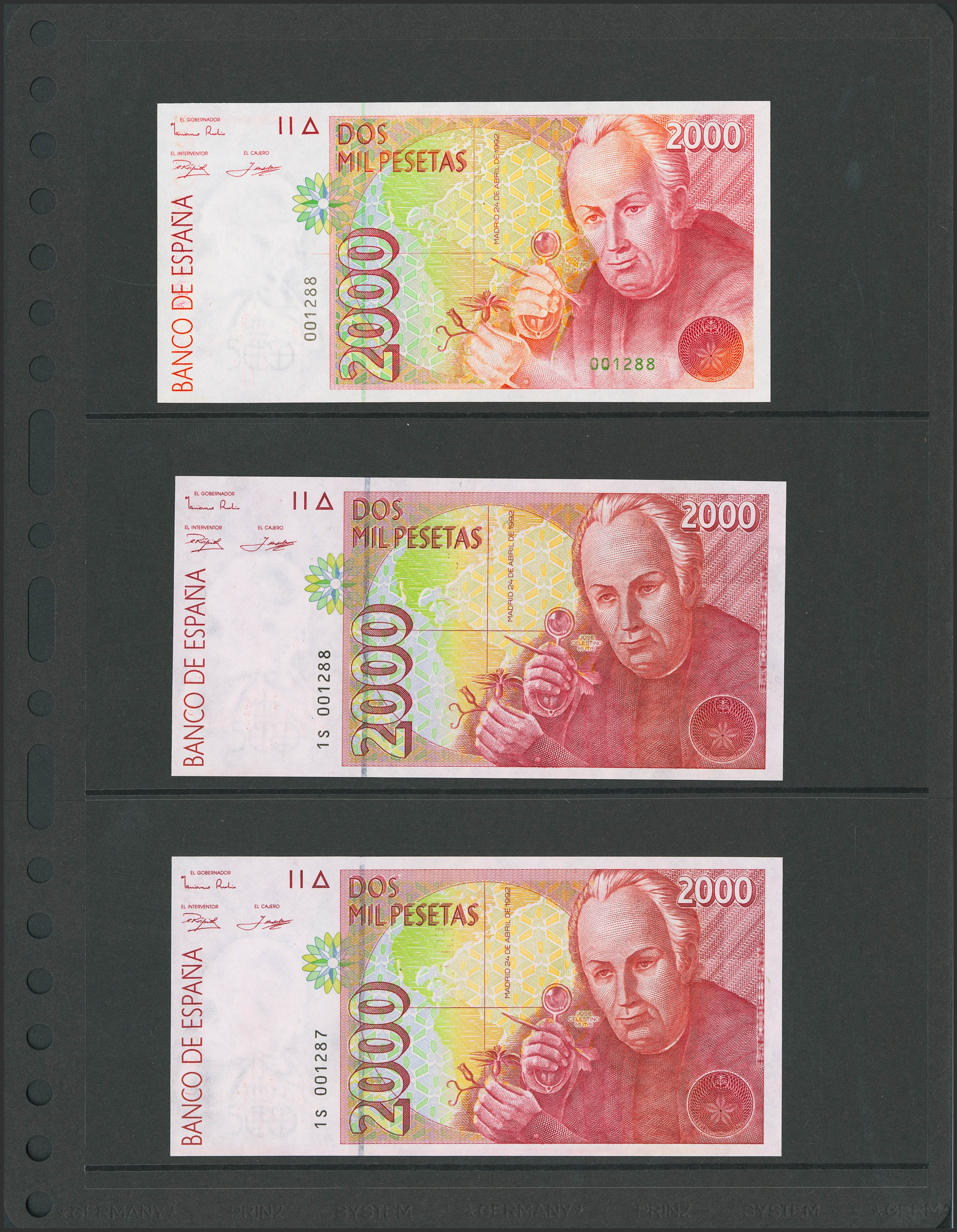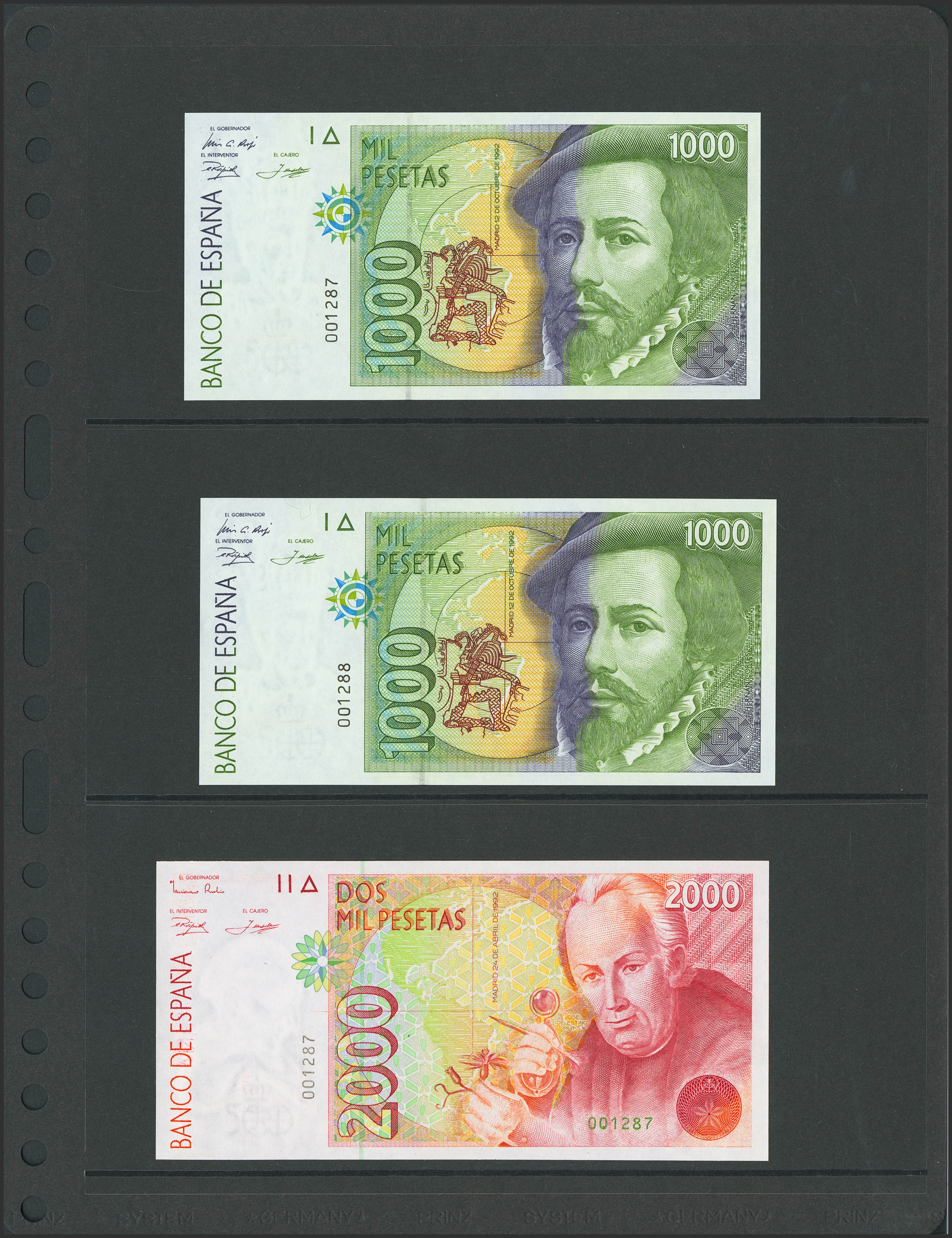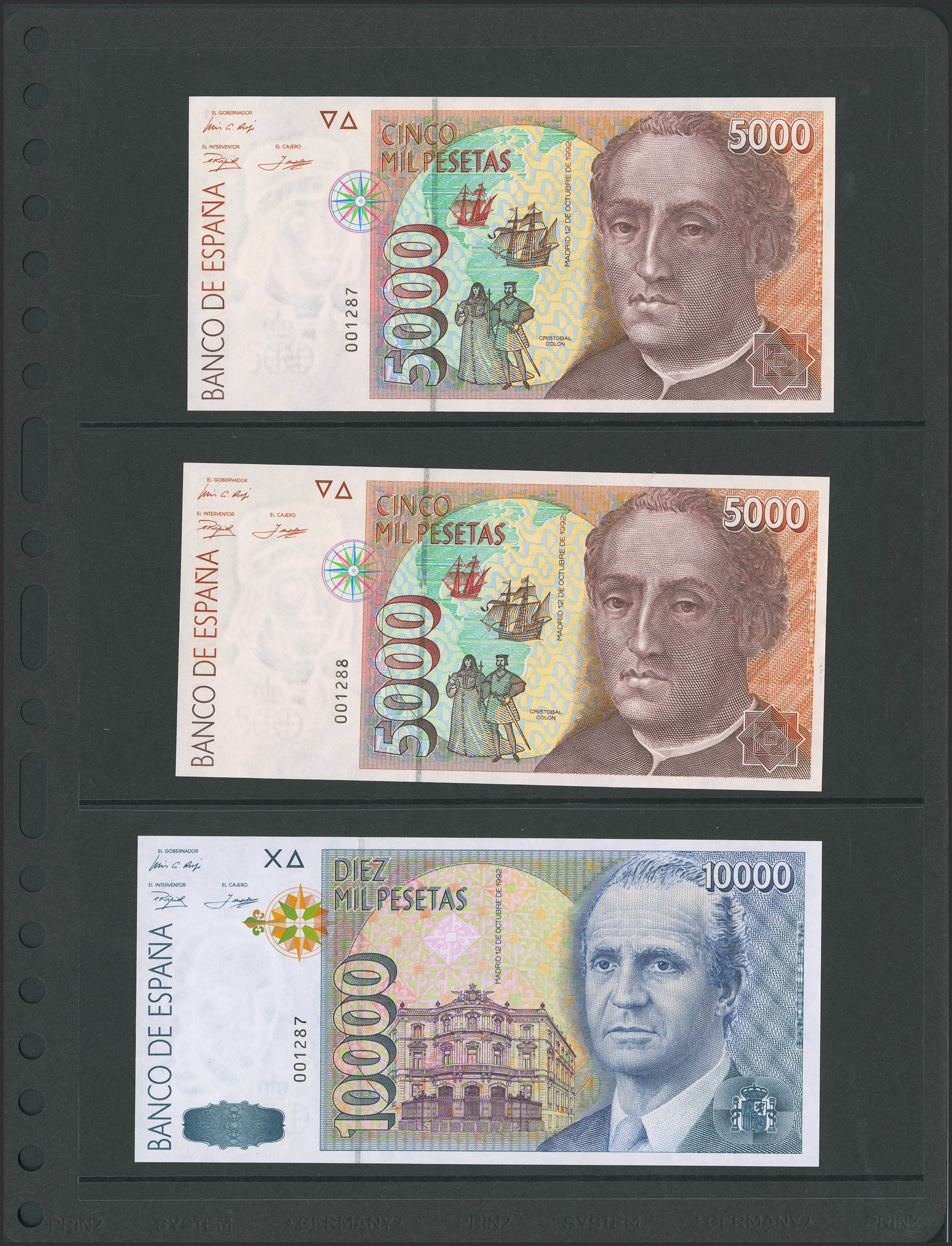 Serie completa en pareja correlativa de los billetes de 1000 Pesetas, 2000 Pesetas (además otro con la numeración 1S), 5000 Pesetas y 10000 Pesetas emitidos en 1992, todos ellos con el mismo número de serie Nº0001287 y 0001288. (Edifil 2023: 482/85, 482A). Raro conjunto. SC-.
