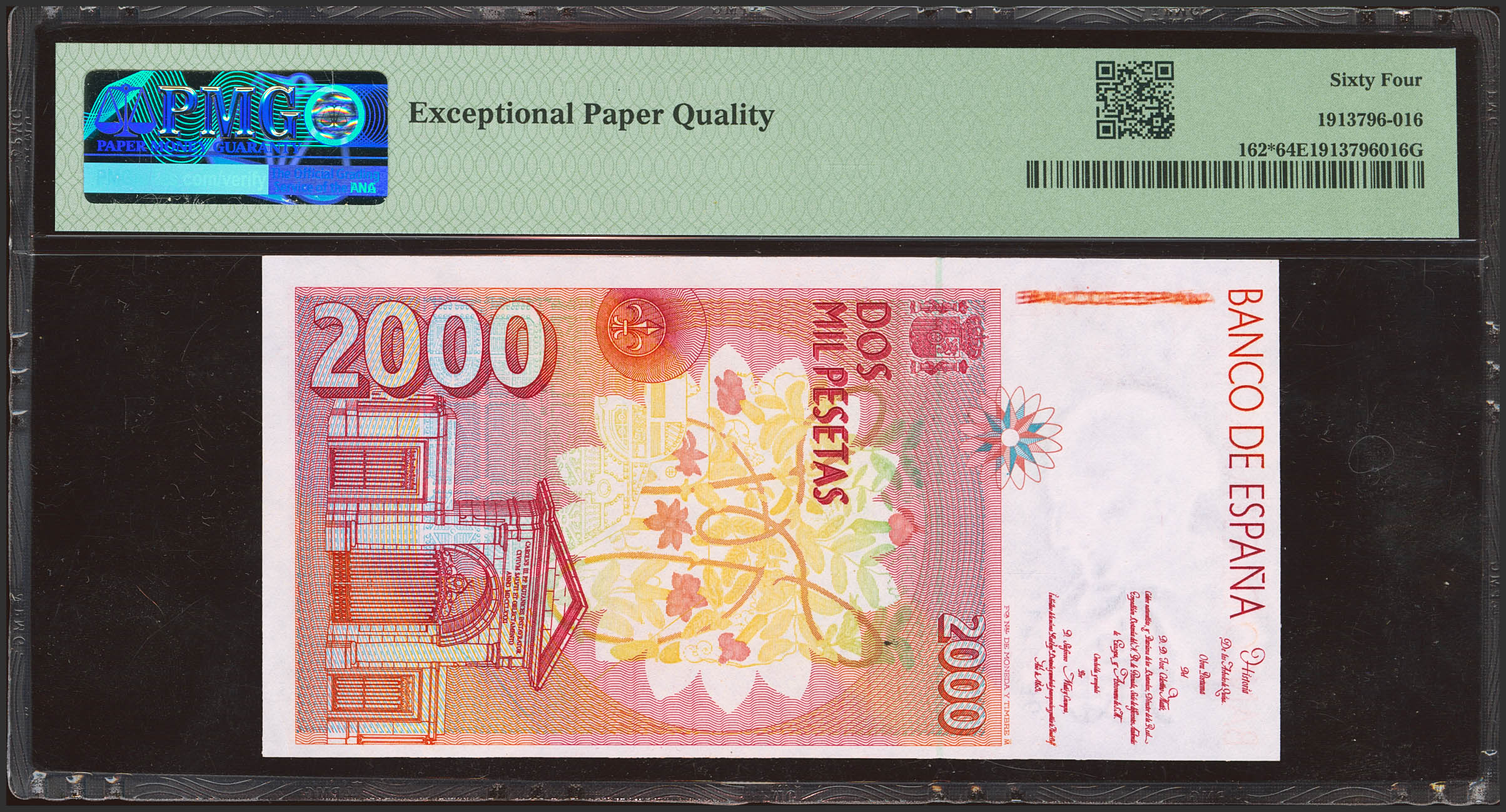 2000 Pesetas. 24 de Abril de 1992. Serie especial 9B. (Edifil 2023: 482c, Pick: 162*). Extraordinariamente rara serie, especialmente en esta excepcional calidad. SC. Encapsulado PMG64EPQ.