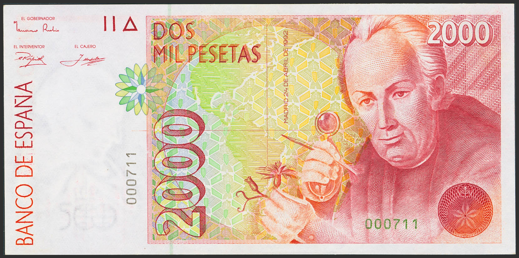 2000 Pesetas. 24 de Abril de 1992. Sin serie y numeración bajísima (Nº000711). (Edifil 2023: 482). SC.