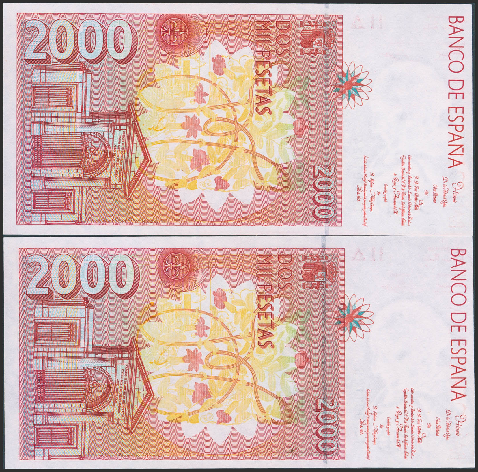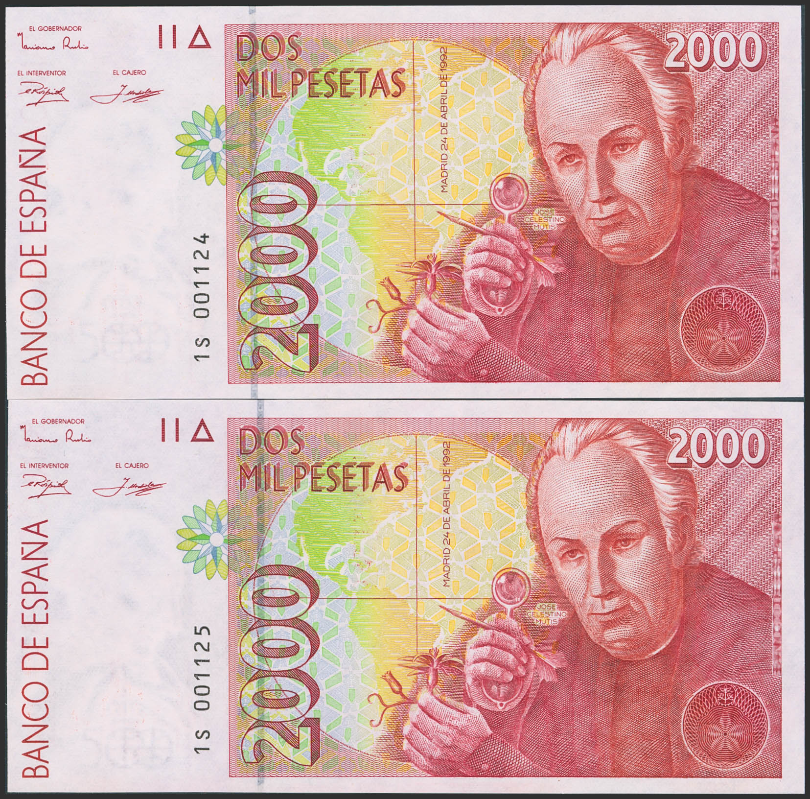 2000 Pesetas. 24 de Abril de 1992. Pareja correlativa. Serie 1S. (Edifil 2023: 482A). SC.