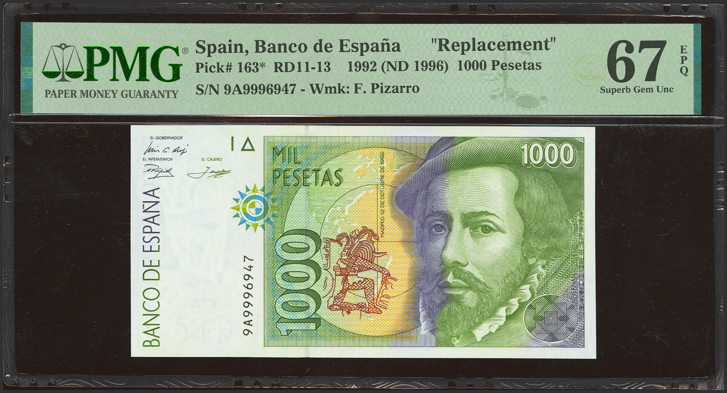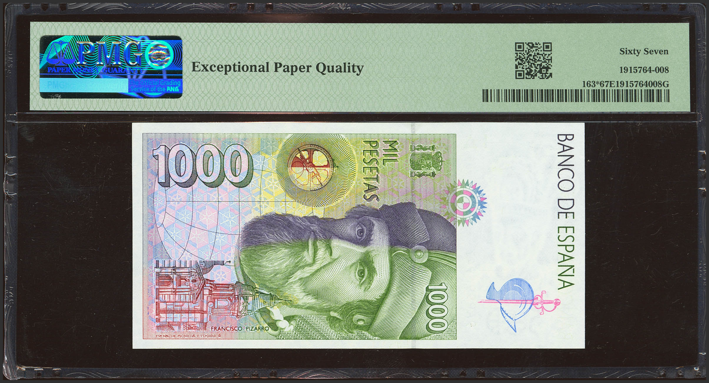 1000 Pesetas. 12 de Octubre de 1992. Serie especial 9A. (Edifil 2023: 483c, Pick: 163*). Apresto original. SC. Encapsulado PMG67EPQ.