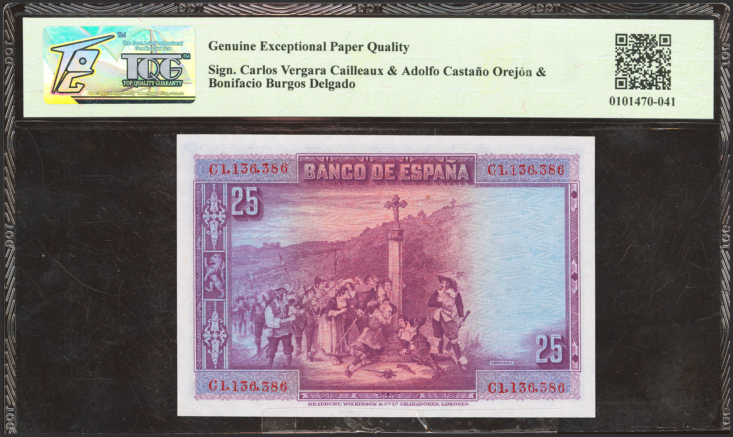 25 Pesetas. 15 de Agosto de 1928. Serie E. (Edifil 2023: 353, Pick: 74b). Inusual en esta calidad, apresto original. SC. Encapsulado TQG66GEPQ.