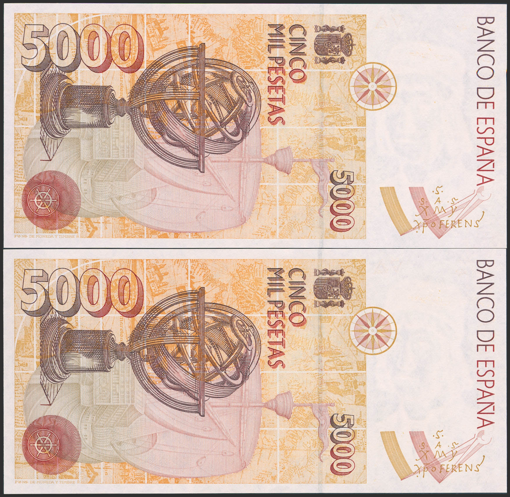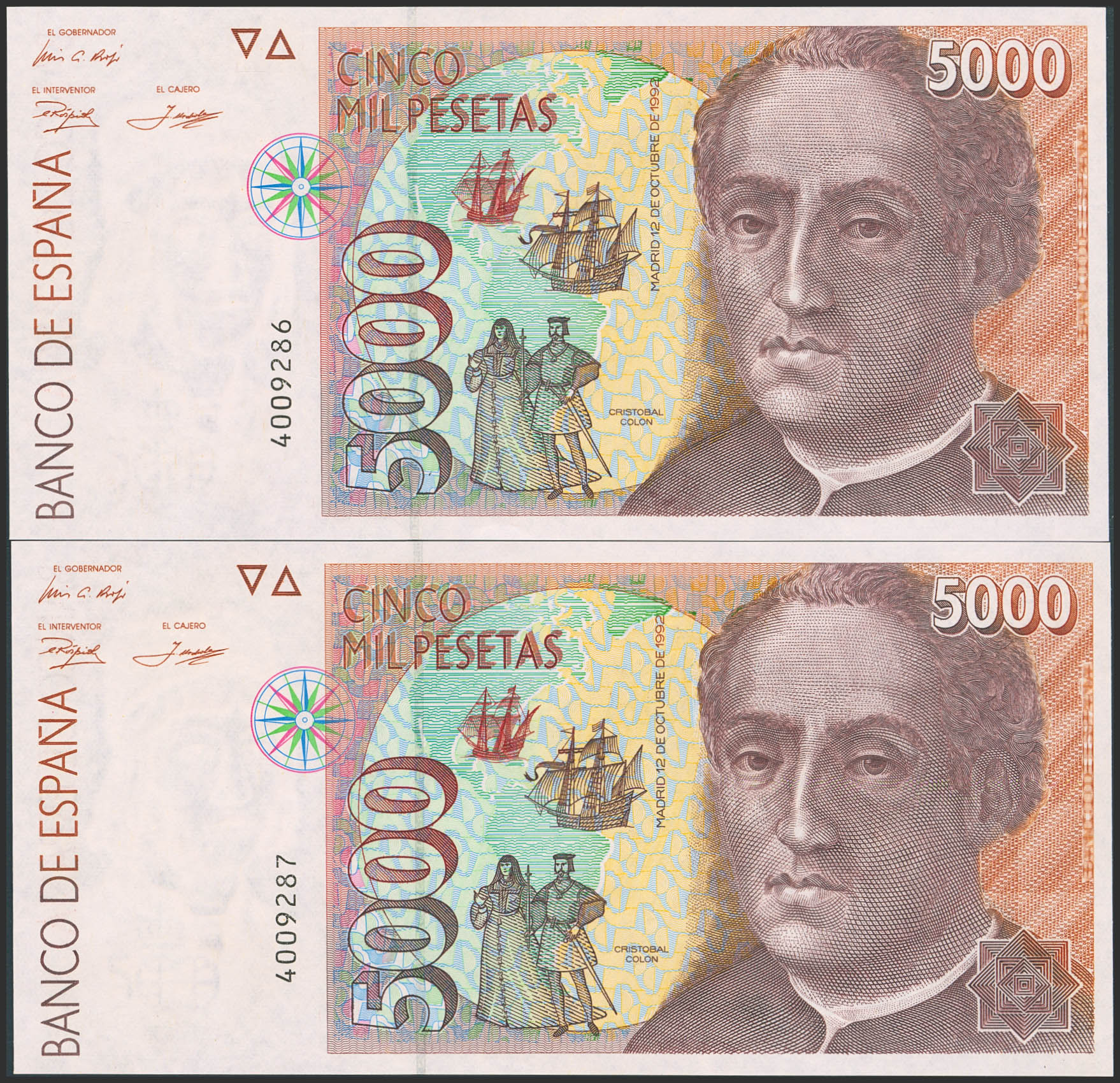 5000 Pesetas. 12 de Octubre de 1992. Pareja correlativa. Sin serie. (Edifil 2023: 484). SC.