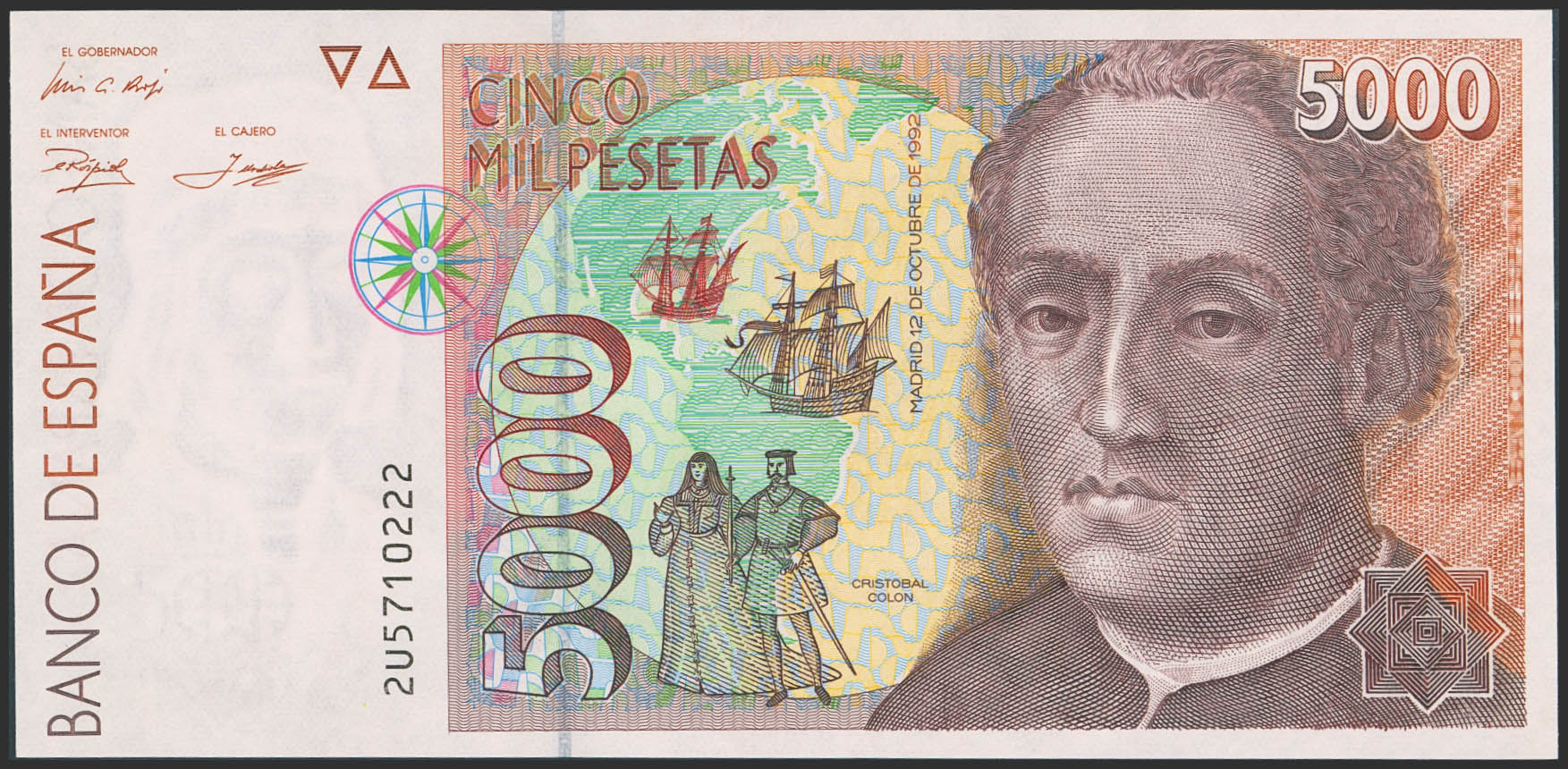 5000 Pesetas. 12 de Octubre de 1992. Serie 2U. (Edifil 2023: 484a). SC.