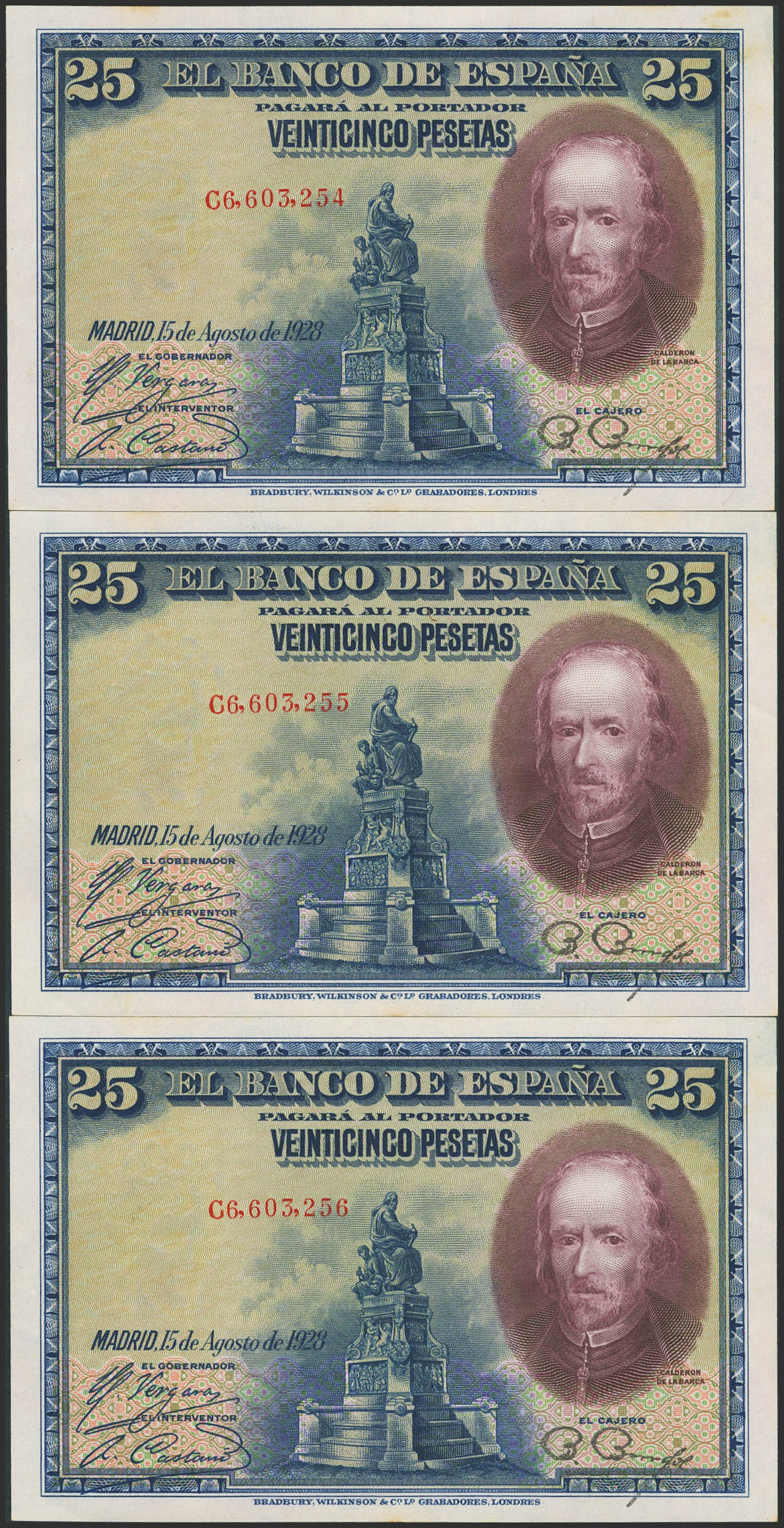 25 Pesetas. 15 de Agosto de 1928. Trío correlativo. Serie E. (Edifil 2021: 353). Conserva todo su apresto original. SC-.