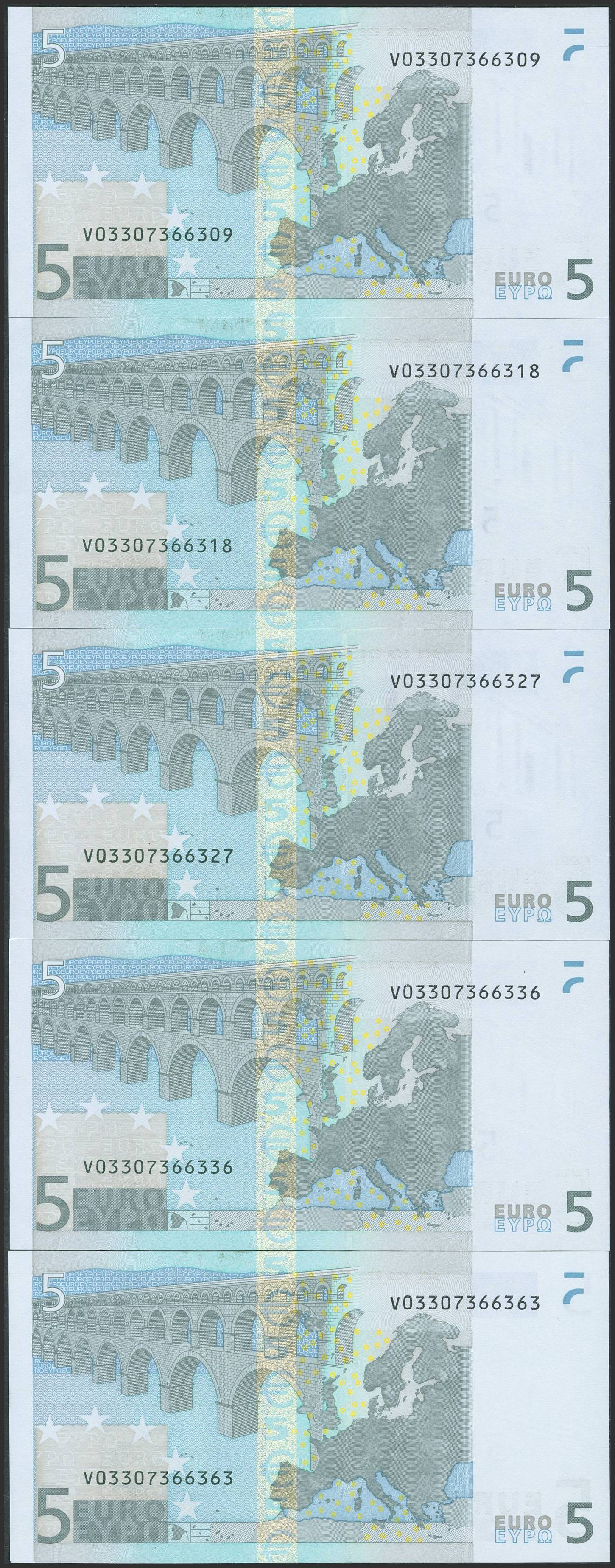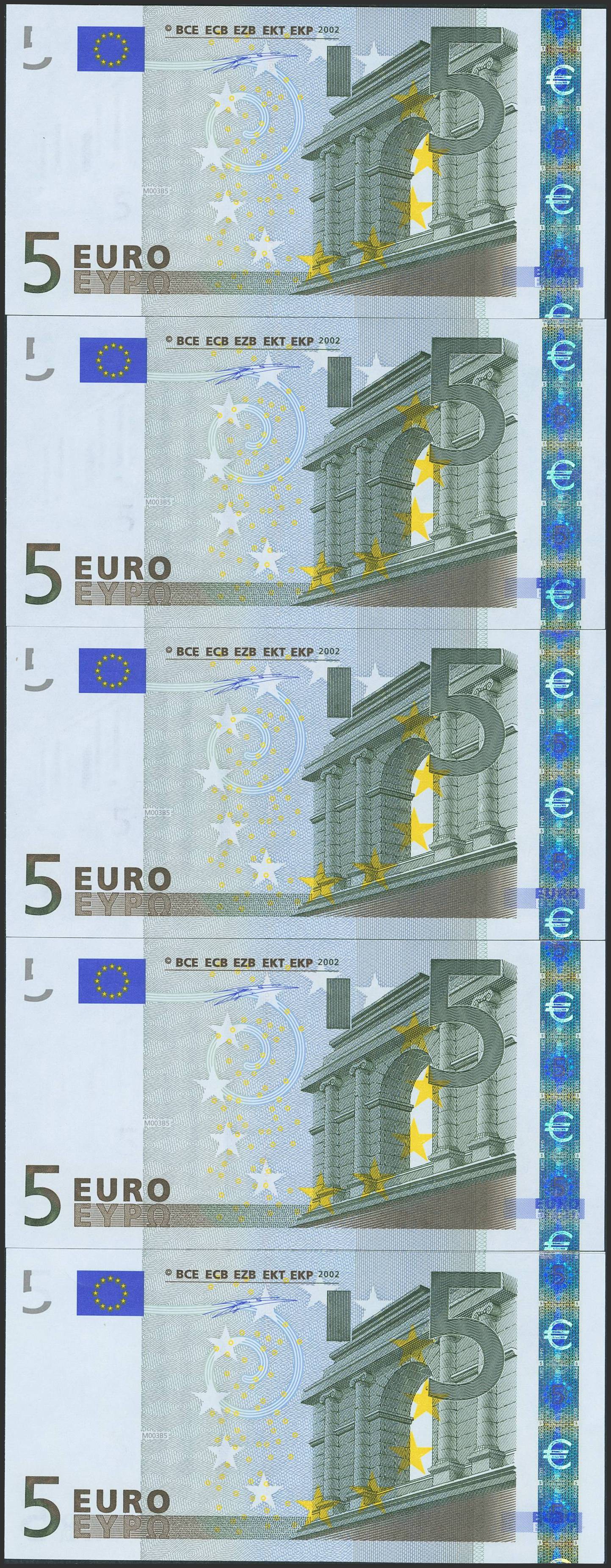 Conjunto de 4 billetes correlativos y un billete de 5 Euros, emitidos el 1 de Enero de 2002 (cabe recordar que el último dígito de la numeración de todos los billetes denominados en euros es para control interno del Banco Central Europeo, el que marca la correlatividad de los billetes es el penúltimo dígito) con la Firma Duisenberg y la serie V (España). (Edifil 2023: 486). SC.
