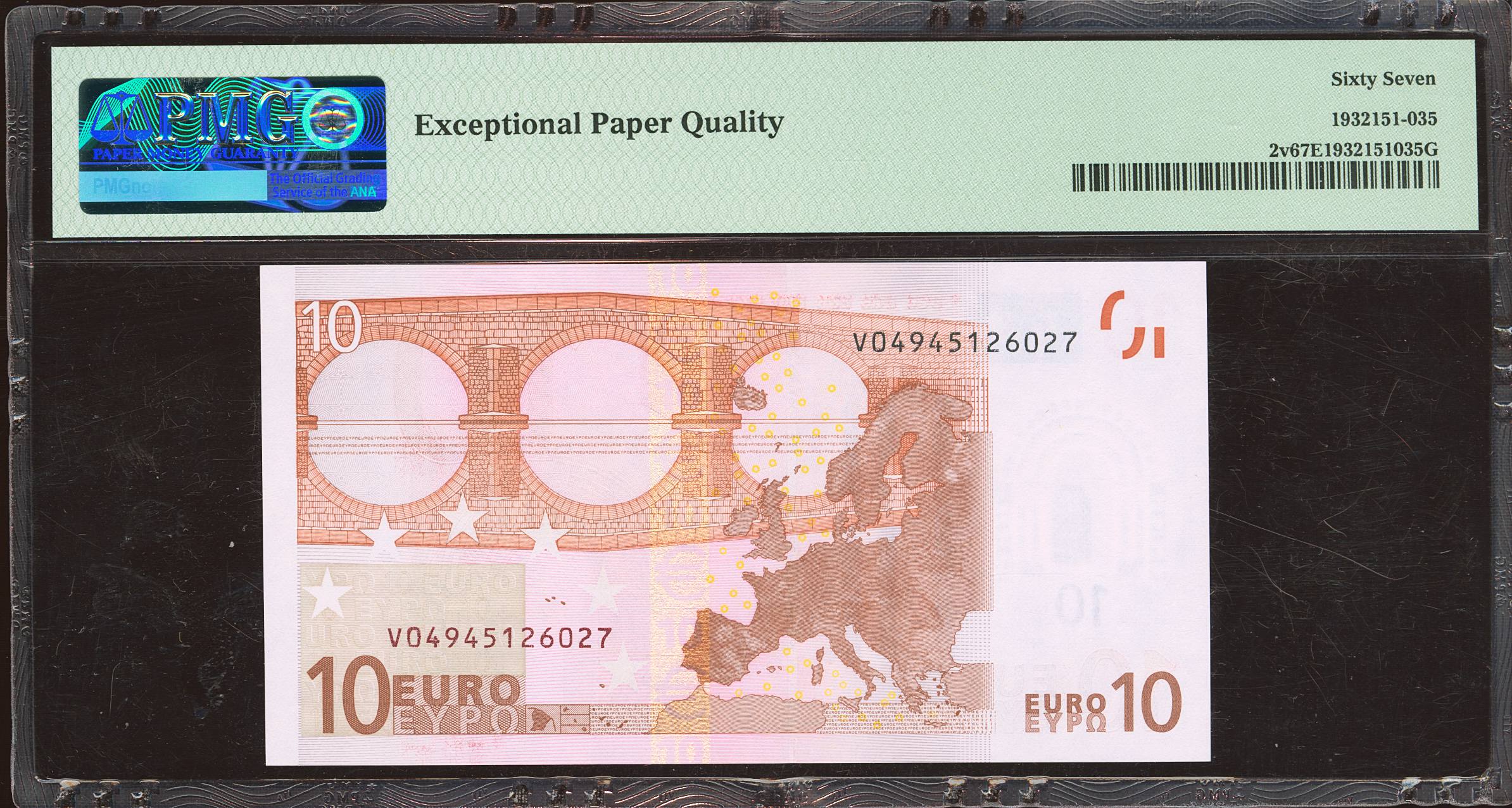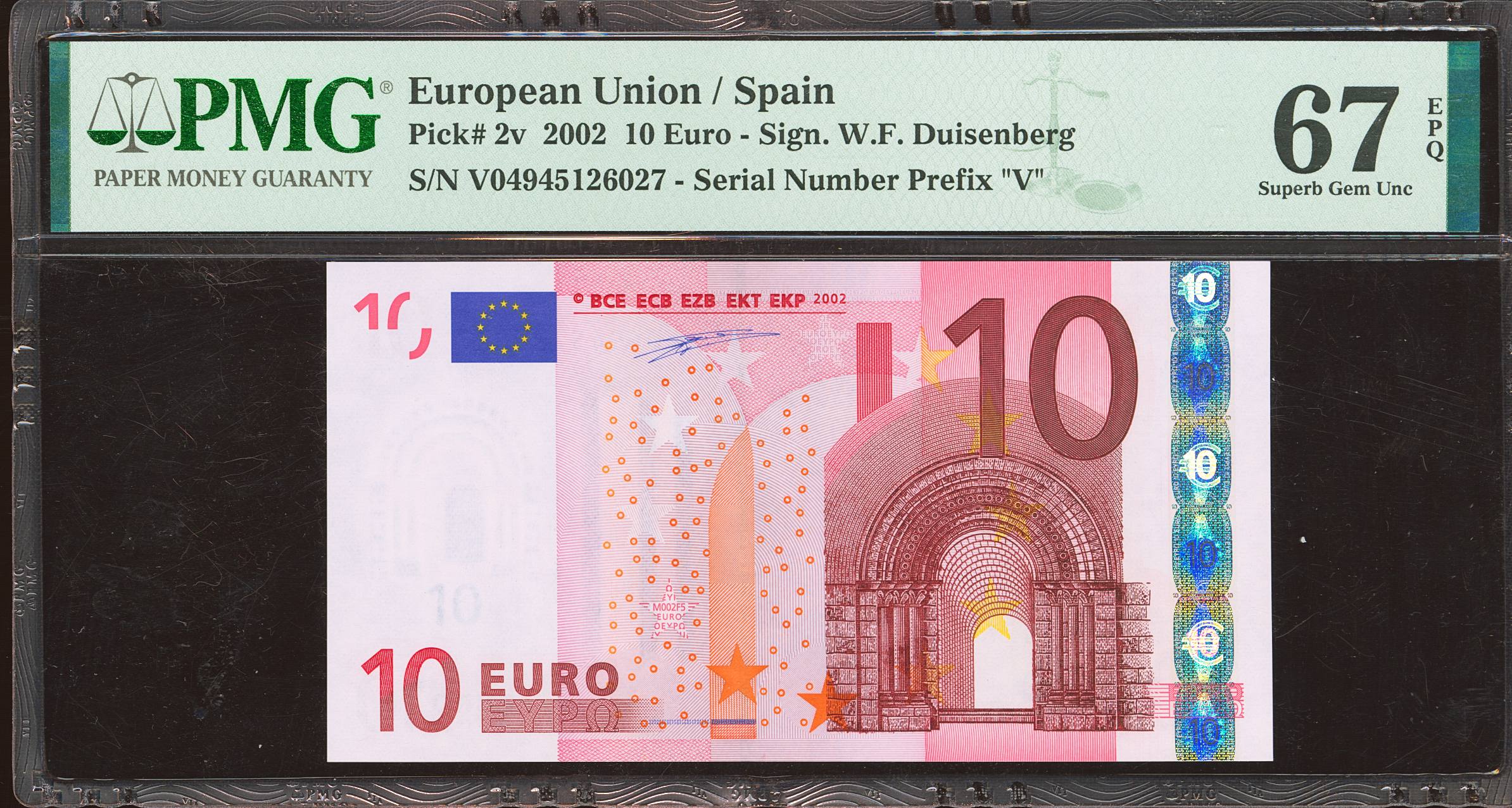 10 Euros. 1 de Enero de 2002. Firma Duisenberg. Serie V (España). (Edifil 2023: 487, Pick: 2v). SC. Encapsulado PMG67EPQ.
