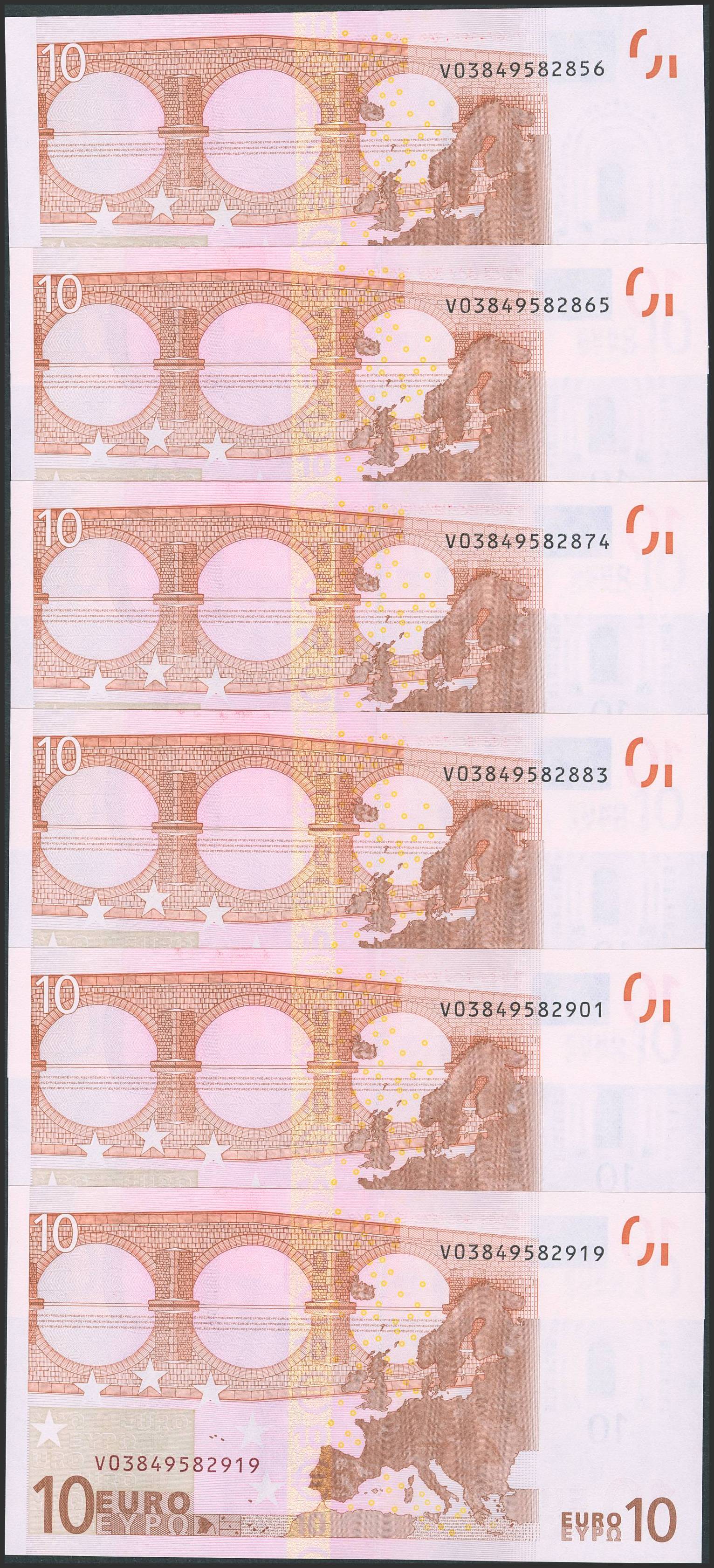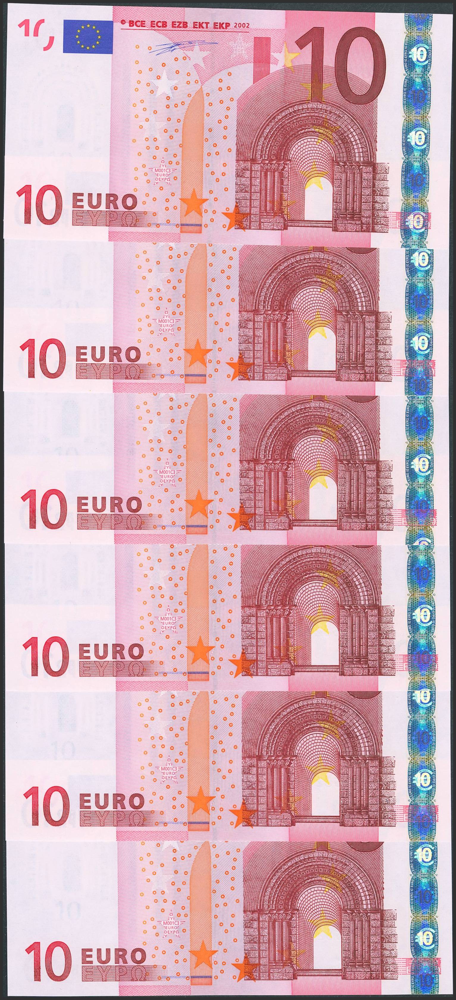 Conjunto de 4 billetes correlativos y una pareja correlativa de 10 Euros, emitidos el 1 de Enero de 2002 (cabe recordar que el último dígito de la numeración de todos los billetes denominados en euros es para control interno del Banco Central Europeo, el que marca la correlatividad de los billetes es el penúltimo dígito) con la Firma Duisenberg y la serie V (España). (Edifil 2023: 487). SC.